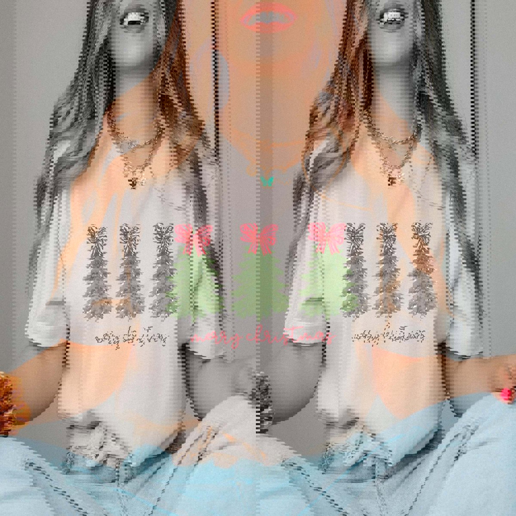Bella Graphic Tee Watercolor trees topped with candy-stripe bows for a feminine, festive look. Soft Bella + Canvas fabric, unisex fit; White, Ash, Natural, or Pink. A cheerful Christmas graphic tee for every holiday moment. Ships in 3-4 business days from Plainfield, IL. Designs printed direct to garment.