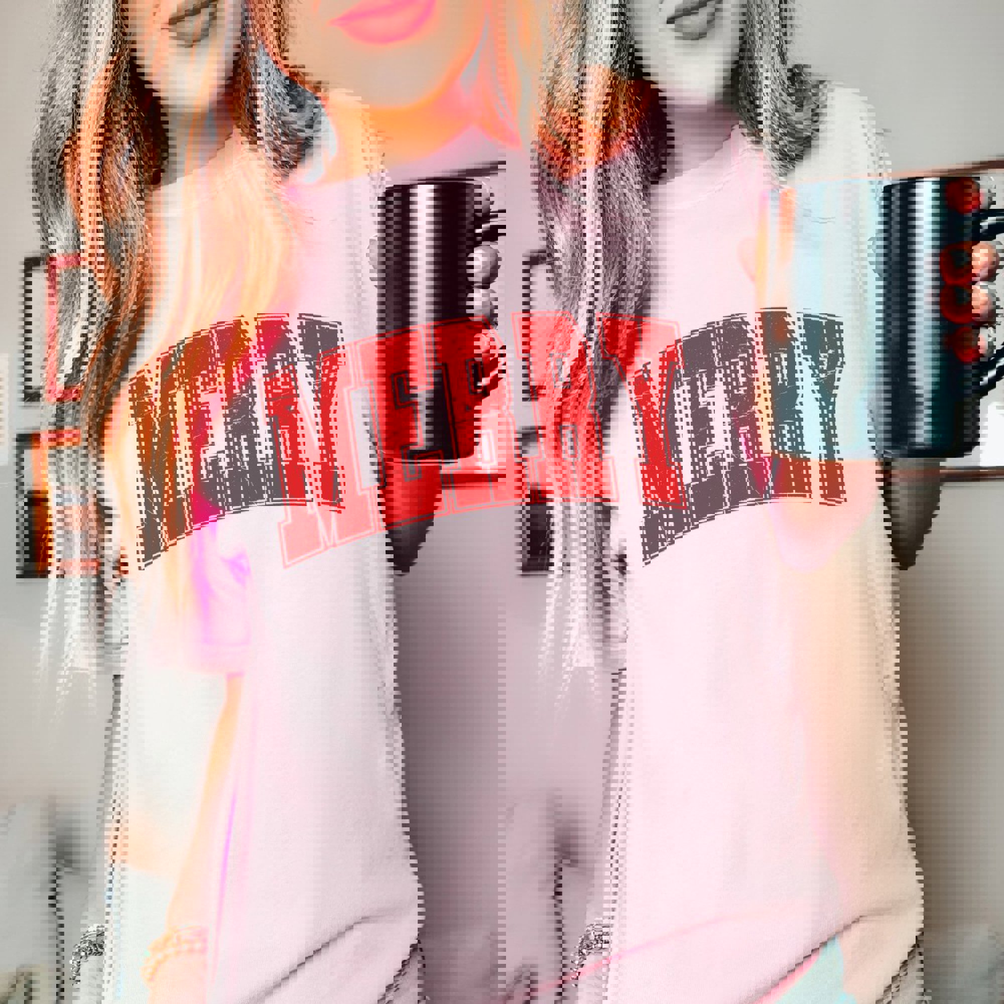 Comfort Colors Tee Oversized varsity “MERRY” with a lightly distressed finish for a vintage collegiate look. Premium Comfort Colors cotton, relaxed unisex fit; Ivory, Blossom, or White. A holiday staple that pairs with denim or plaid. Ships in 3-4 business days from Plainfield, IL. Designs printed direct to garment.