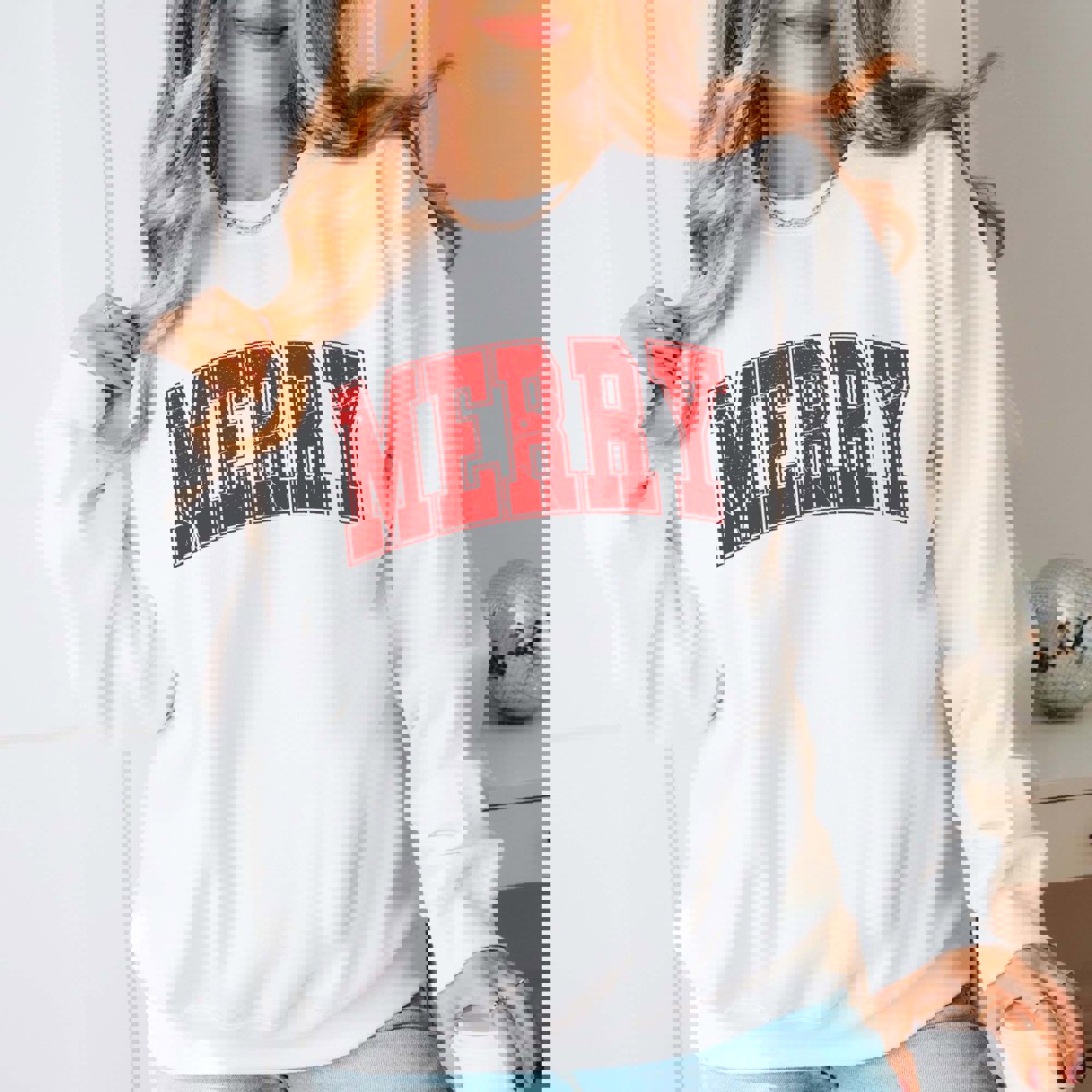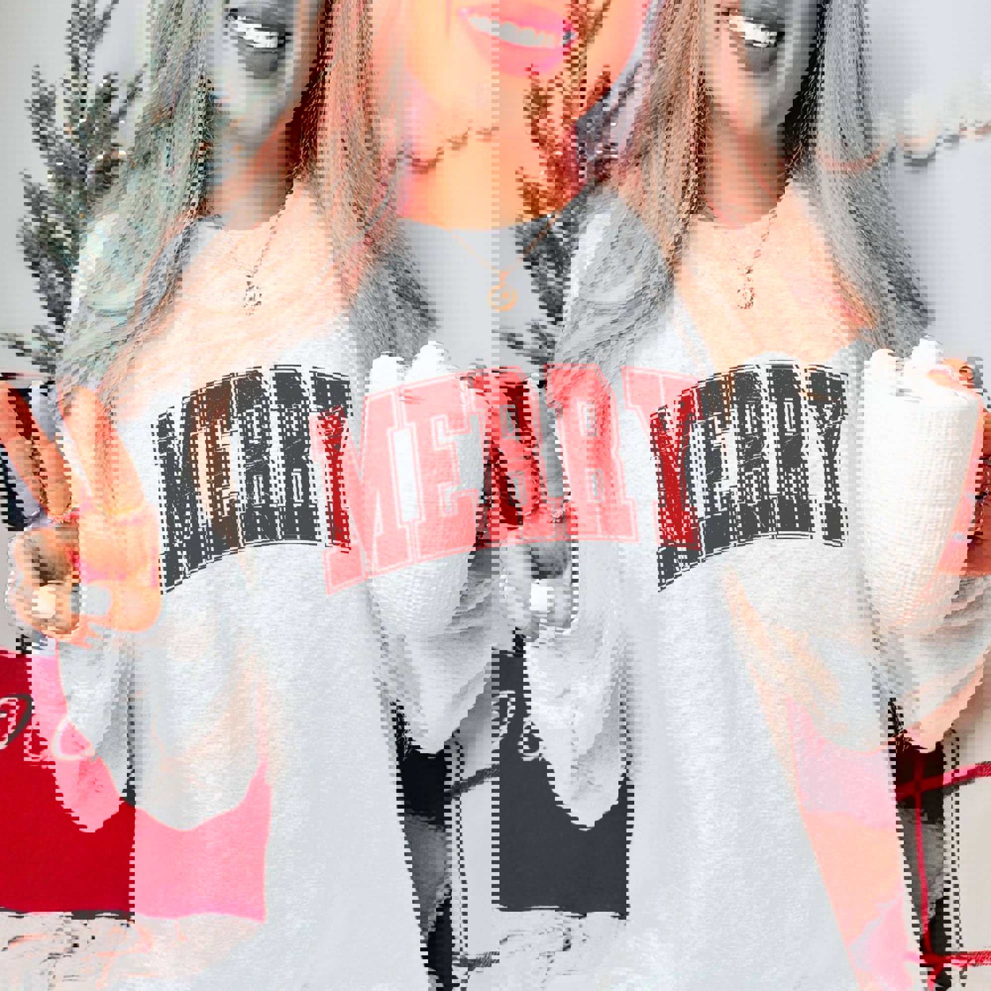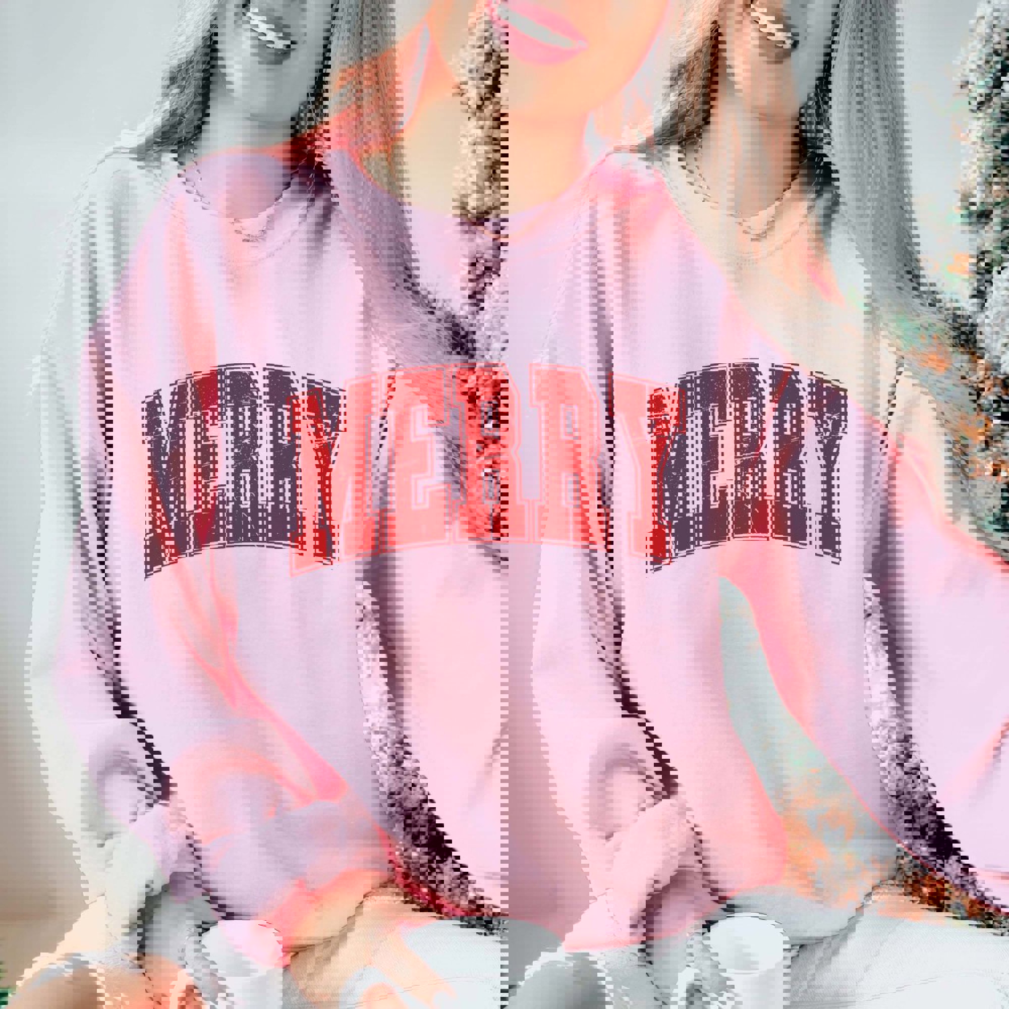 Graphic Sweatshirt Distressed collegiate “MERRY” lettering on cozy fleece for a timeless varsity holiday look. Unisex crew; White, Pink, or Ash Grey. A best-selling Christmas sweatshirt that dresses up or down. Ships in 3-4 business days from Plainfield, IL. Designs printed direct to garment.