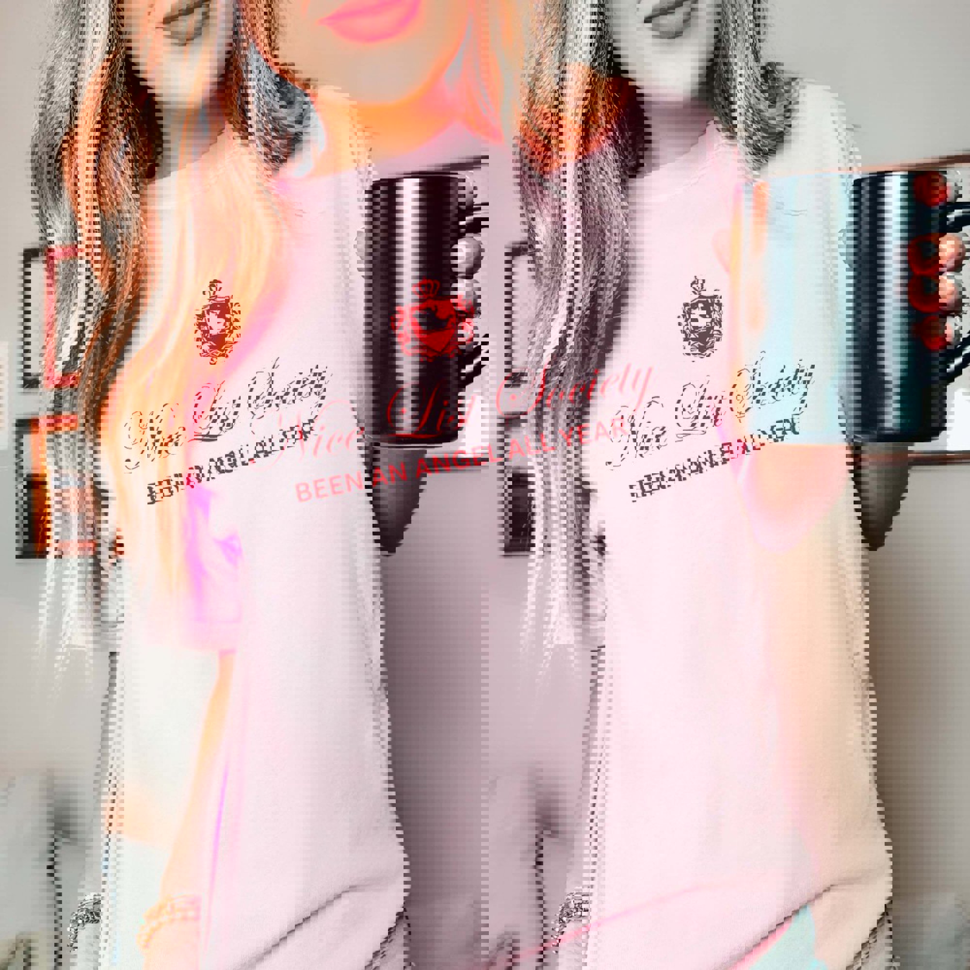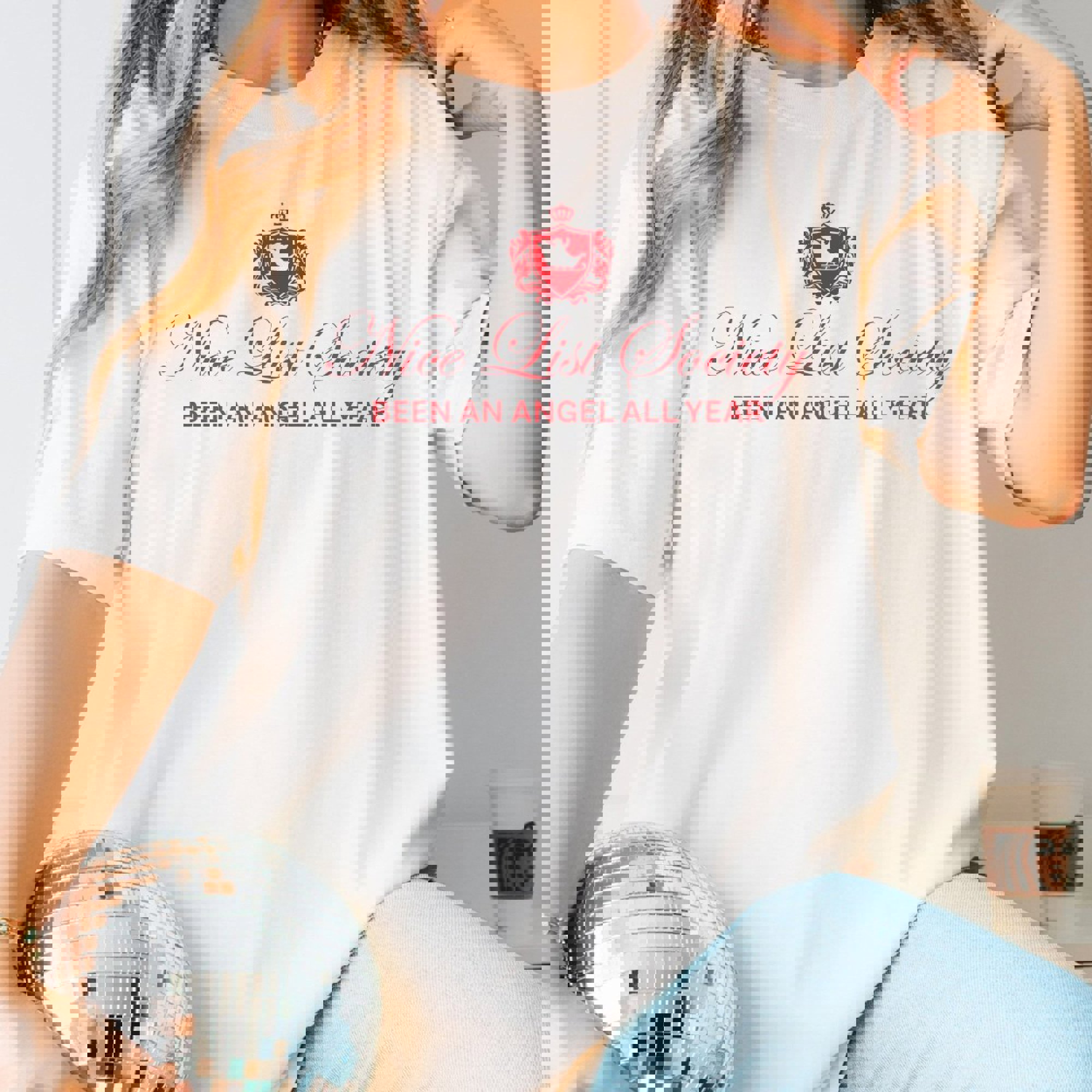 Comfort Colors Tee Playful “Been an Angel All Year” graphic on premium, heavyweight Comfort Colors cotton. A tongue-in-cheek women’s Christmas shirt with a relaxed unisex fit; Blossom, White, or Ivory. Ships in 3-4 business days from Plainfield, IL. Designs printed direct to garment.