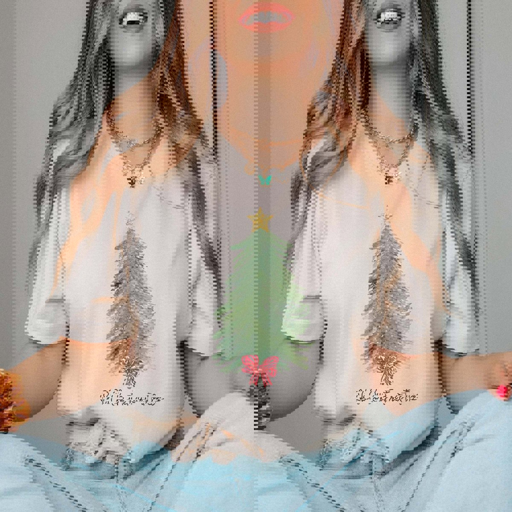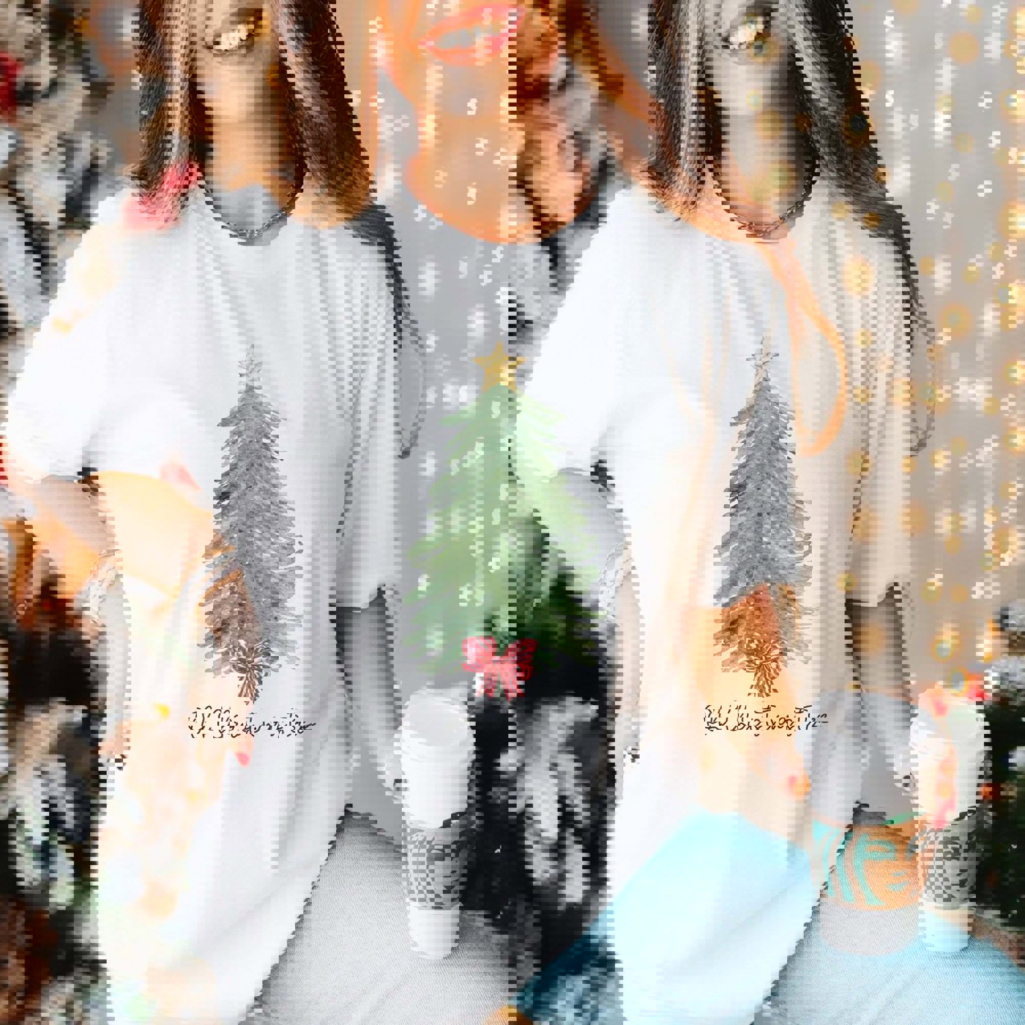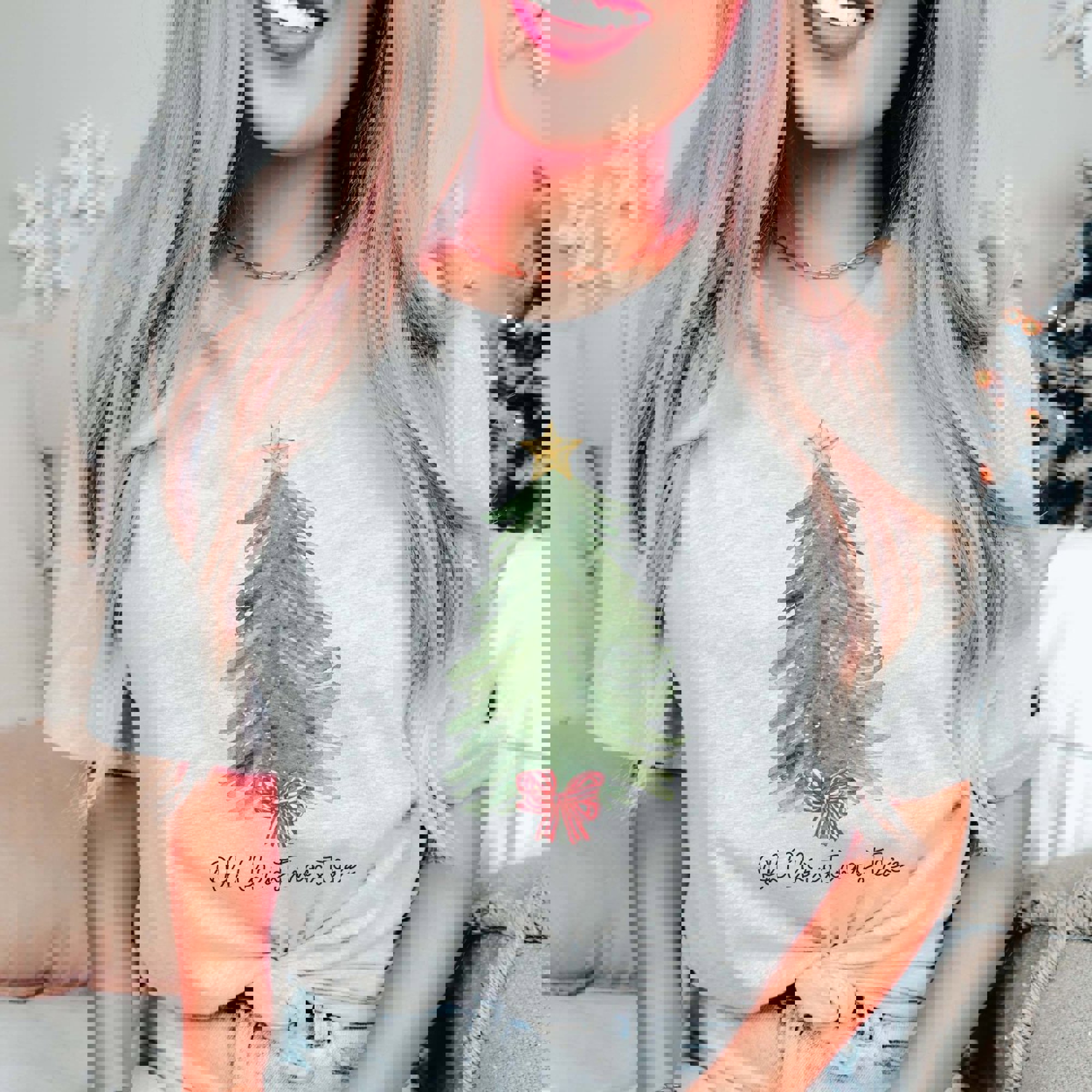 Bella Graphic Tee A hand-painted tree with star and striped bow brings cozy, traditional holiday vibes to this Bella + Canvas Christmas tee. Ash, Natural, Pink, or White; unisex fit. Ships in 3-4 business days from Plainfield, IL. Designs printed direct to garment.