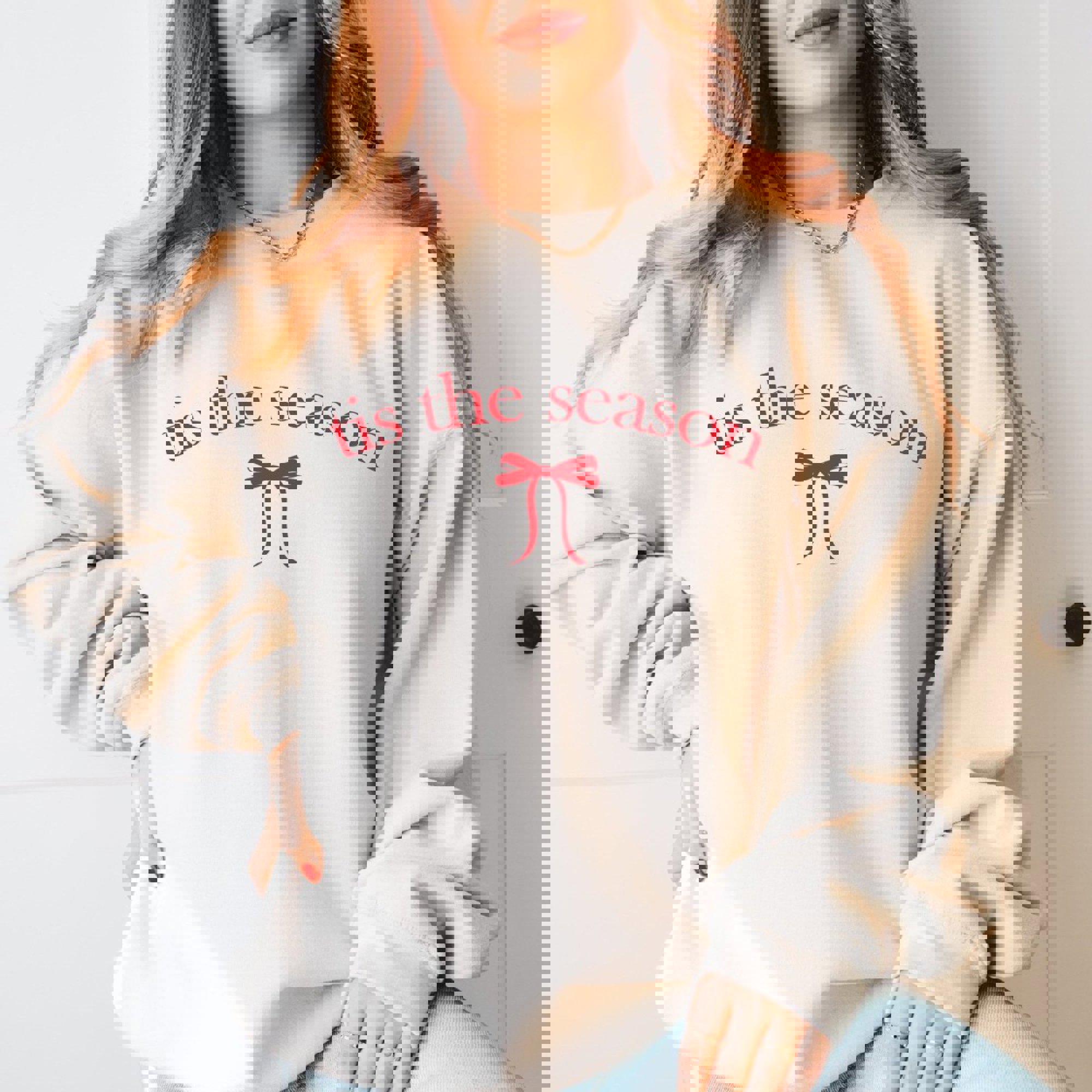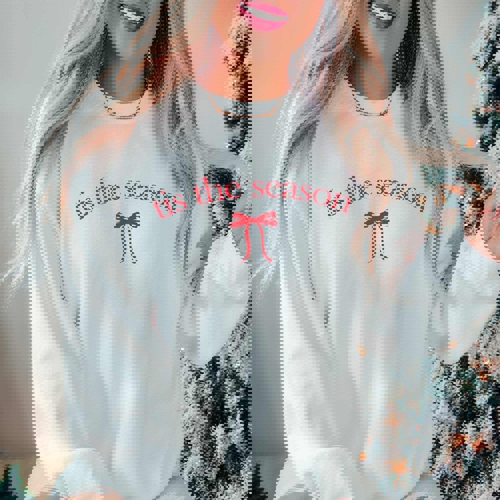 Graphic Sweatshirt Simple and sweet with a pink bow and timeless holiday script on ultra-cozy fleece. Unisex crew; White, Sand, or Ash Grey. A neutral Christmas sweatshirt that styles with everything. Ships in 3-4 business days from Plainfield, IL. Designs printed direct to garment.