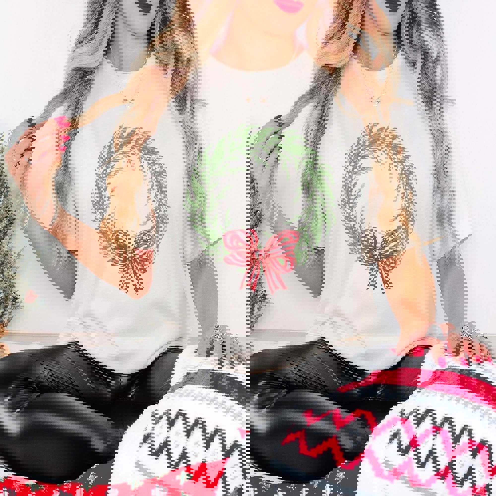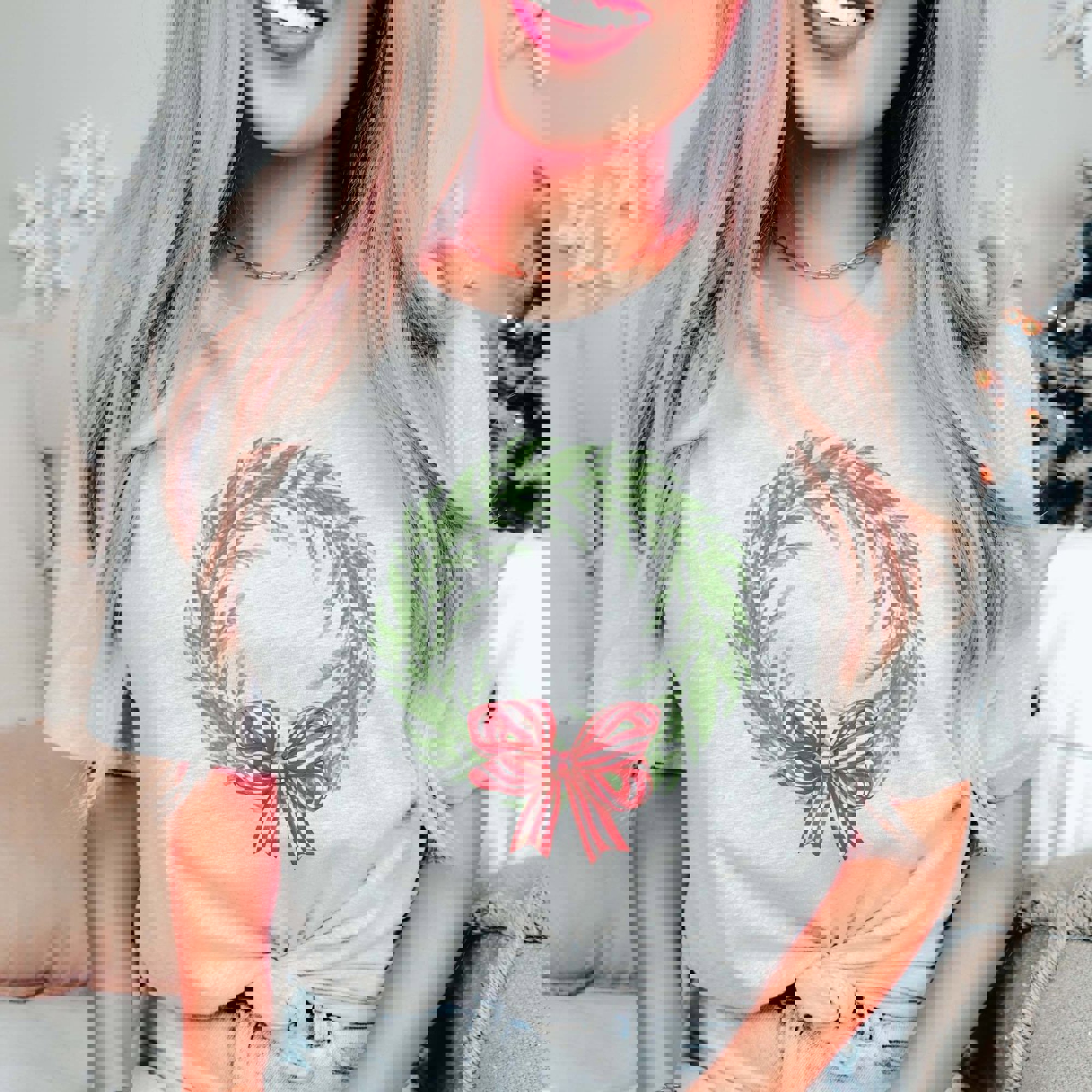 Bella Graphic Tee Hand-painted wreath and striped bow for classic holiday style on a buttery-soft Bella + Canvas tee. A perfect Christmas shirt for photos, events, and casual days. Ash, Natural, Pink, or White; unisex fit. Ships in 3-4 business days from Plainfield, IL. Designs printed direct to garment.