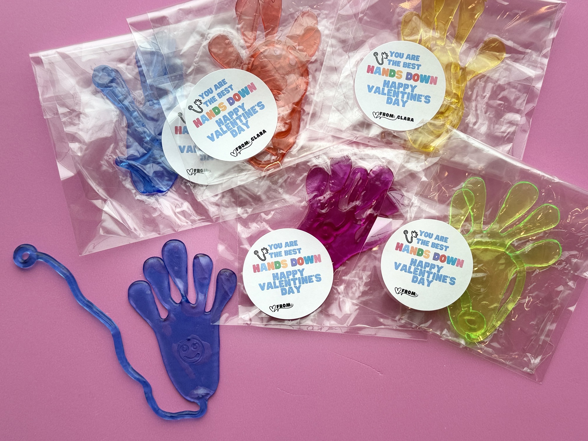 Sticky Hands Class Valentine favor personalized with Stickers, Valentine Favor for school handout, Non-Sugar gift for preschool kindergarten