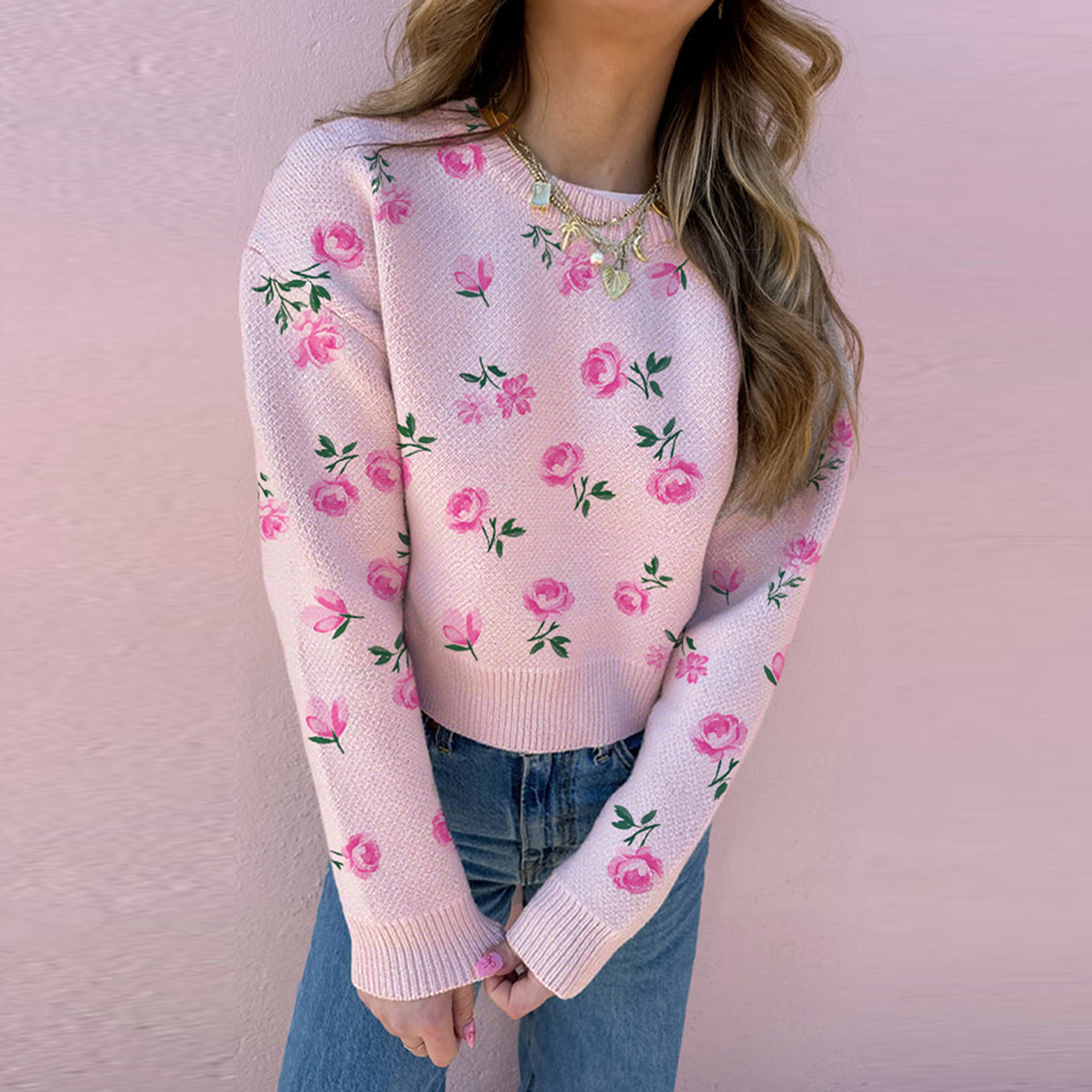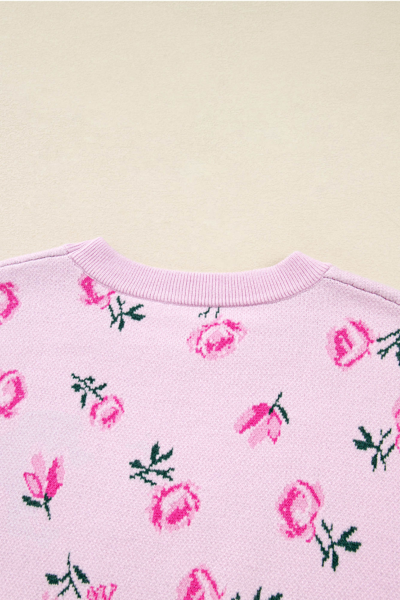 Soft, sweet, and irresistibly charming this pink floral sweater brings the romance. Featuring scattered rose patterns, a cozy knit feel, and a relaxed fit, it's the perfect blend of feminine and casual. Dress it up with a skirt or keep it cute with denim either way, it blooms. Material: 52% Viscose, 26% Polyester, 22% Polyamide