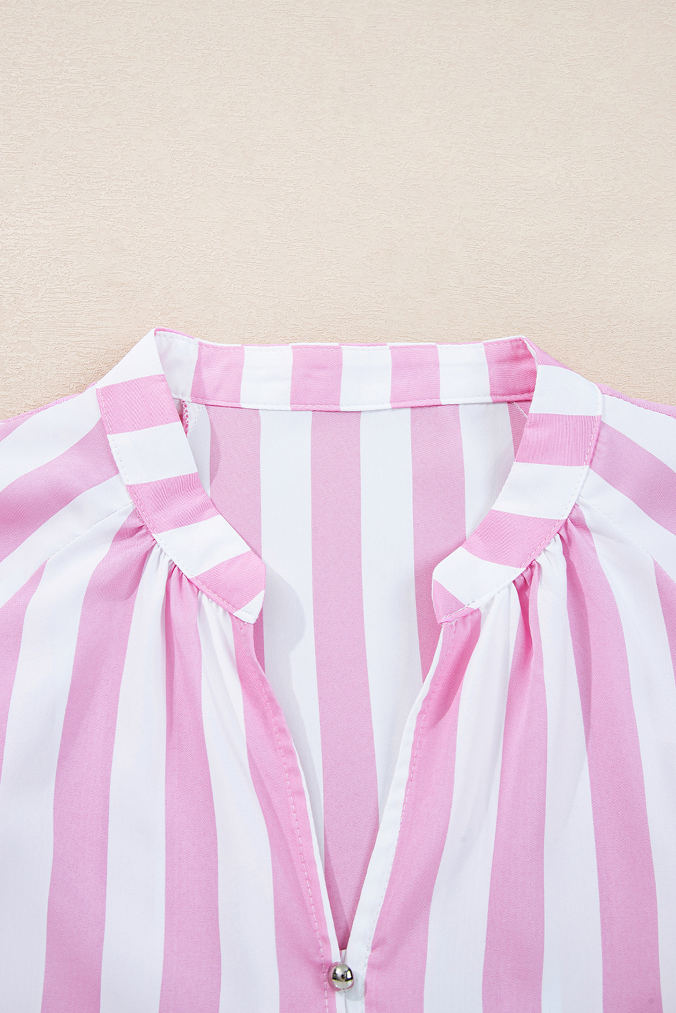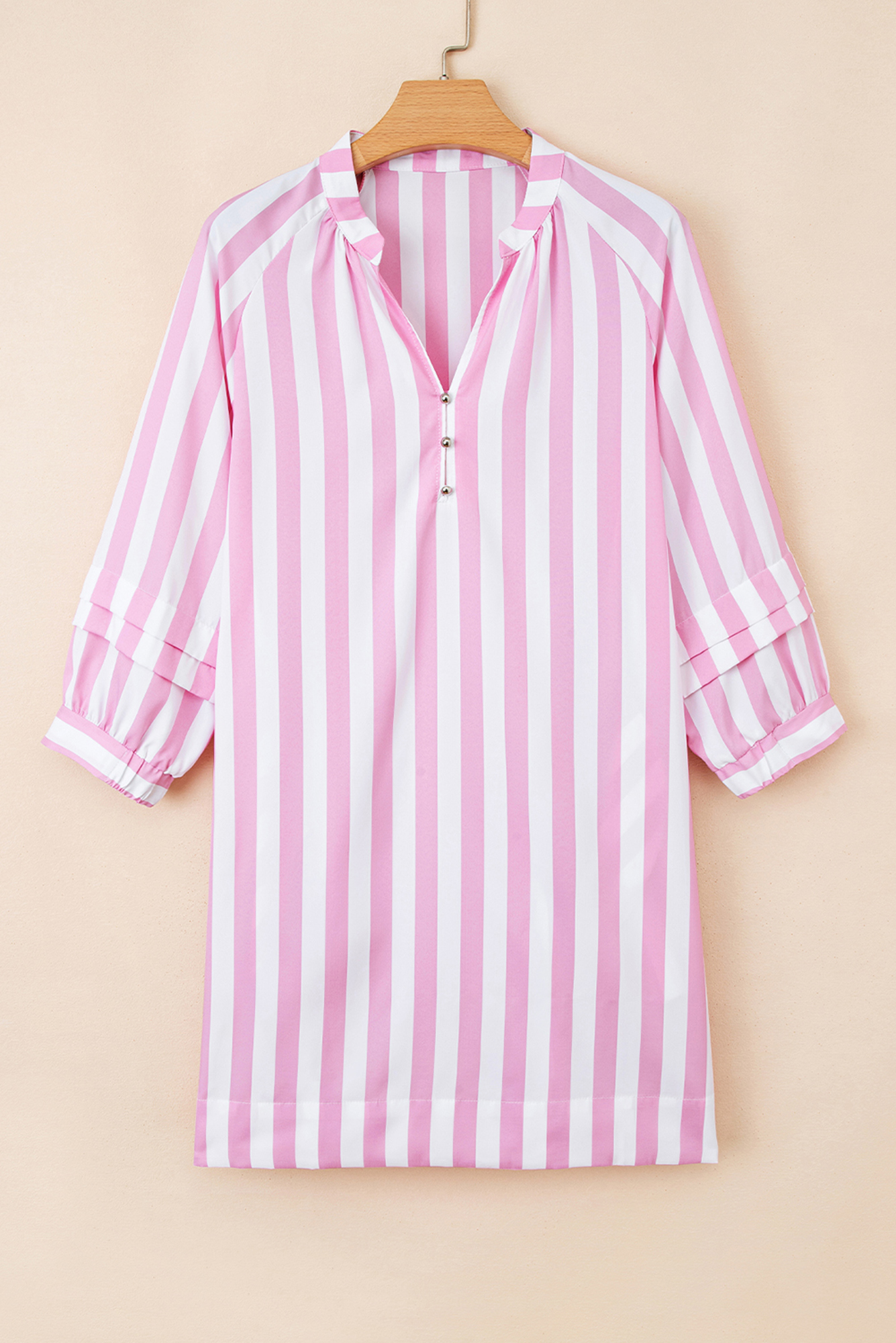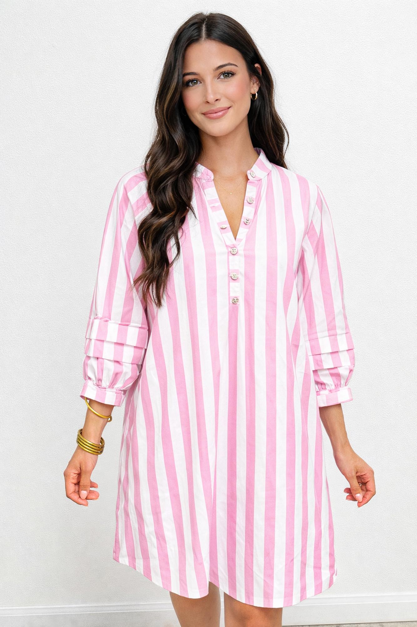 This playful pink-and-white striped mini dress features a soft, lightweight cotton fabric with a classic button-front placket and pearl buttons. Romantic ruffled high collar, deep V-neckline, voluminous balloon sleeves with tie cuffs, and tiered ruffle detailing at the cuffs create feminine volume. Relaxed, flowy fit with a hi-lo hem offers effortless movement. Perfect for summer days, beach vacations, or casual brunches�pair with sandals and gold jewelry for sweet, sunny style. Material: 100% Polyester