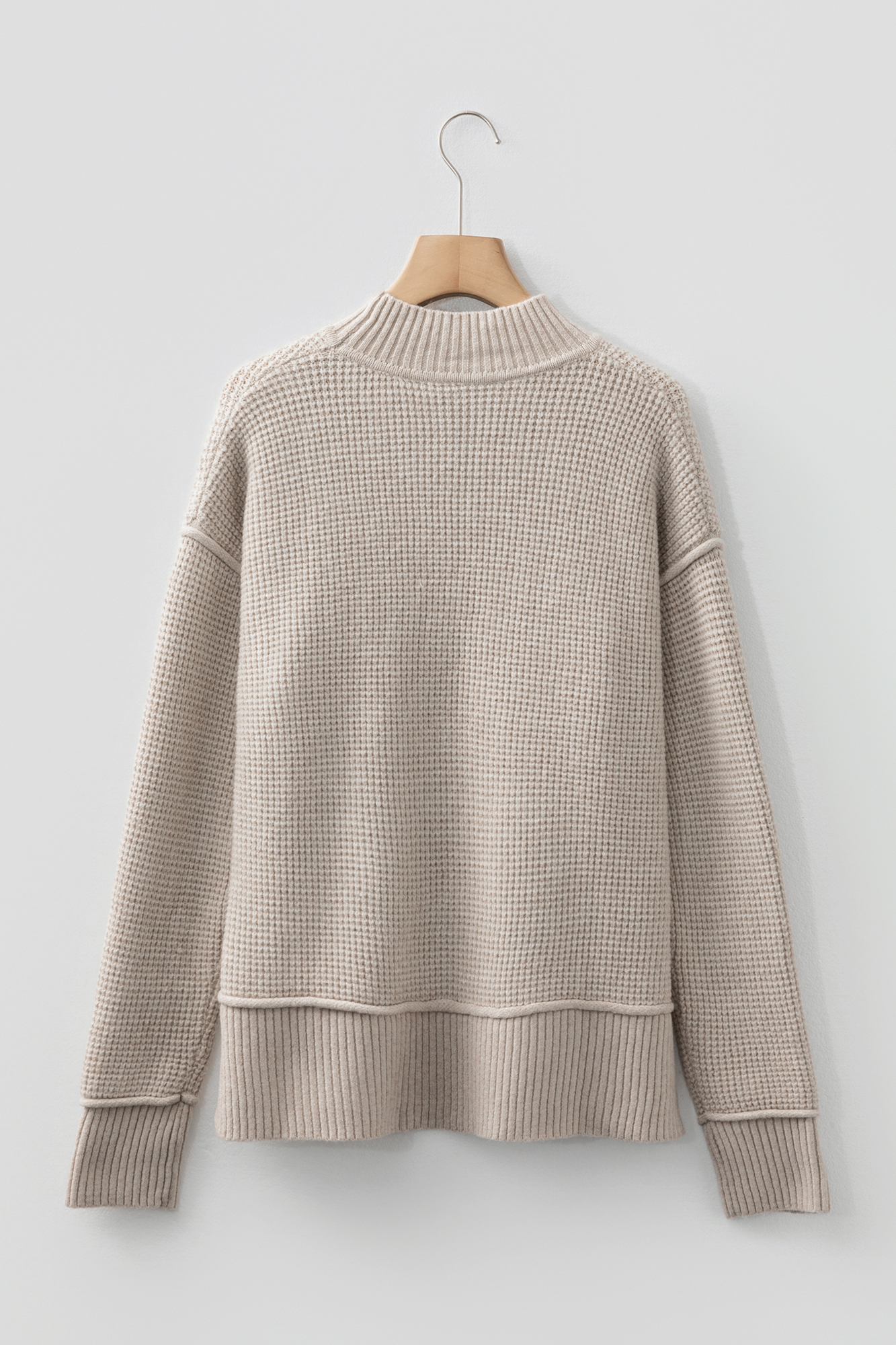 Wrap yourself in effortless comfort with this ultra-soft waffle knit sweater. Featuring a relaxed silhouette, ribbed mockneck, extended cuffs, and a subtle stepped hem for a modern finish. Perfect for layering, lounging, or elevating your everyday denim looks with timeless ease. Material: 75% Polyester, 20%Acrylic, 5% Polyamide