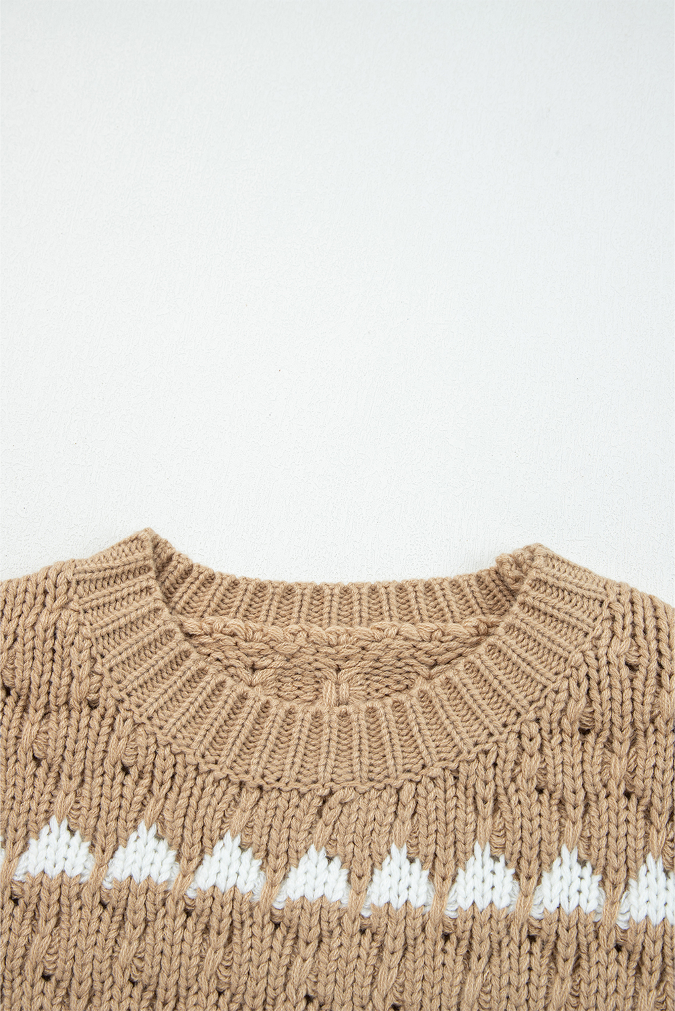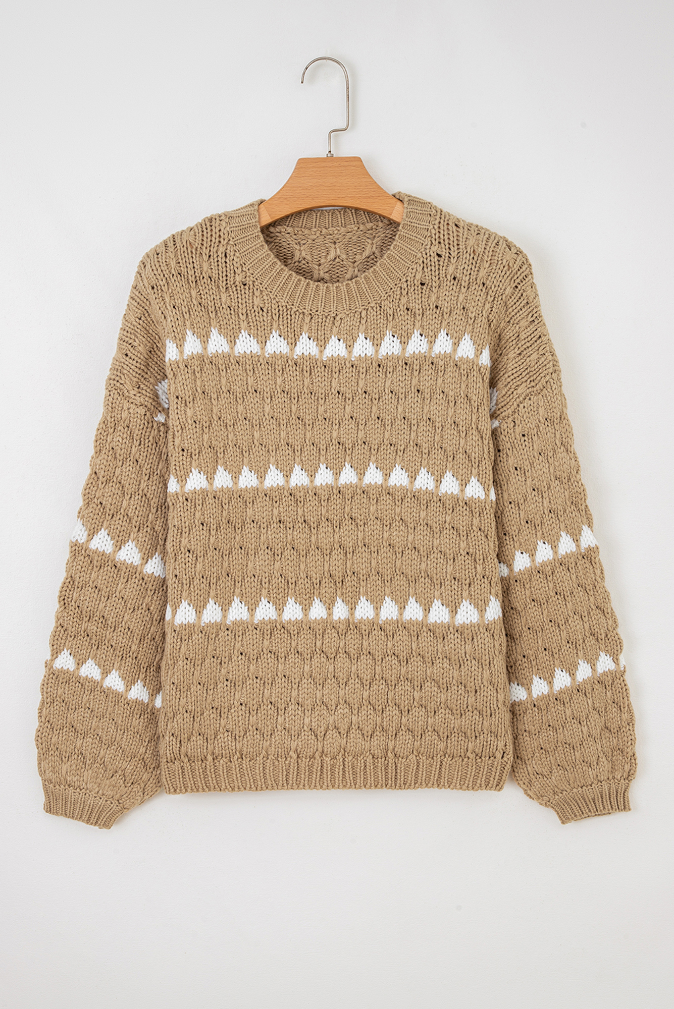 A warm, textured knit sweater featuring soft cable stitching and charming triangle stripe accents. Designed with a relaxed fit, ribbed neckline, cuffs, and hem for effortless comfort. Perfect for cozy days, casual outings, and layered fall-to-winter looks. Material: 100% Acrylic