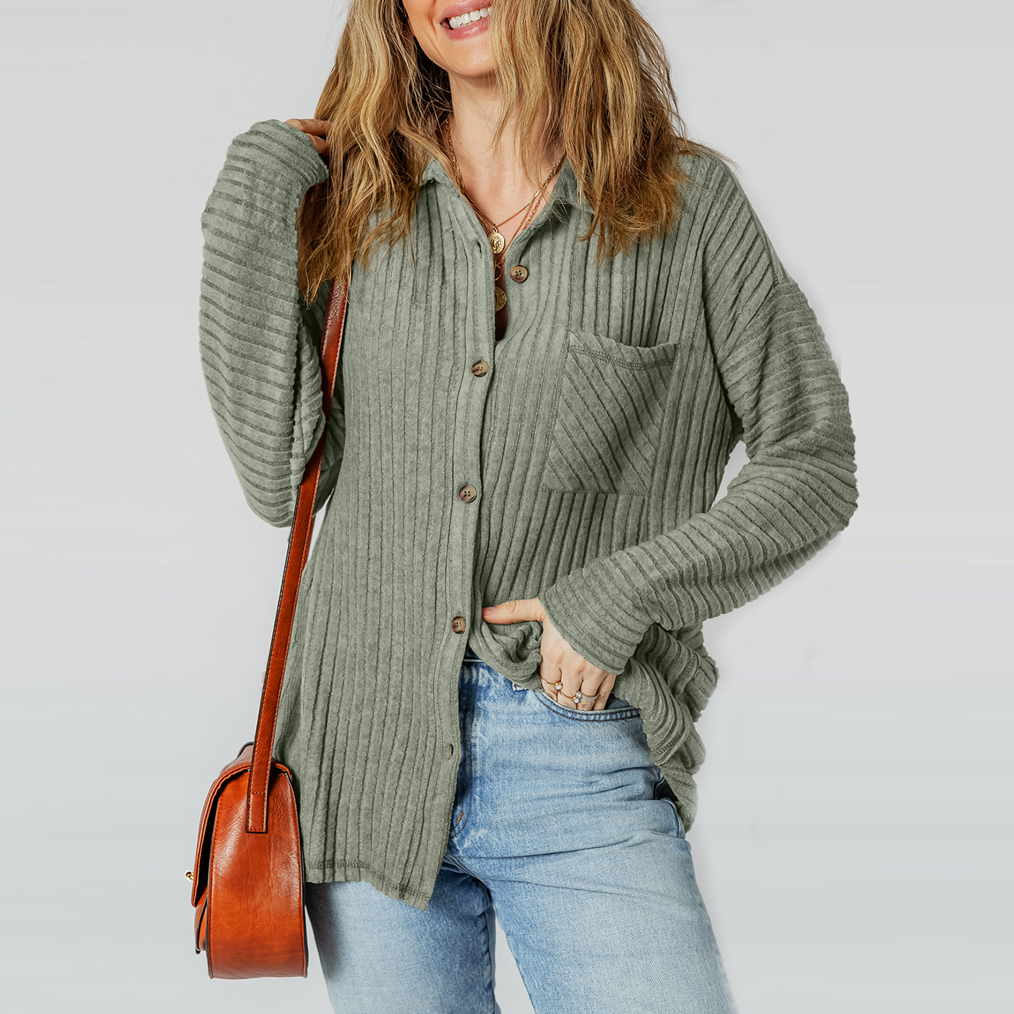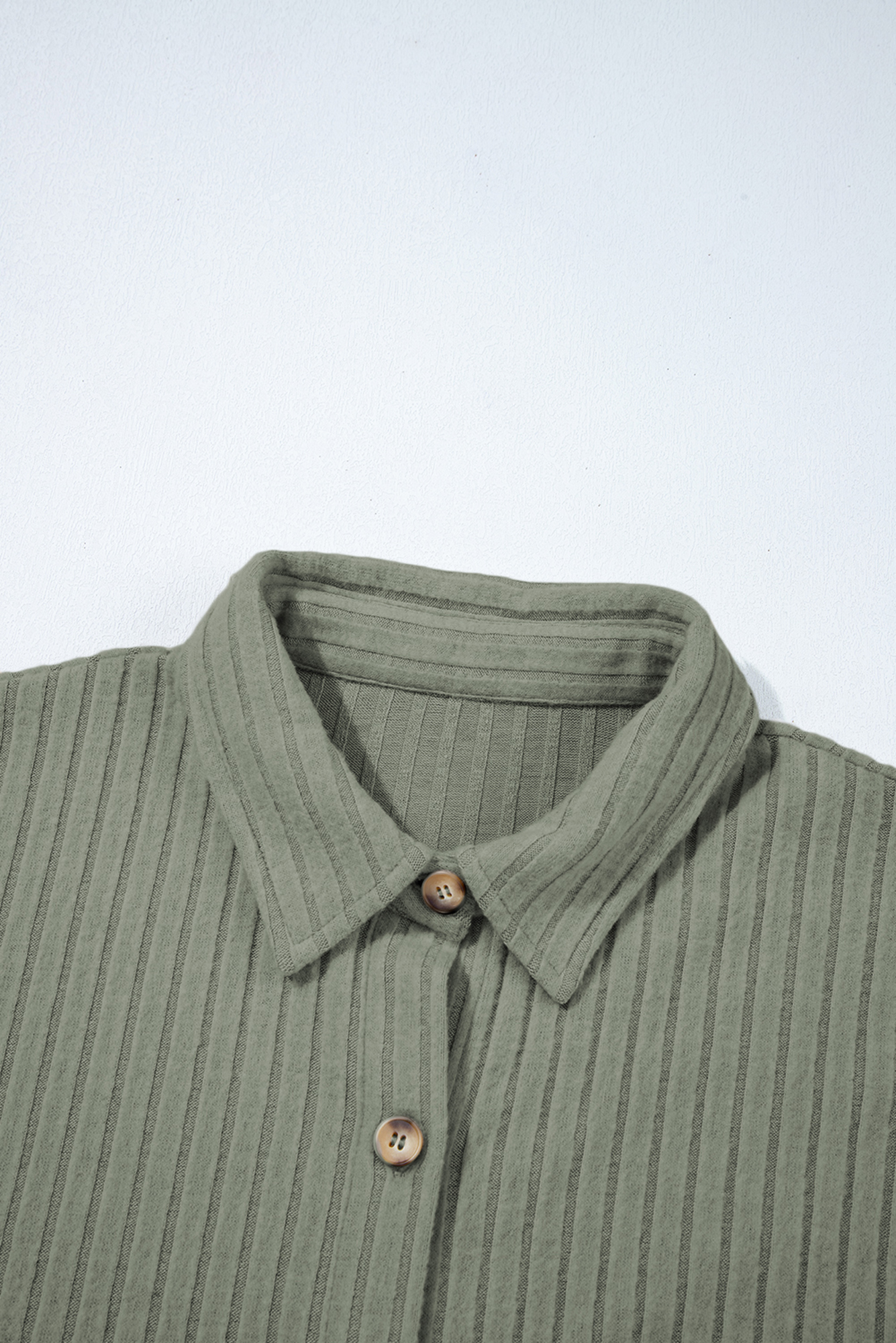 Stay effortlessly cool in this ribbed button-up top featuring a soft, textured feel and relaxed silhouette. The front pocket adds casual charm, while the sage hue makes pairing easy. Wear open as a lightweight layer or buttoned as a cozy staple�perfect for denim, boots, and everyday comfort. Material: 75% Polyester, 20% Viscose, 5% Elastane
