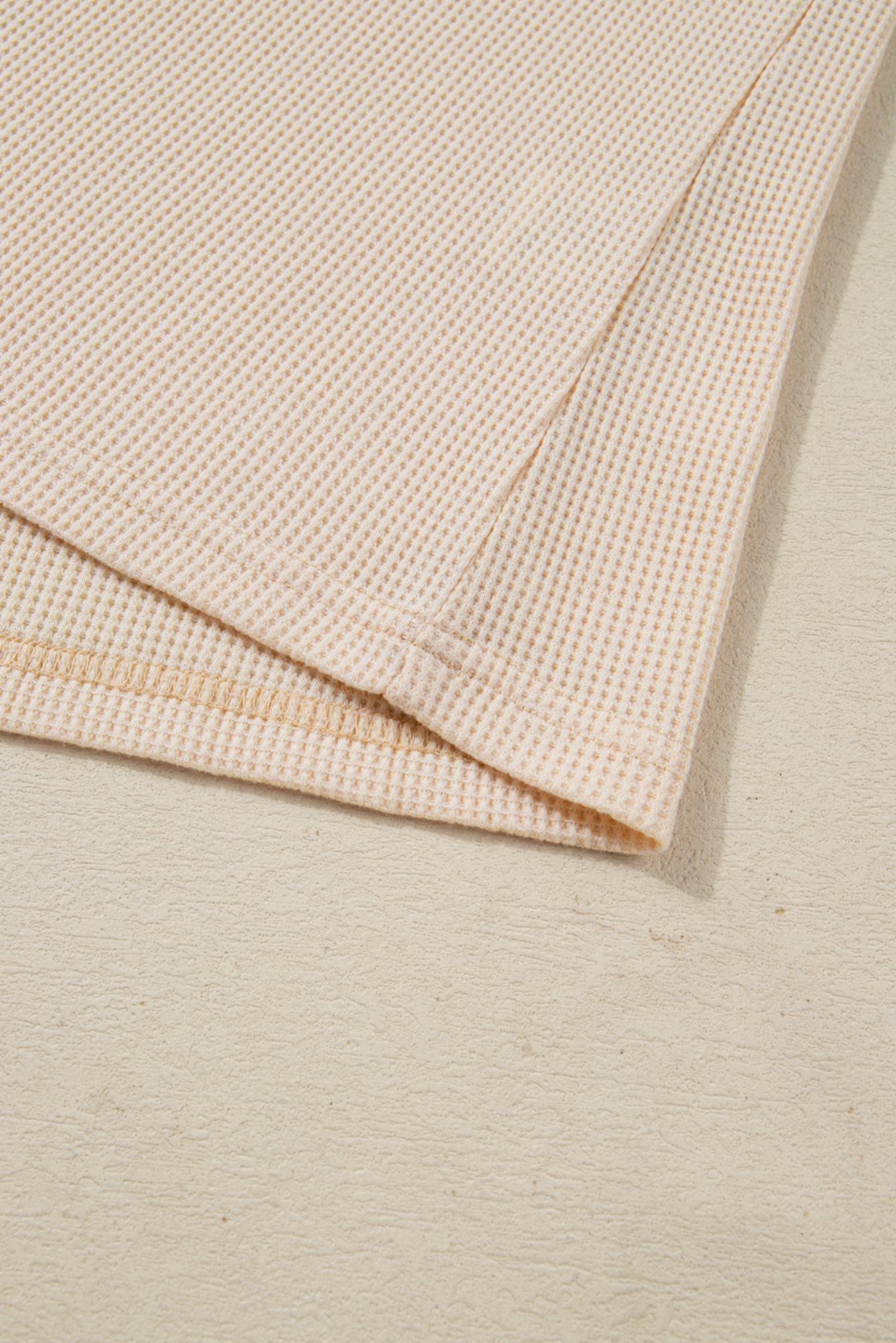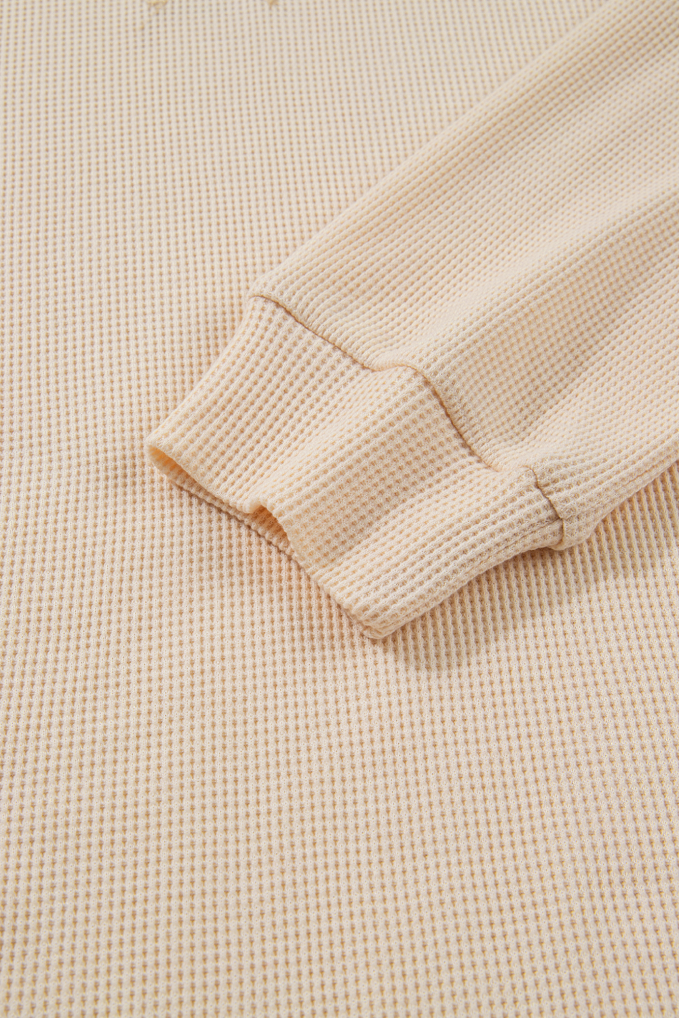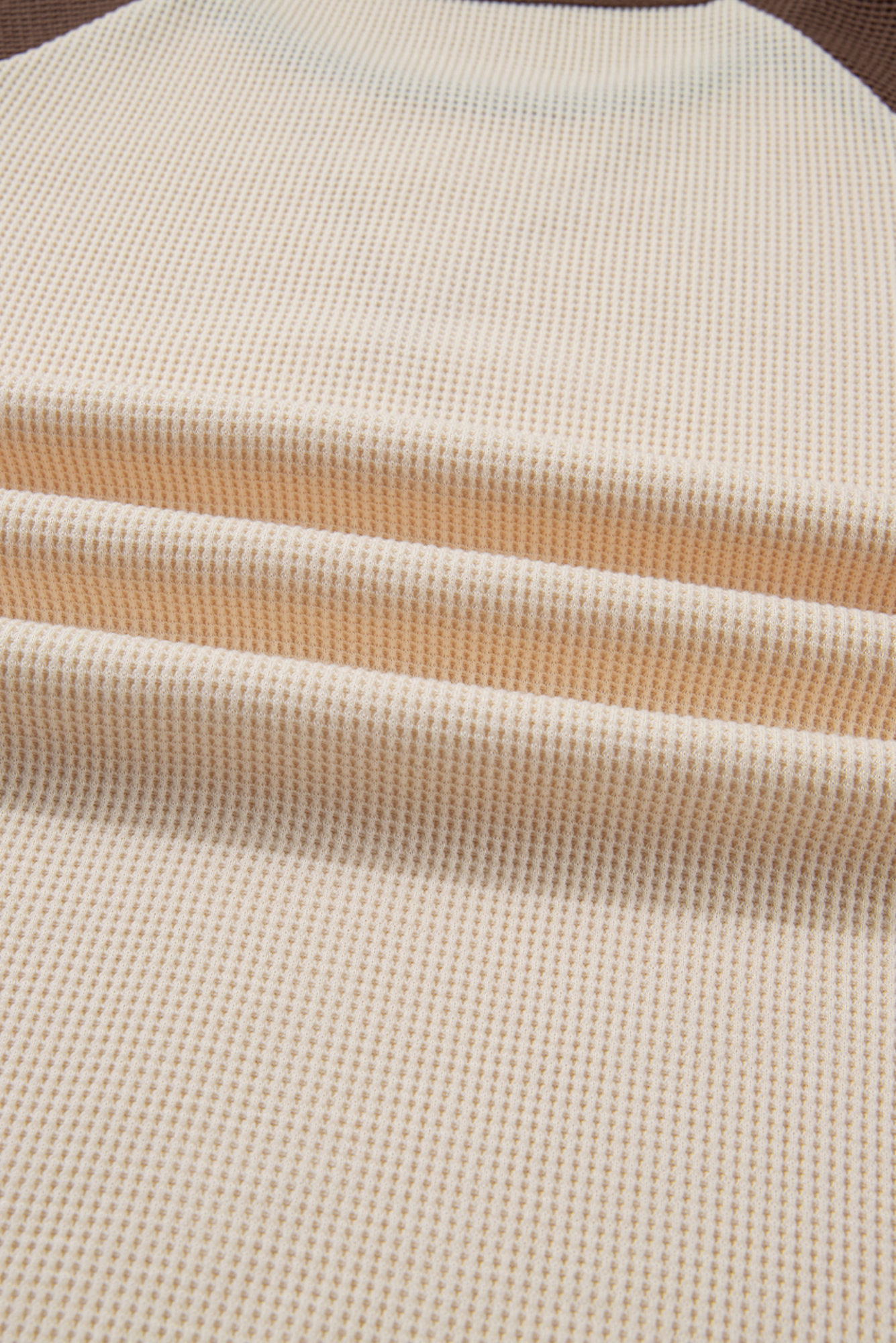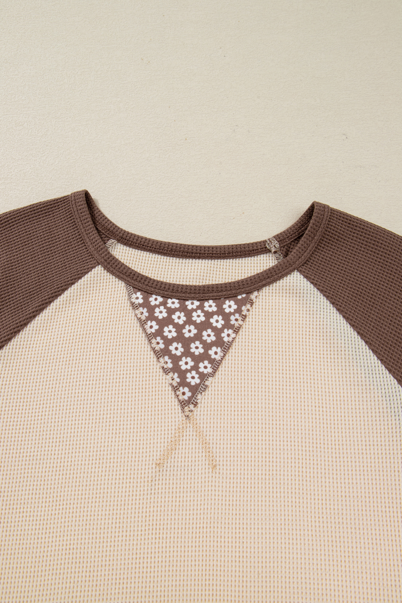 A cozy-meets-cute essential made for everyday comfort. This waffle-knit thermal features contrast raglan sleeves, a soft floral inset detail, and relaxed fit that layers beautifully. Perfect for casual days, coffee runs, or cozy fall styling with denim. Material: 75% Polyester, 25% Cotton