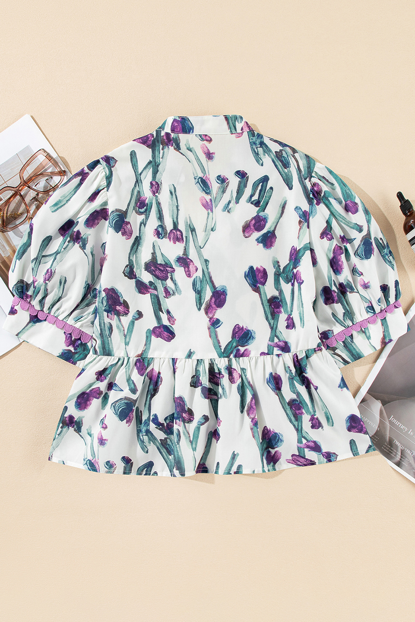 This airy blouse features a soft ivory base hand-painted with bold teal stems and vibrant purple irises accented by pops of gold foliage. Delicate scalloped ruffles in lavender and teal trim the deep V-neckline, puffed short sleeves, and peplum hem for romantic volume. Lightweight, breathable fabric with gentle gathering creates a flattering fit. Perfect for tucking into jeans or styling with tailored shorts for effortless spring-to-summer chic. Material: 100% Polyester