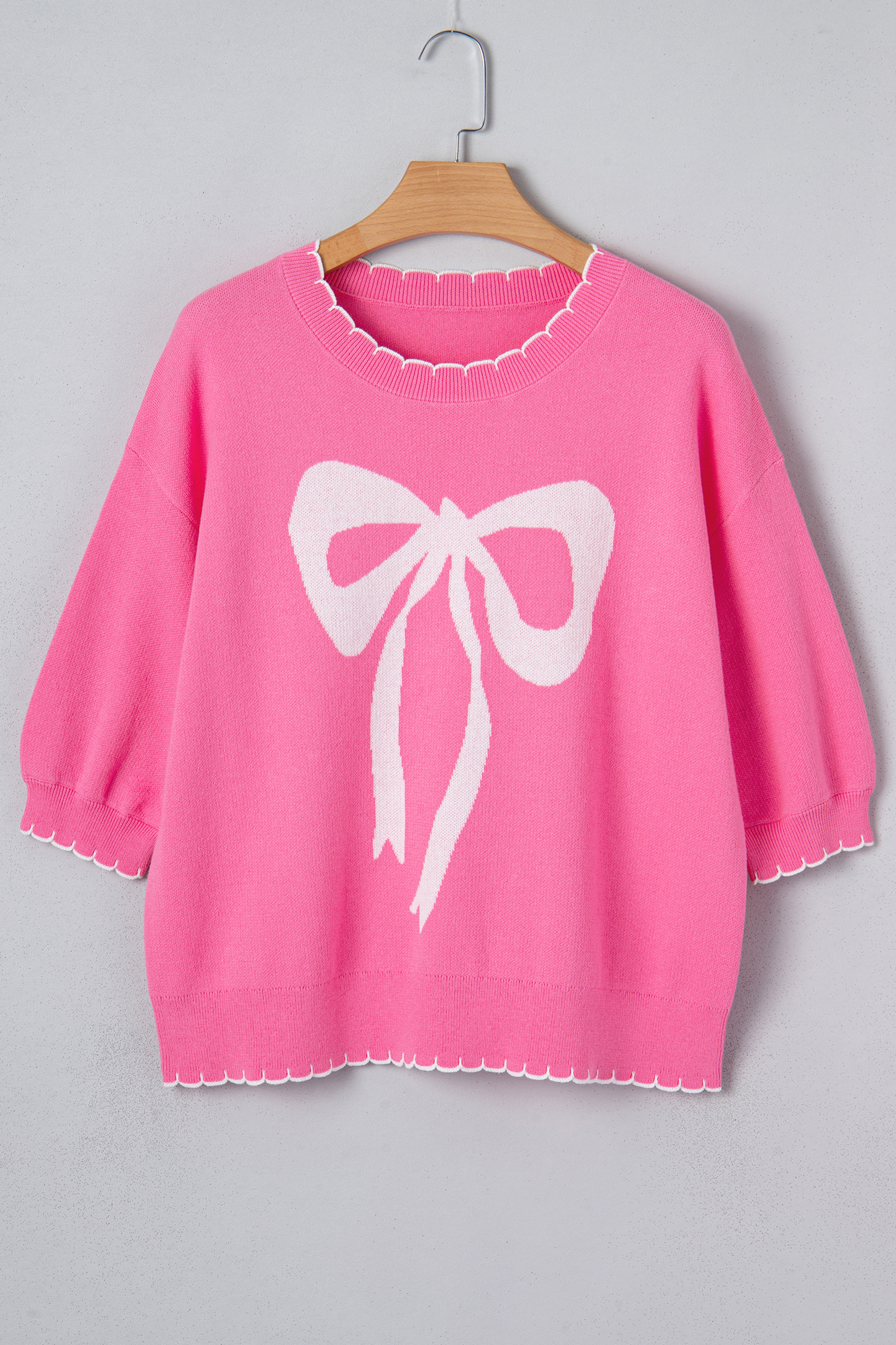 Make a bold statement with this vibrant magenta knit sweater. Featuring a large white bow graphic and delicate white-tipped scalloped edges on the collar, cuffs, and hem, this playful top offers a charming, modern look. The relaxed fit and soft texture make it as comfortable as it is cute! Material: 100%Cotton