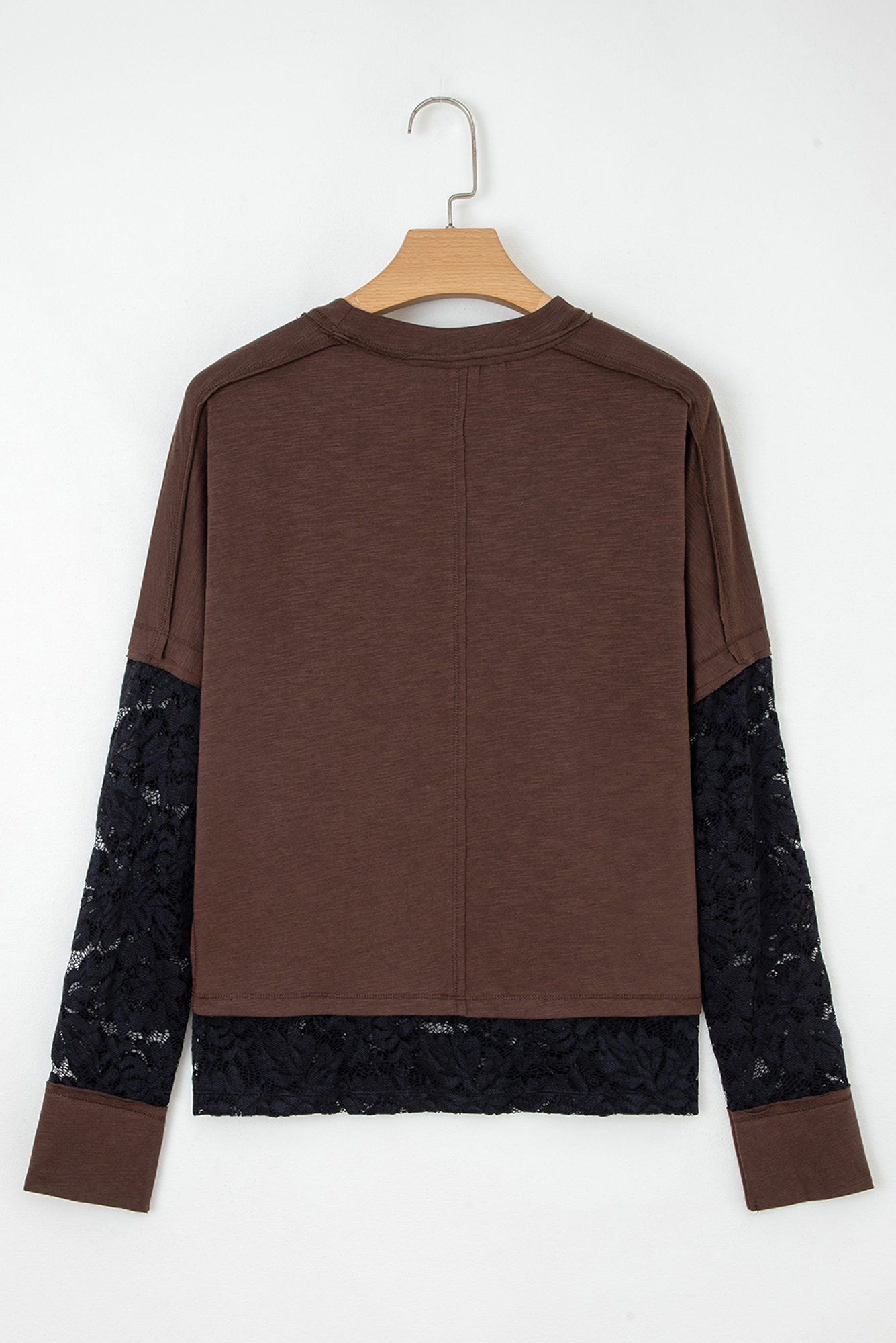 A modern layered look with a romantic twist. This mocha-toned top features a soft, drapey knit body paired with delicate black lace long sleeves and hem for built-in dimension. Effortlessly chic on its own�no layering required. Material: 65% Polyester, 35% Cotton
