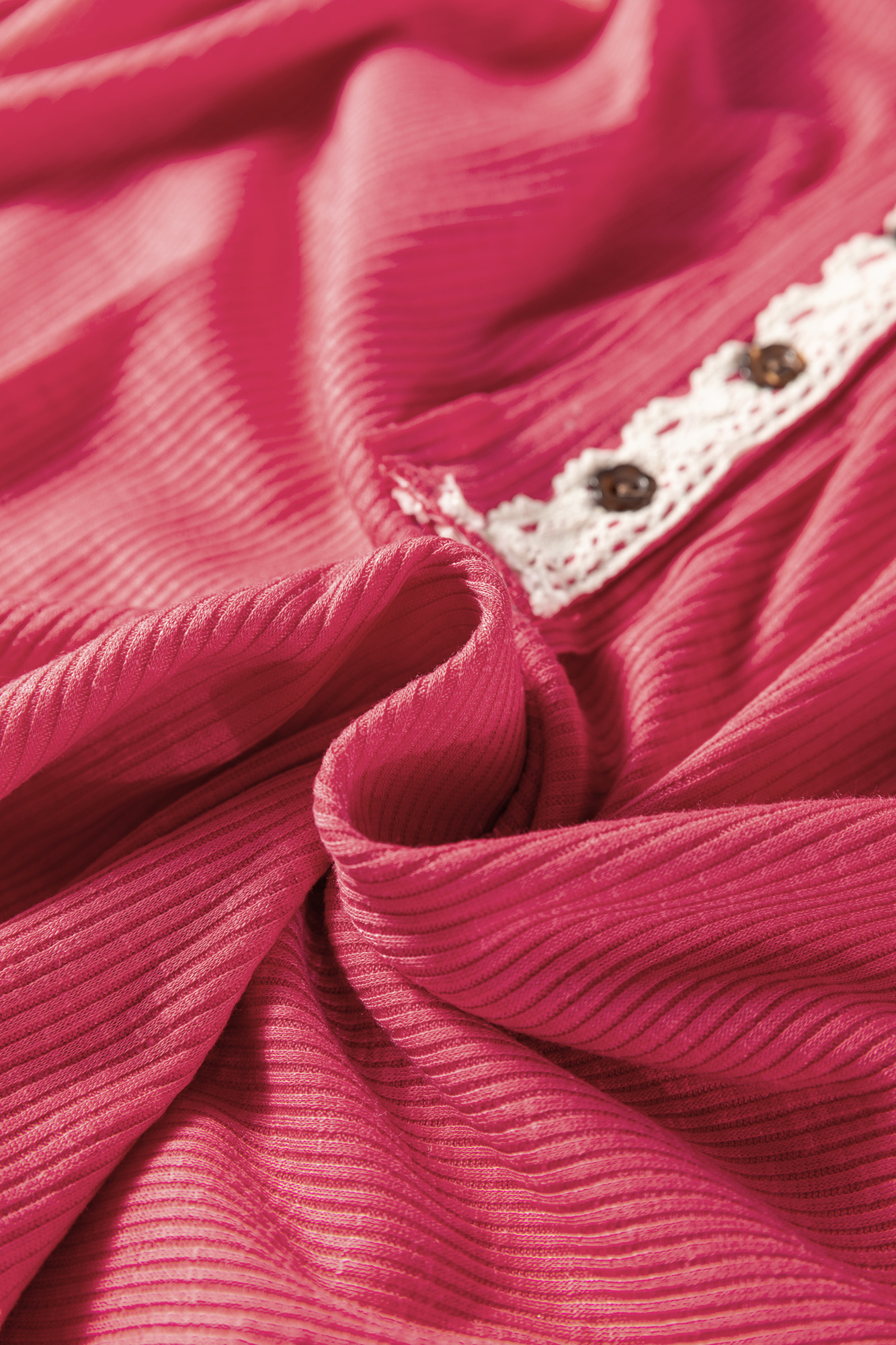 Soft ribbed knit meets feminine charm in this relaxed henley top. Featuring a flattering V-neck with delicate lace trim, button placket, and easy long sleeves, it?s lightweight, breathable, and perfect for layering or wearing solo all season long. Material: 100% Polyester