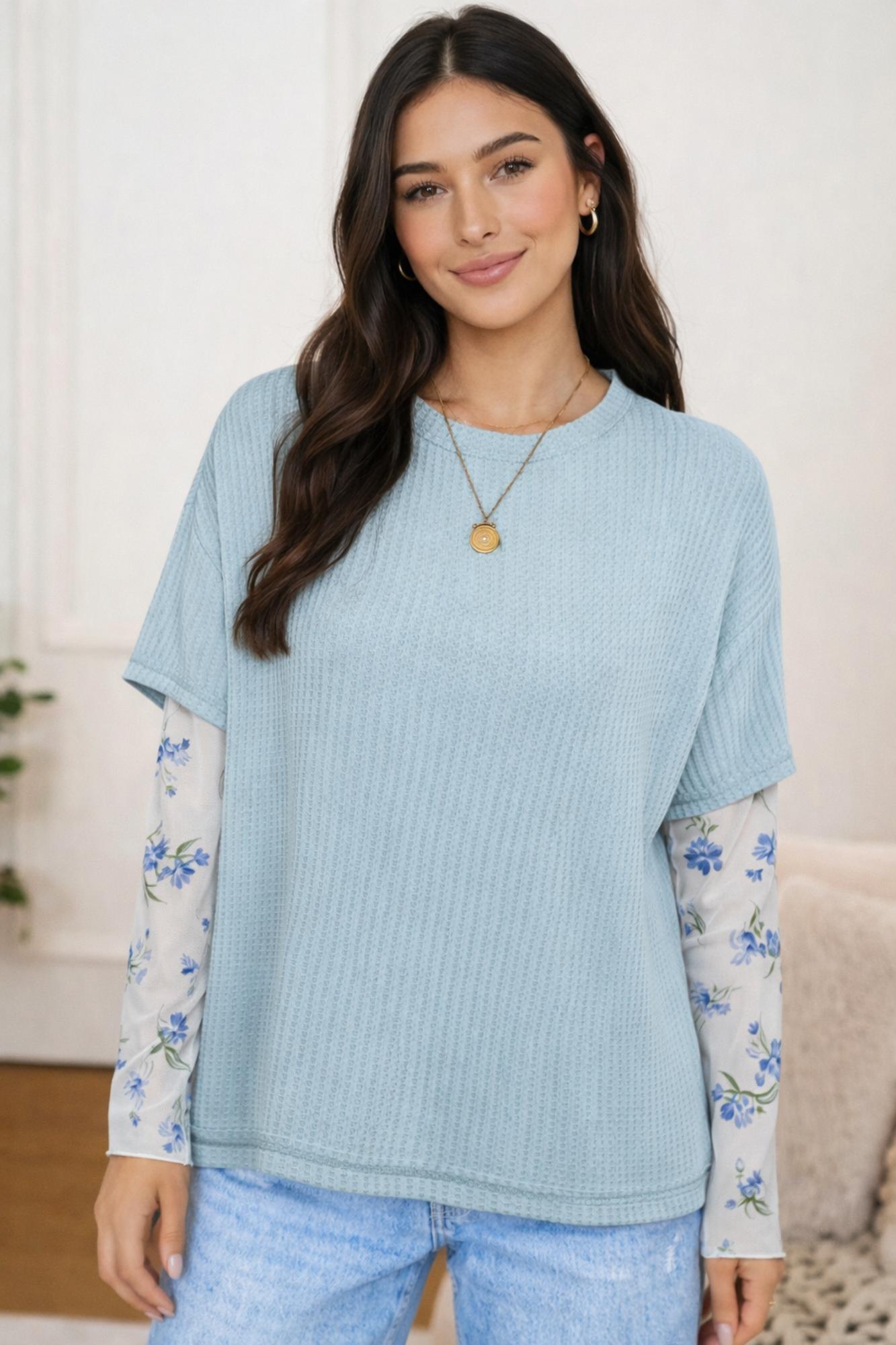 <.>- Sky Blossom Waffle Layered Top