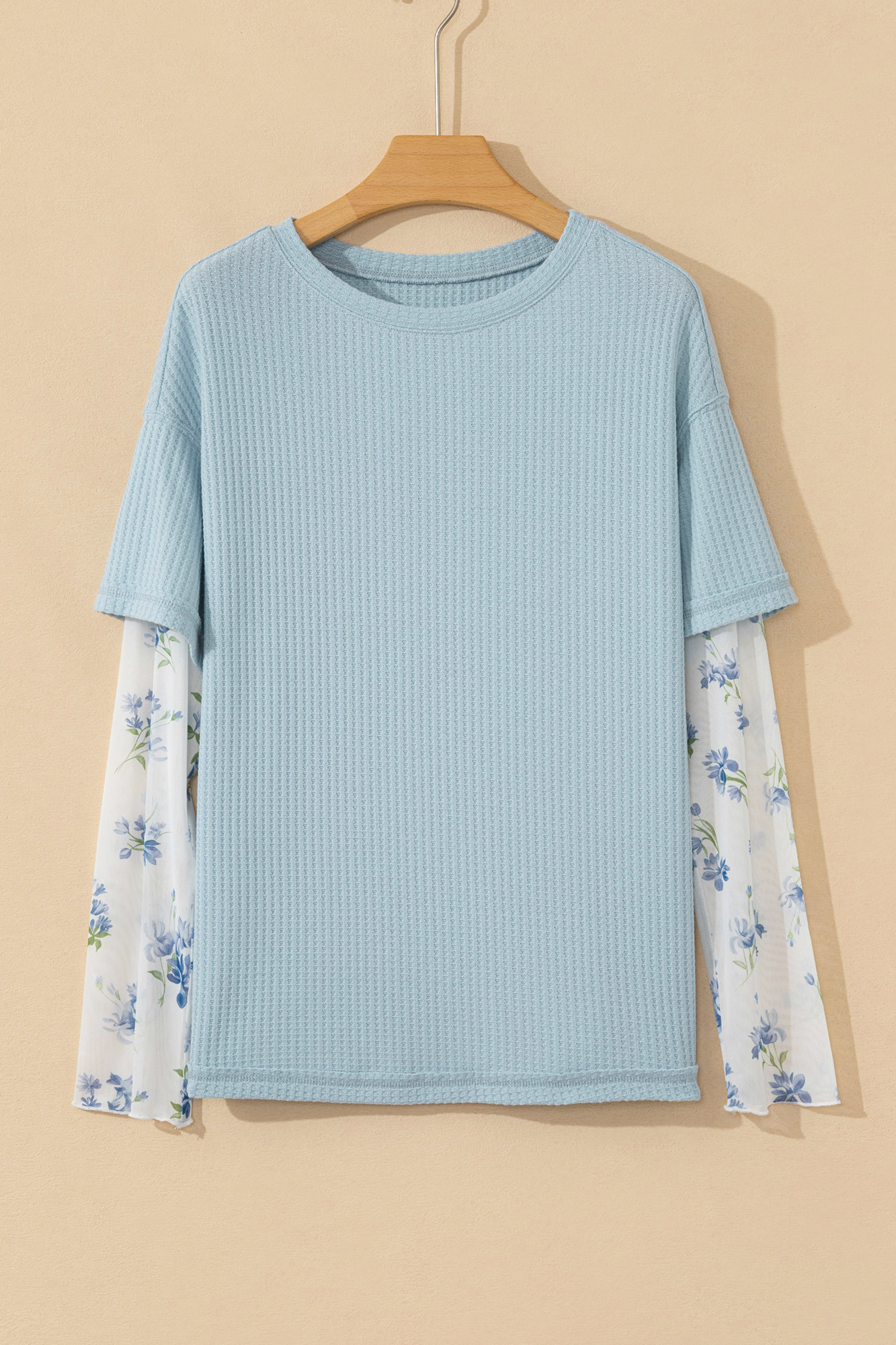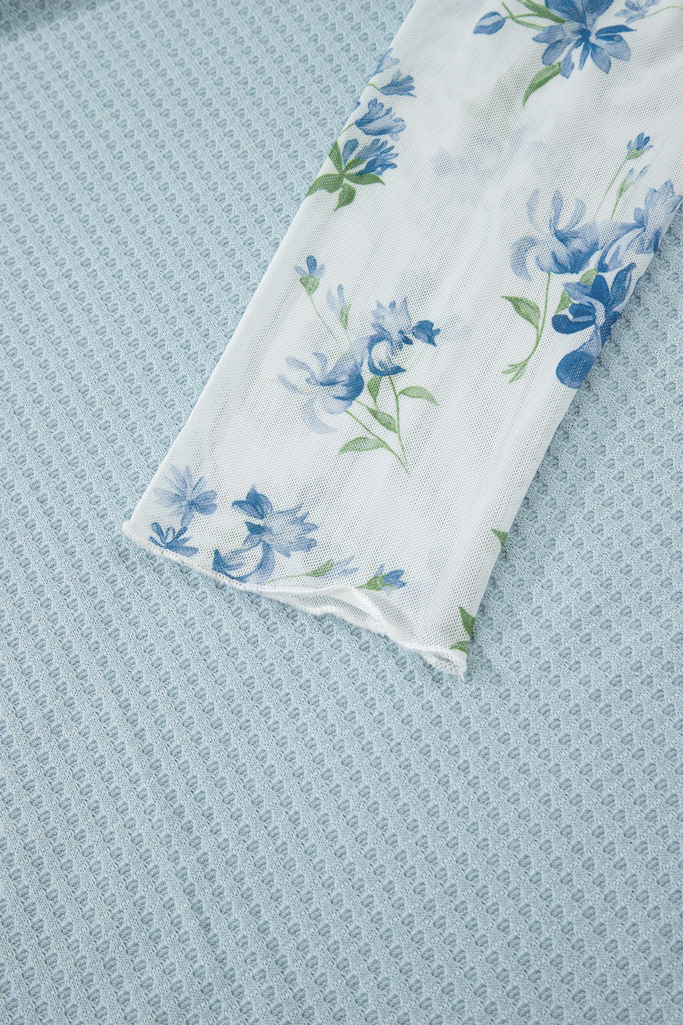 Cozy oversized waffle-knit top in soft sky blue with sheer mesh long sleeves featuring delicate blue floral print. Features a classic round neckline, dropped shoulders, relaxed boxy fit, ribbed hem and cuffs, and contrast floral sleeve panels that add a romantic, layered look. Lightweight yet warm�perfect for casual layering over jeans, skirts, or leggings for effortless everyday style with a feminine twist. Material: 65% Polyester, 30% Viscose, 5% Elastane