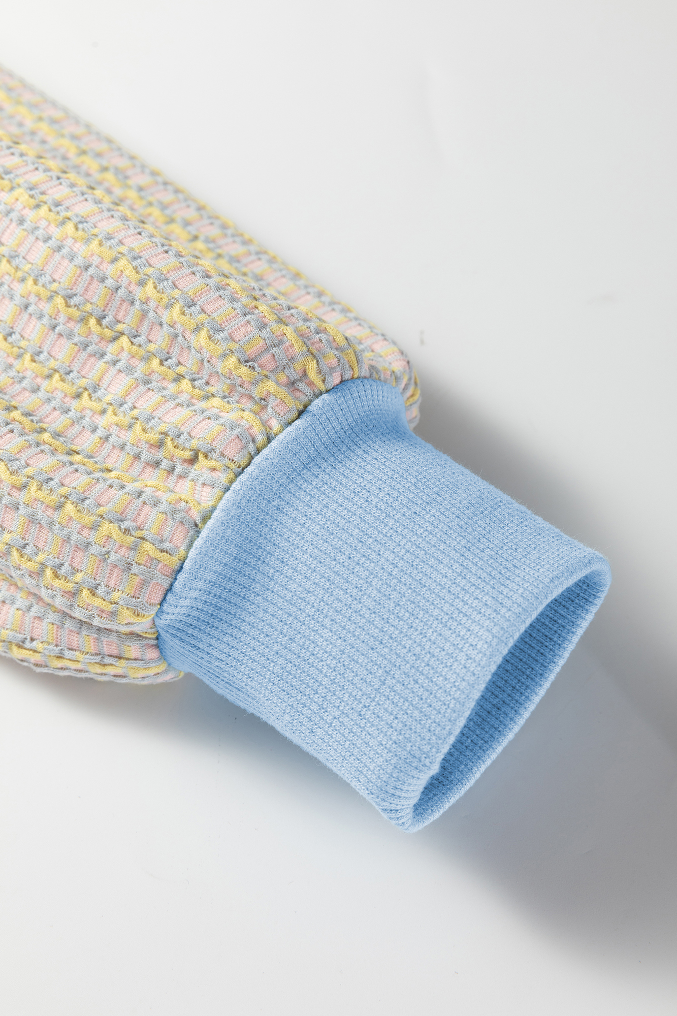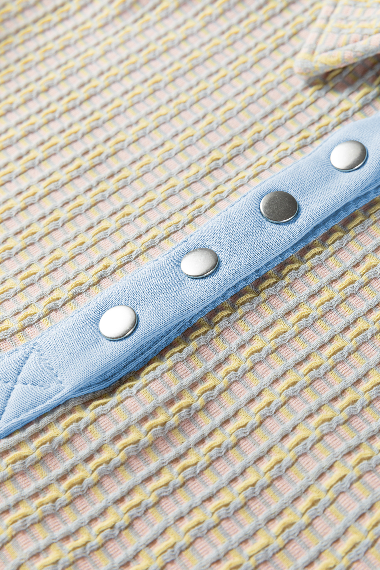 A cozy-meets-polished pullover crafted in textured woven knit with soft pastel striping. Designed with a snap-button henley collar, relaxed raglan sleeves, and ribbed cuffs and hem for all-day comfort with an elevated, boutique feel. Material: 85% Polyester, 10% Viscose, 5% Elastane