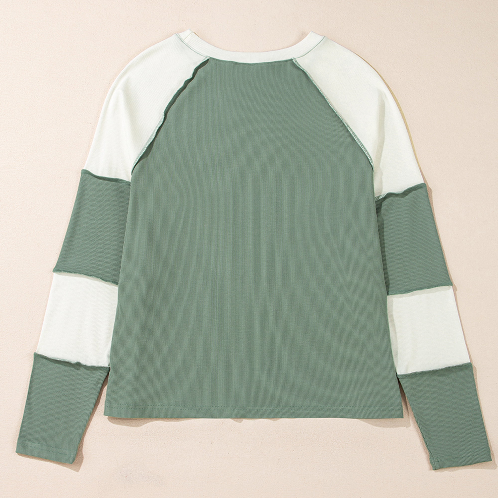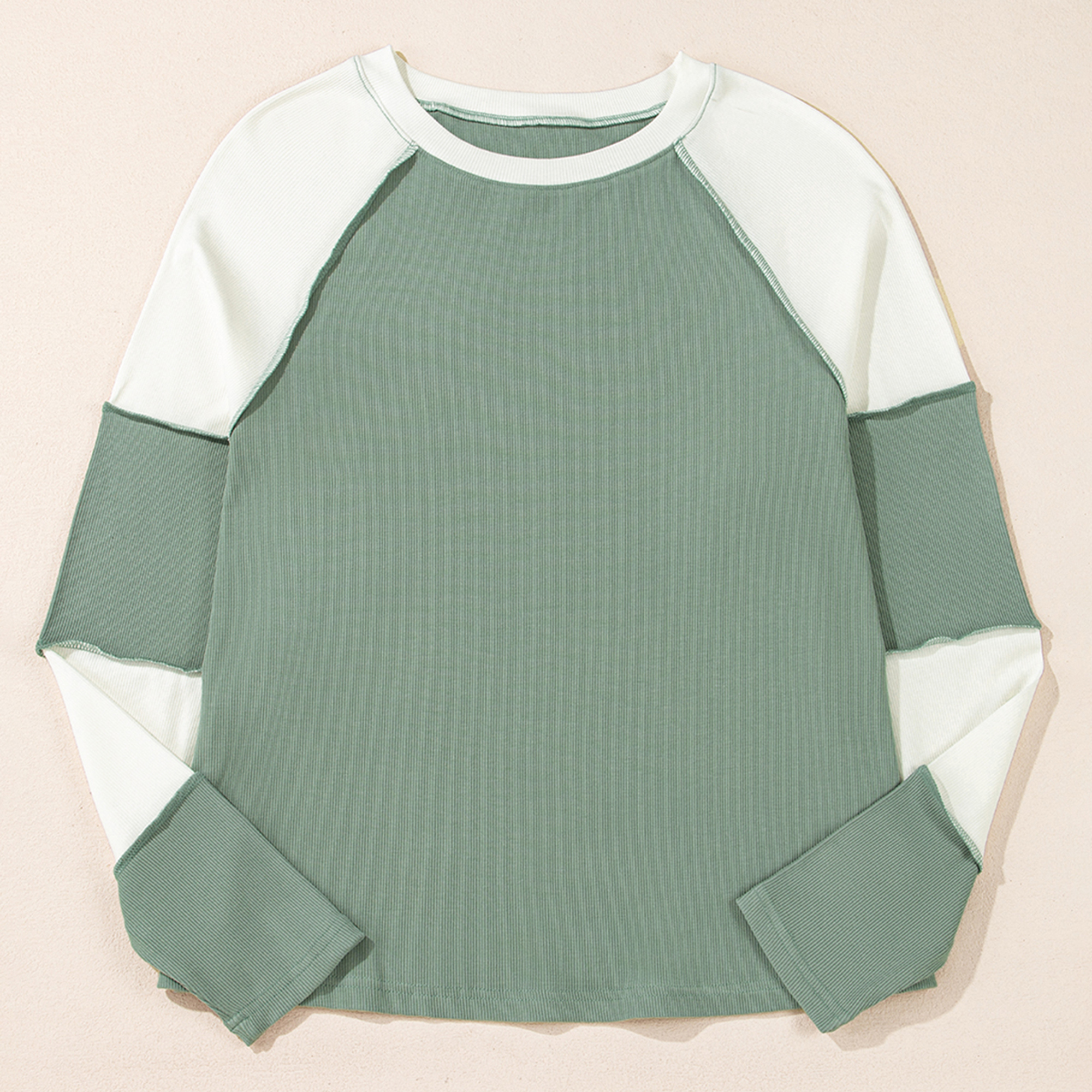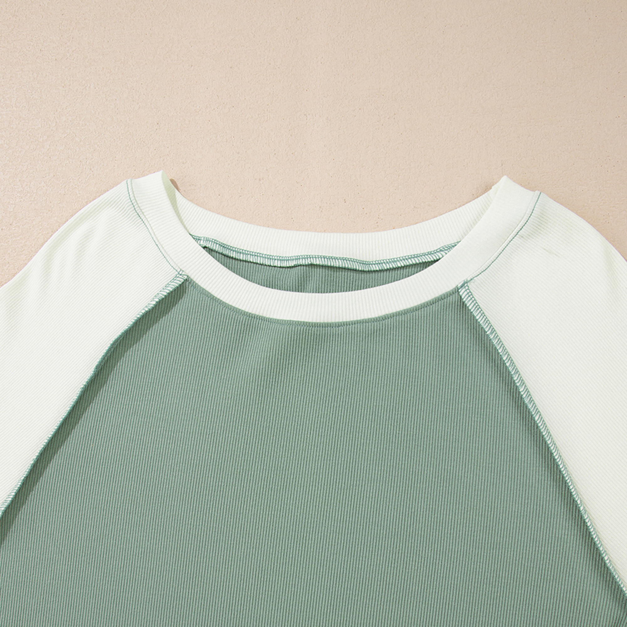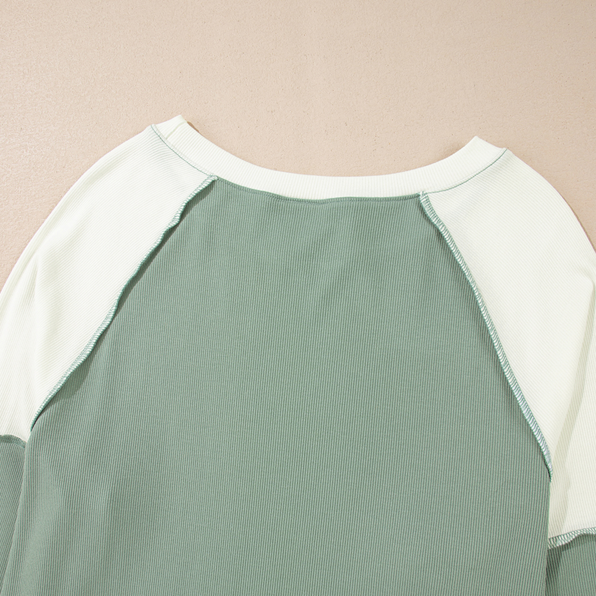 Effortlessly cozy, this soft moss and cream colorblock top brings relaxed style to everyday wear. Featuring raglan sleeves, layered block details, and a comfy loose fit, it pairs perfectly with denim or leggings. Soft ribbed texture adds dimension easy, stylish, and endlessly wearable. Material: 93% Viscose, 7% Elastane