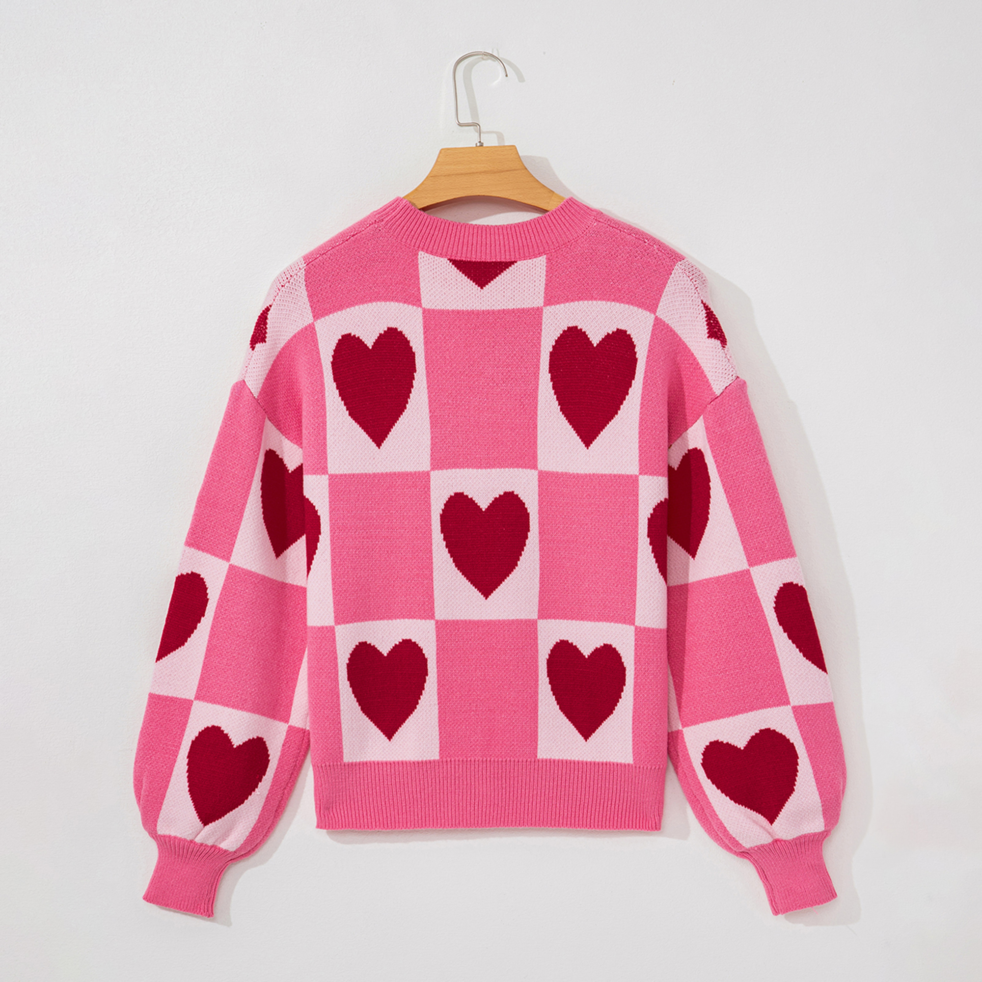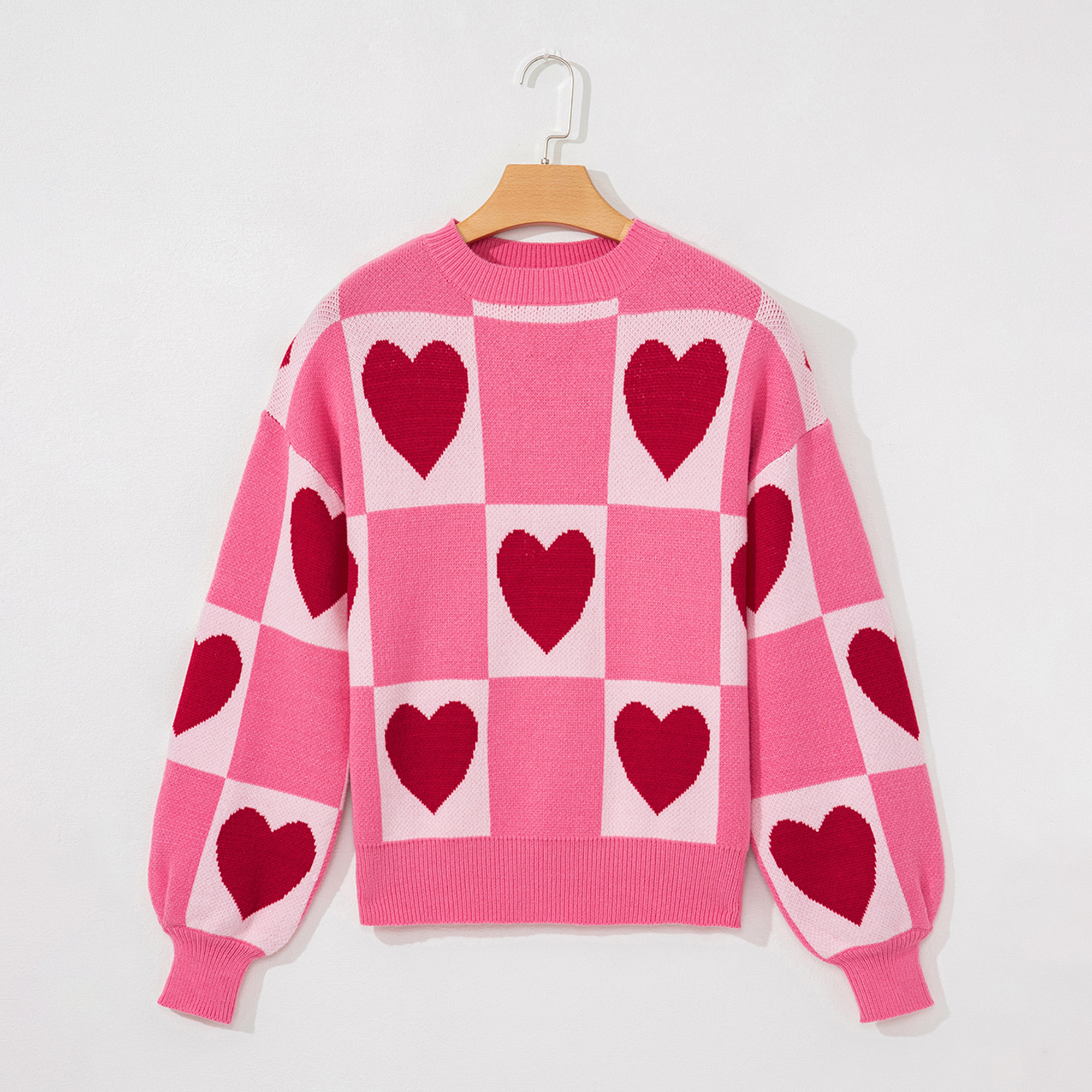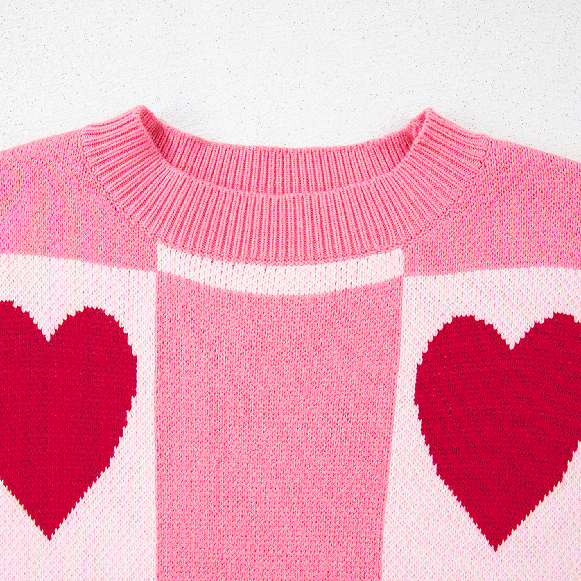 Spread the love in this cozy pink and blush checkered sweater. Featuring bold red heart motifs across a blocked pattern, this charming knit includes a classic crew neckline and soft ribbed cuffs. A perfect, vibrant piece for adding a playful touch to your winter style. Material: 52% Viscose, 26% Polyester, 22% Polyamide