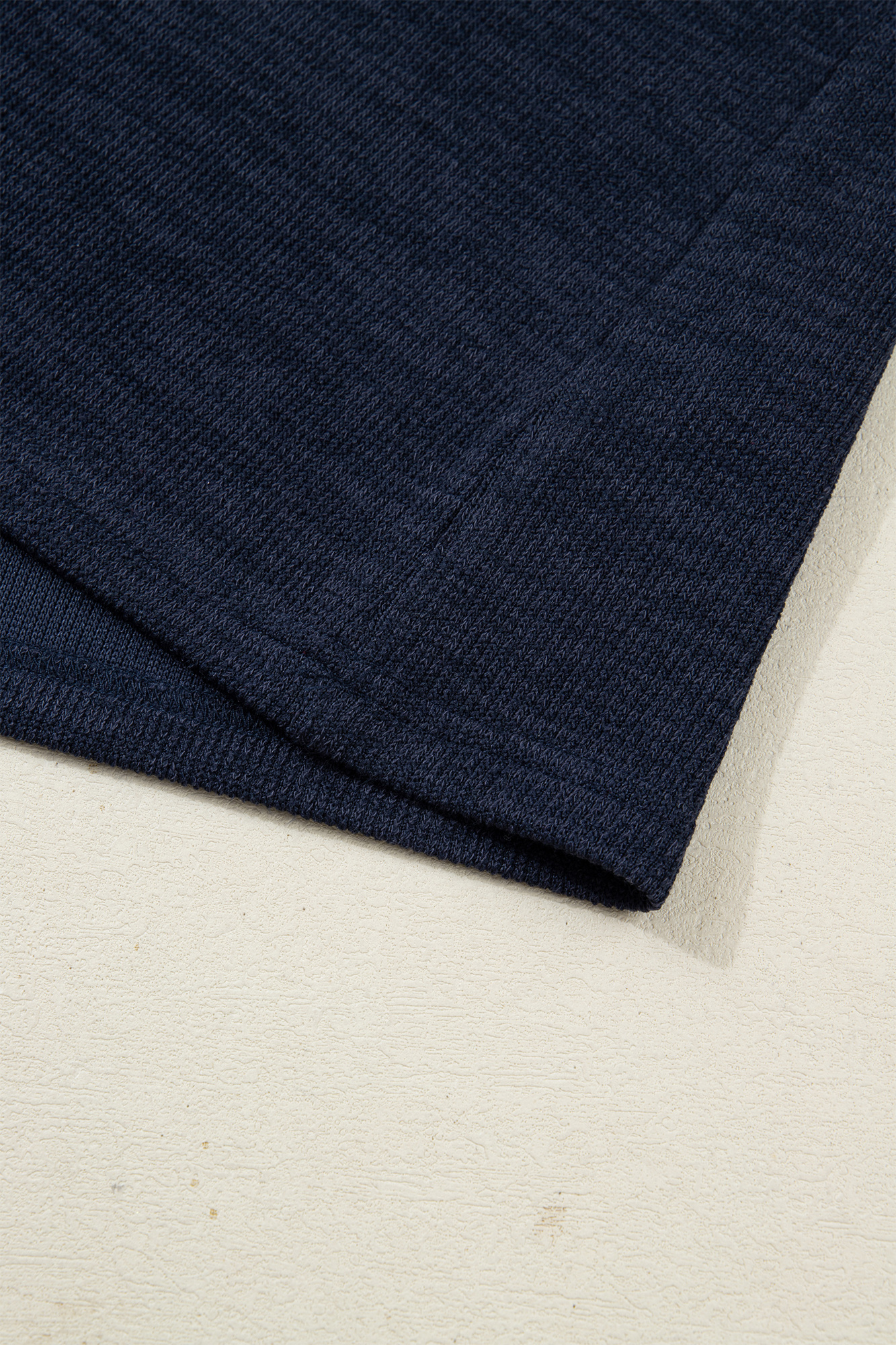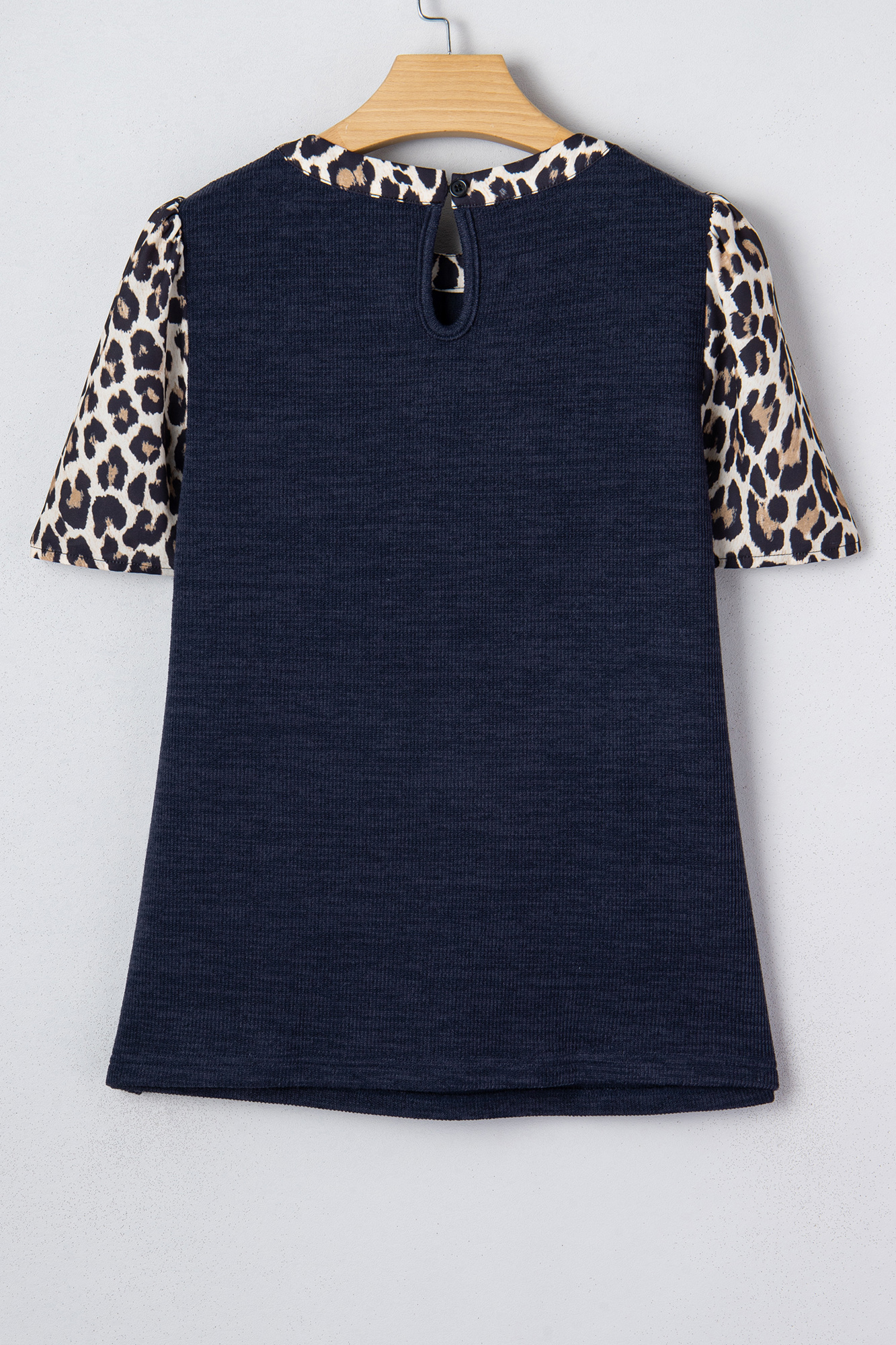 Make a bold statement with this navy textured knit top. Featuring fierce leopard print flutter sleeves and a matching trim neckline, it combines comfort with a touch of edge. Finished with a chic back keyhole closure, it�s the perfect elevated essential. Material: 100% Polyester