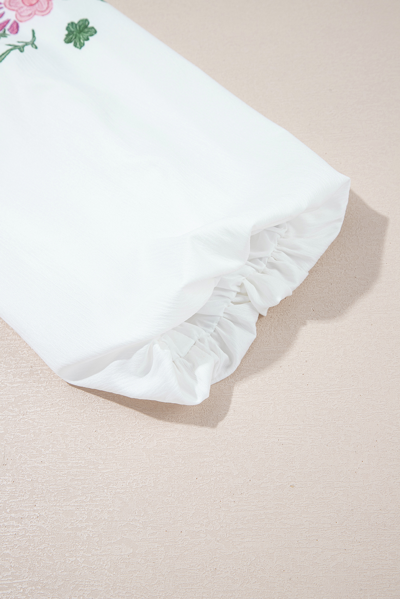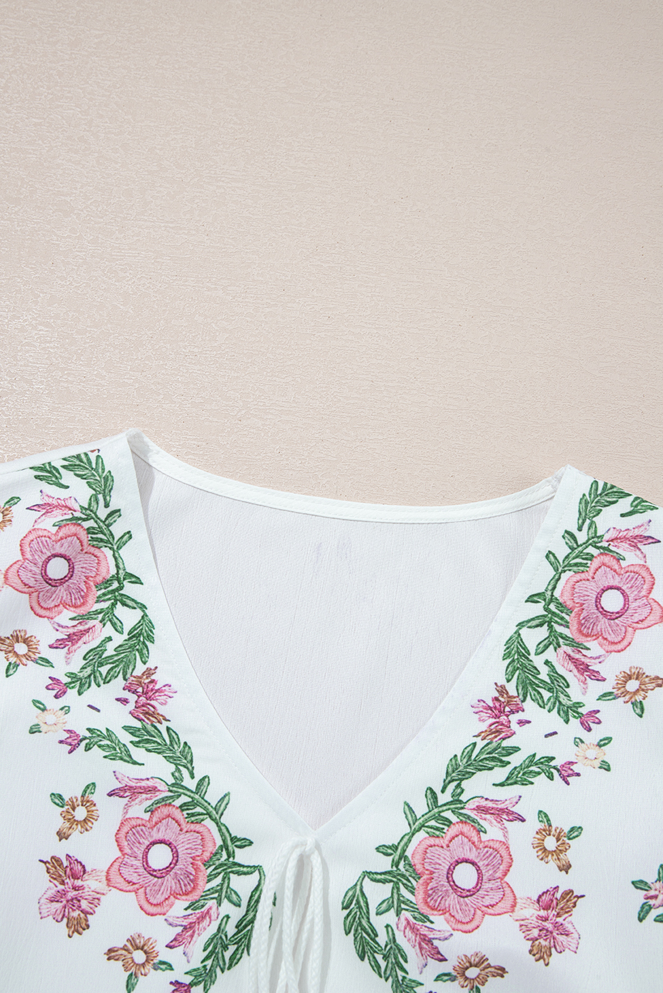 Say hello to effortless charm with this embroidered peasant top. Soft, lightweight fabric meets dreamy puff sleeves, floral stitching, and a relaxed, flowy silhouette. Finished with a tassel tie neckline, it?s the perfect blend of boho romance and everyday comfort?pair with denim, skirts, or summer shorts. Material: 97% Polyester, 3% Elastane