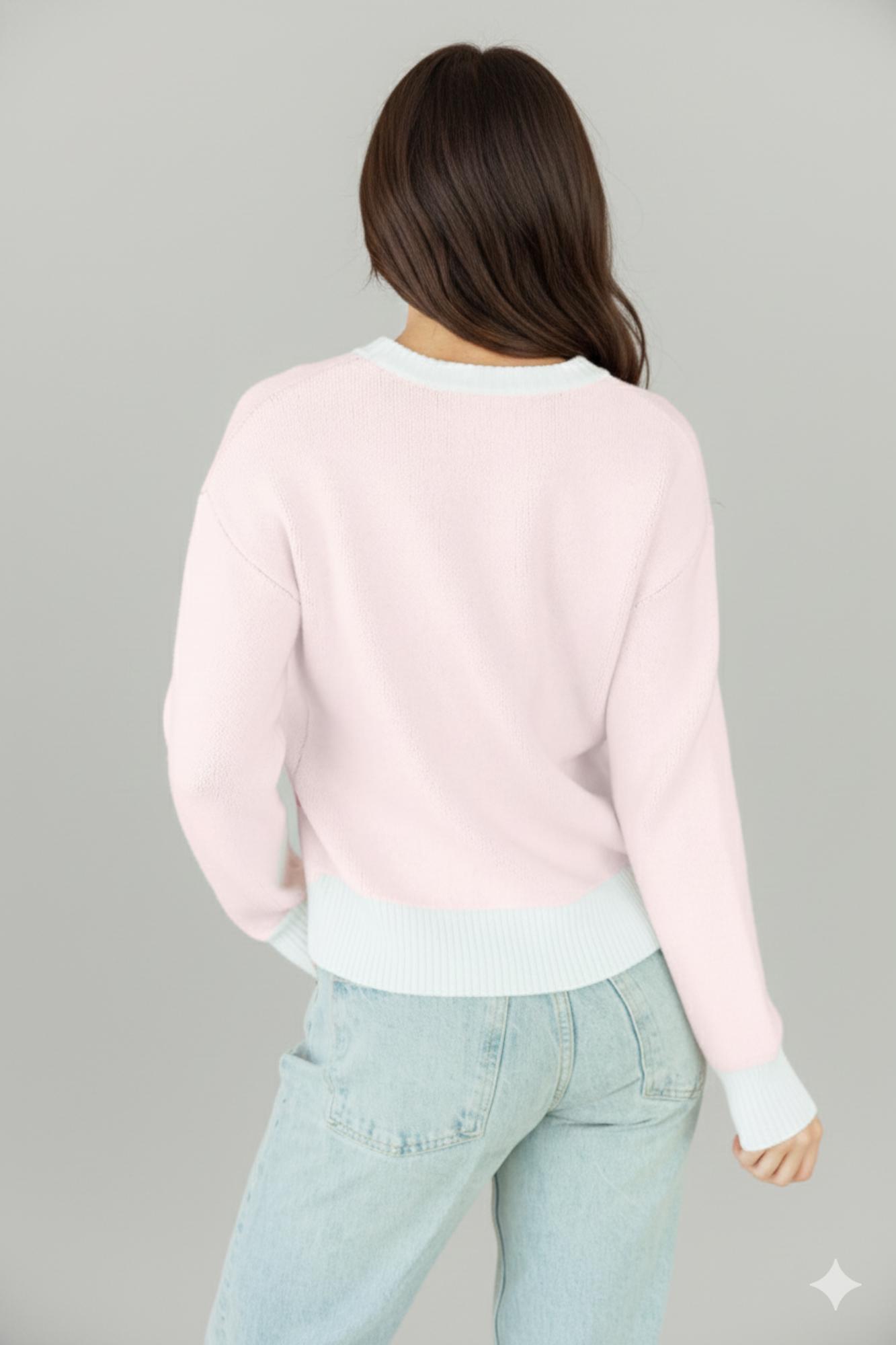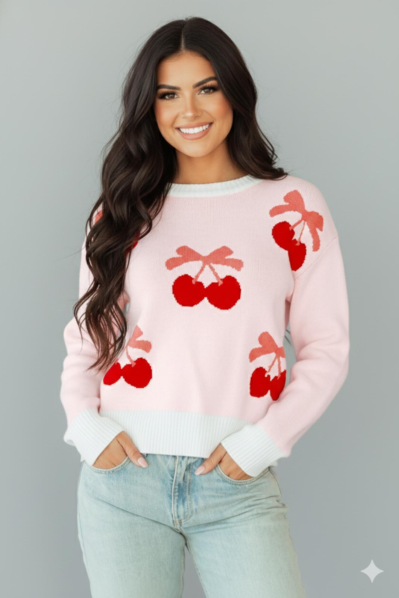 Add a pop of playful charm to your closet with this sweet pink knit sweater. Featuring vibrant red cherry graphics topped with darling pink bows, this cozy pullover is finished with crisp white ribbed trim for a fresh, feminine look. Perfect for adding a whimsical touch to any day! Material: 52% Viscose, 26% Polyester, 22% Polyamide