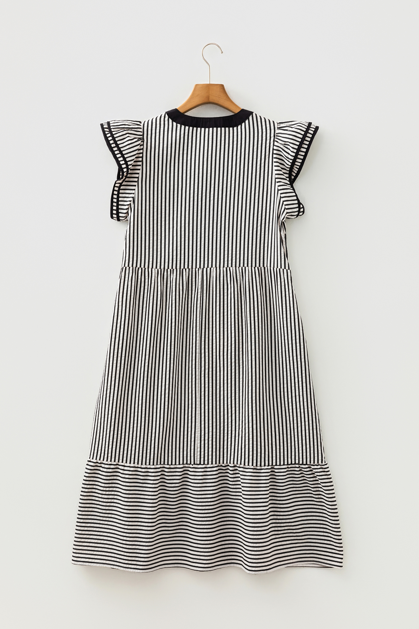 Timeless striped elegance meets playful charm in this breezy midi dress. Featuring a classic Breton black-and-white stripe pattern, flutter ruffle sleeves, contrast-trimmed V-neckline with subtle pleat detailing, empire waist, and double-tiered ruffled hem for effortless flow. Lightweight cotton-blend fabric perfect for warm days, vacations, or casual outings. Material: 60% Polyester, 35% Cotton, 5% Elastane
