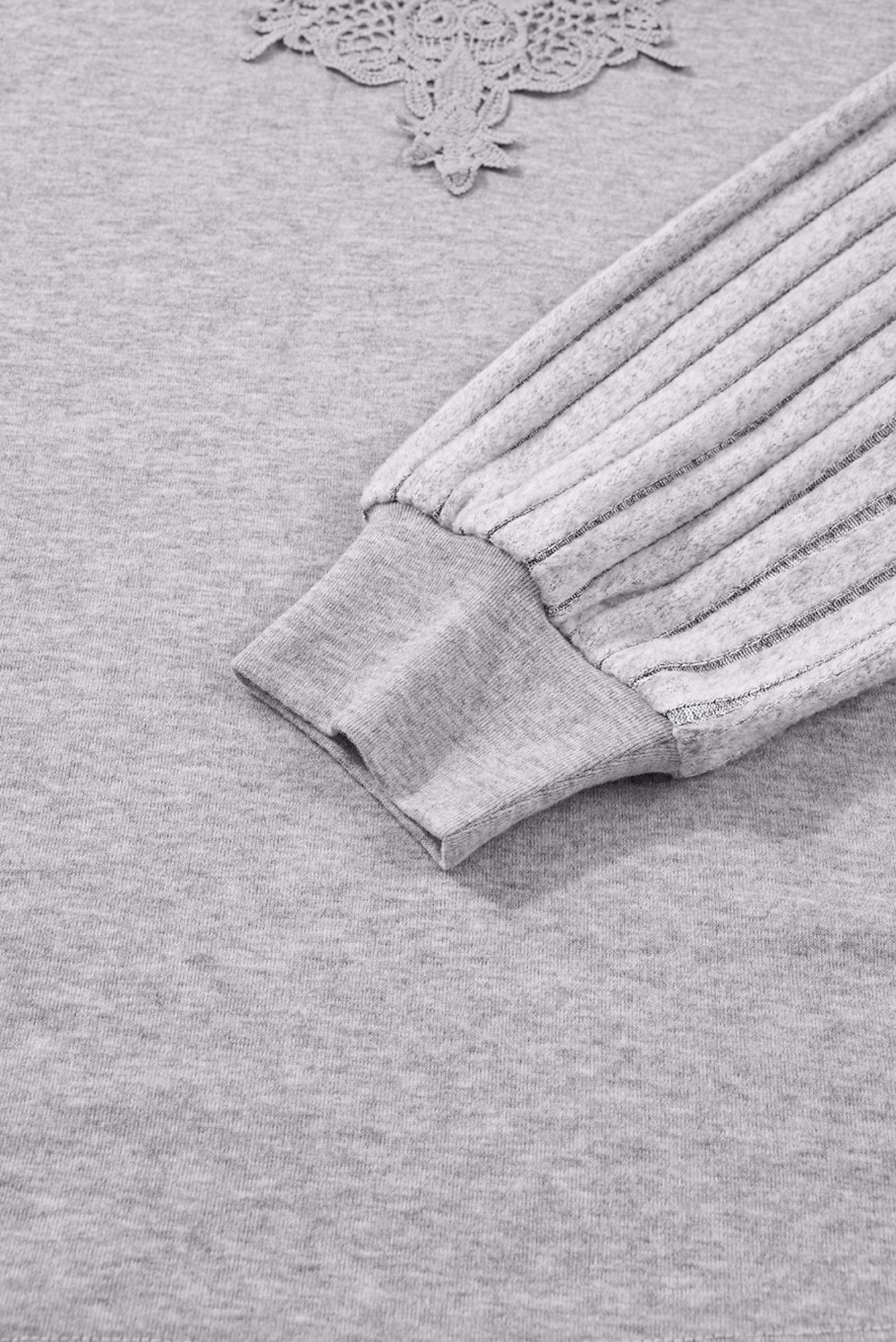 Soft, feminine, and effortlessly chic this top blends cozy rib-pleated sleeves with a stunning lace neckline for a touch of romance. The relaxed fit makes it easy to style, while the luxe detailing keeps it elevated for brunch dates, workdays, or evenings out. Material: 75% Polyester, 25% Cotton
