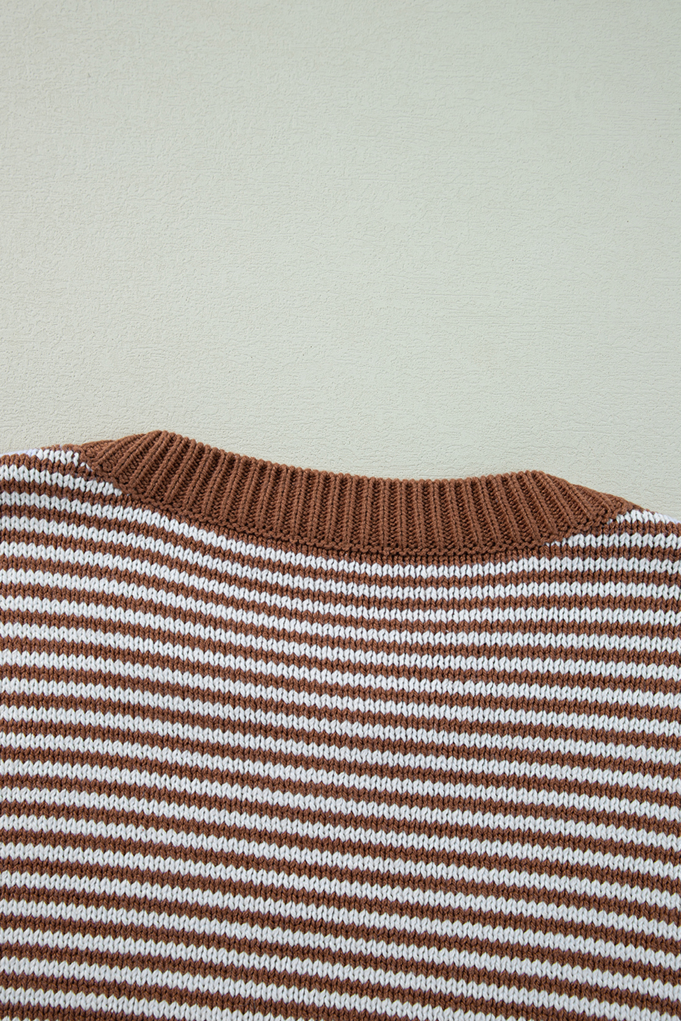 Wrap yourself in cozy charm with the Caramel Horizon Striped Sweater. Crafted in warm caramel and cream tones, it features playful stripe contrasts and a subtle diamond knit pattern for texture. With dropped shoulders and a relaxed fit, it’s your go-to piece for effortless fall layering. Material: 60% Cotton, 40% Acrylic