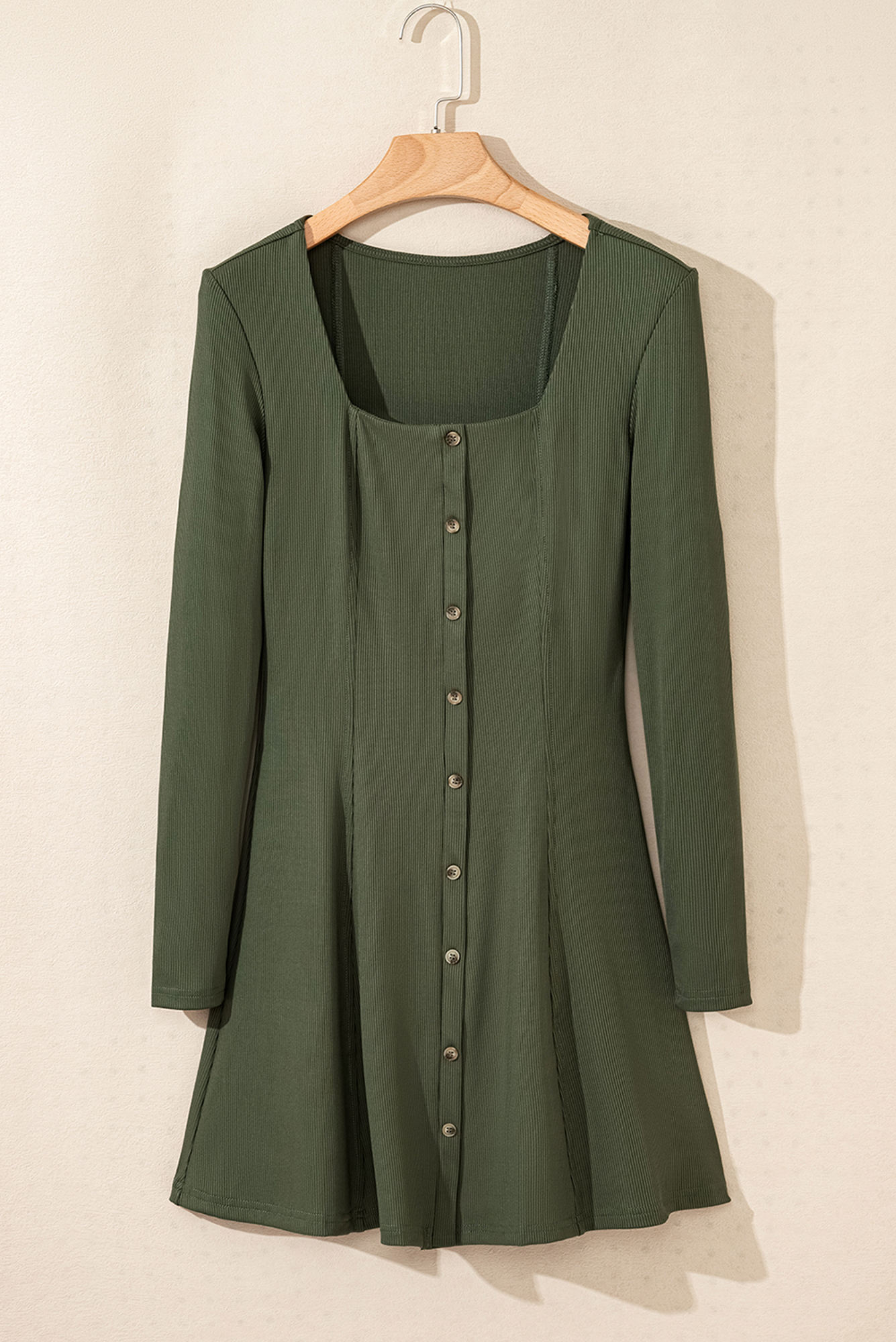 Featuring a flattering square neckline, long sleeves, and a row of classic front buttons, it blends minimal chic with versatile functionality. The tailored seams create a feminine silhouette, while the A-line hem adds subtle movement with every step.