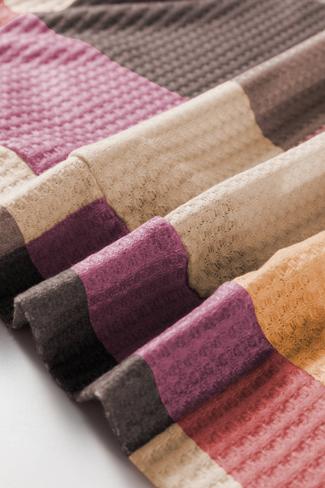 Wrap yourself in cozy autumn charm with this soft waffle-knit top, featuring a warm patchwork of plum, taupe, coral, and golden tones. Its relaxed fit and billowed sleeves create effortless comfort and style—perfect for everyday wear, weekend outings, or layering through the seasons. Material: 92% Polyester, 8% Elastane