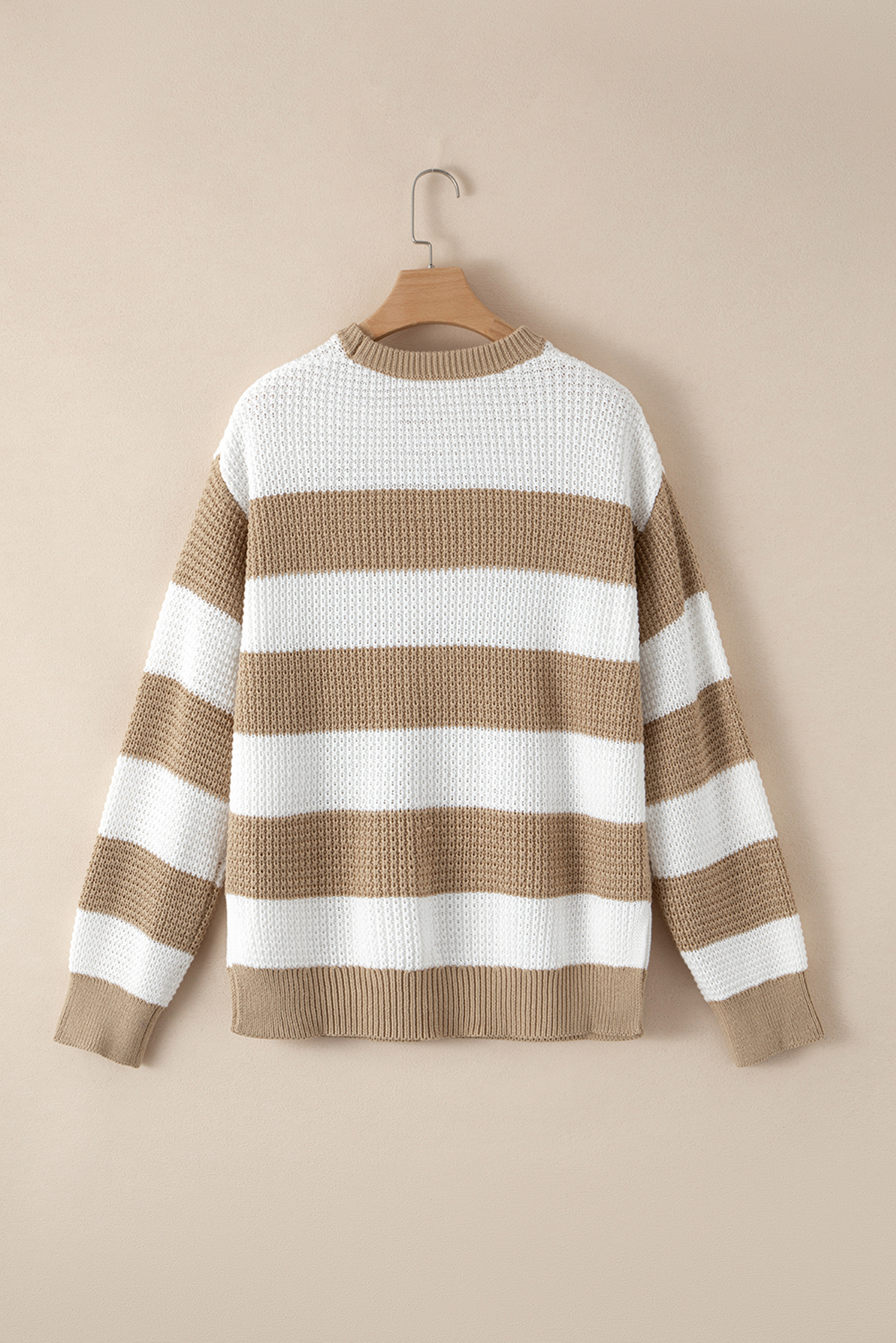 Bask in cozy charm with the Honeycomb Haven Striped Sweater. Crafted with a soft waffle-knit texture in warm honey and cream tones, this relaxed-fit pullover features wide stripes, drop shoulders, and ribbed trim. The perfect balance of comfort and casual elegance for effortless layering. Material: 55% Acrylic, 45% Cotton