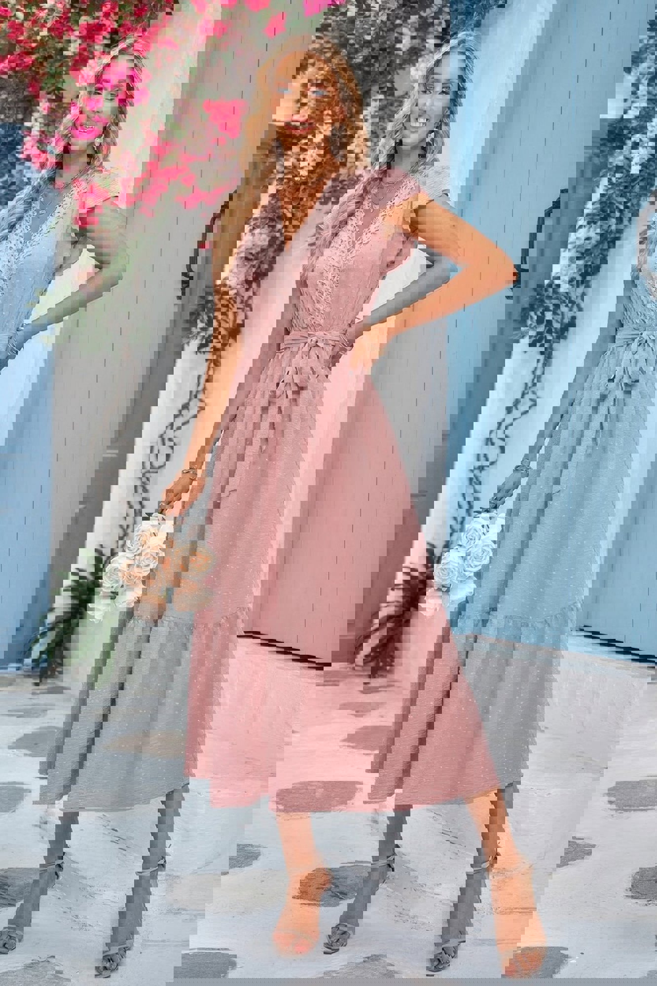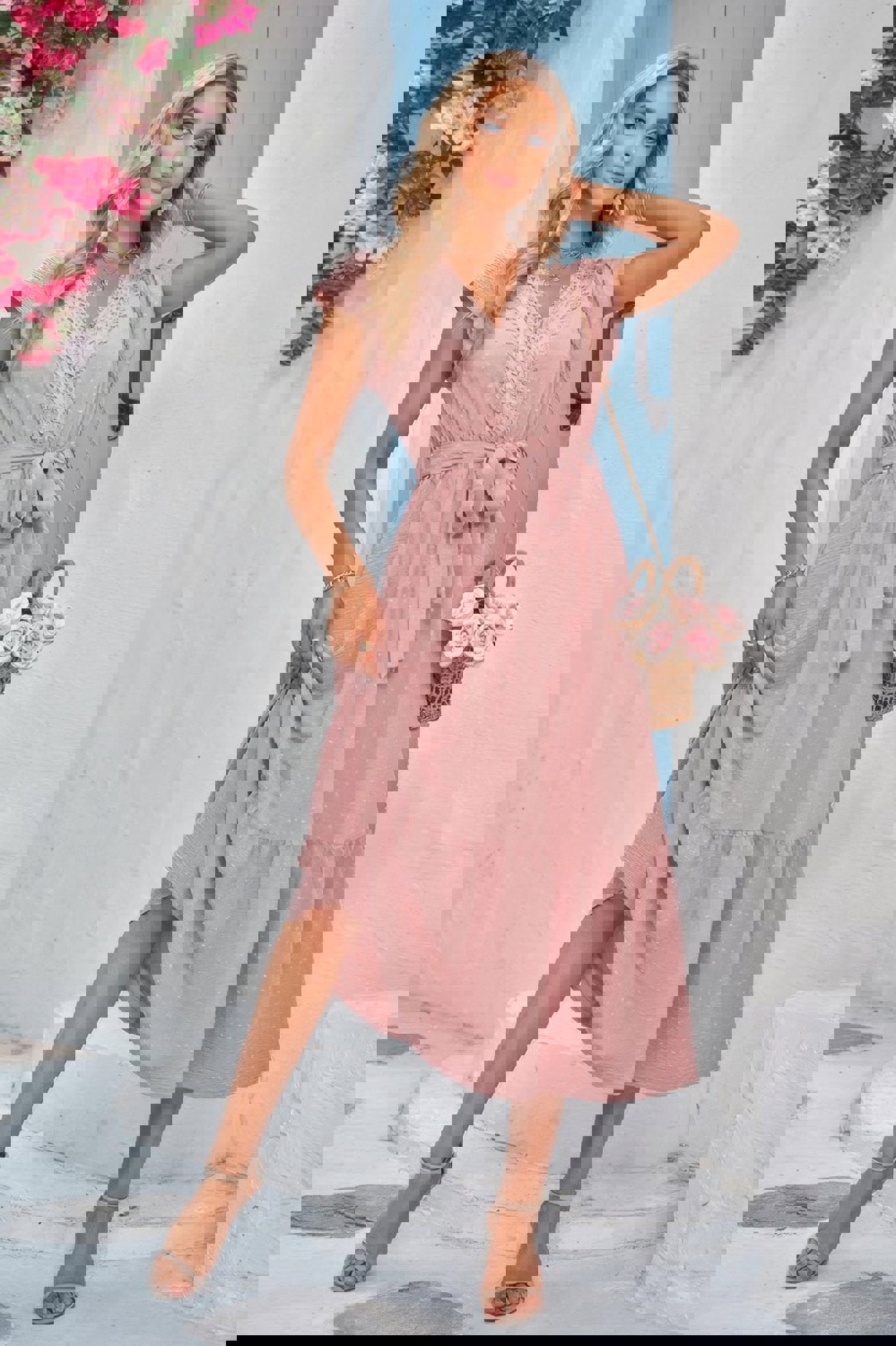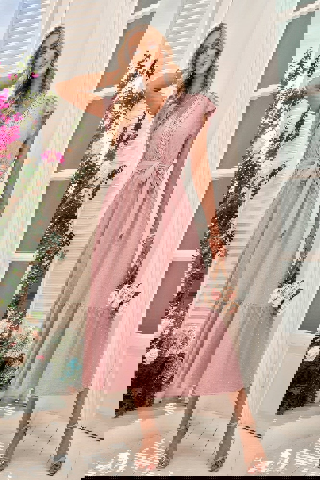 Graceful and flattering, the Lace Neck Tiered Midi Dress blends romantic detailing with effortless wear. Featuring a deep V neckline, delicate lace accents, and a coordinating waist belt, this dress is perfect for daytime events or vacation evenings. Its soft, stretchy fabric ensures comfort without compromising on style.
