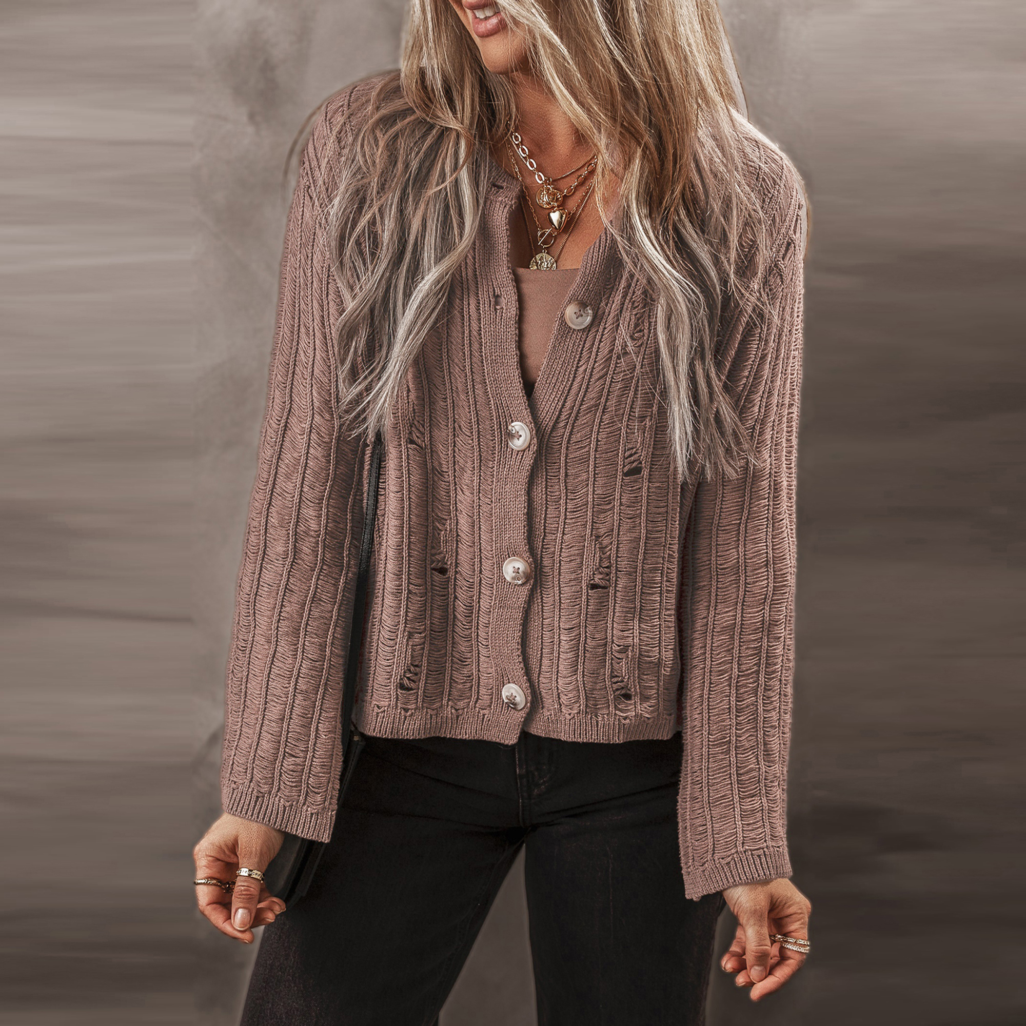 Effortlessly cool and endlessly versatile, the Mocha Drift Knit Cardigan is your go-to layering piece this season. Crafted with an airy open-stitch design, this cardigan blends cozy comfort with a touch of edge. The relaxed silhouette, oversized buttons, and slightly distressed texture give it a laid-back vibe that pairs just as easily with jeans and boots as it does over a dress. Perfect for coffee dates, weekend strolls, or casual office looks, this neutral mocha shade complements any wardrobe palette.
