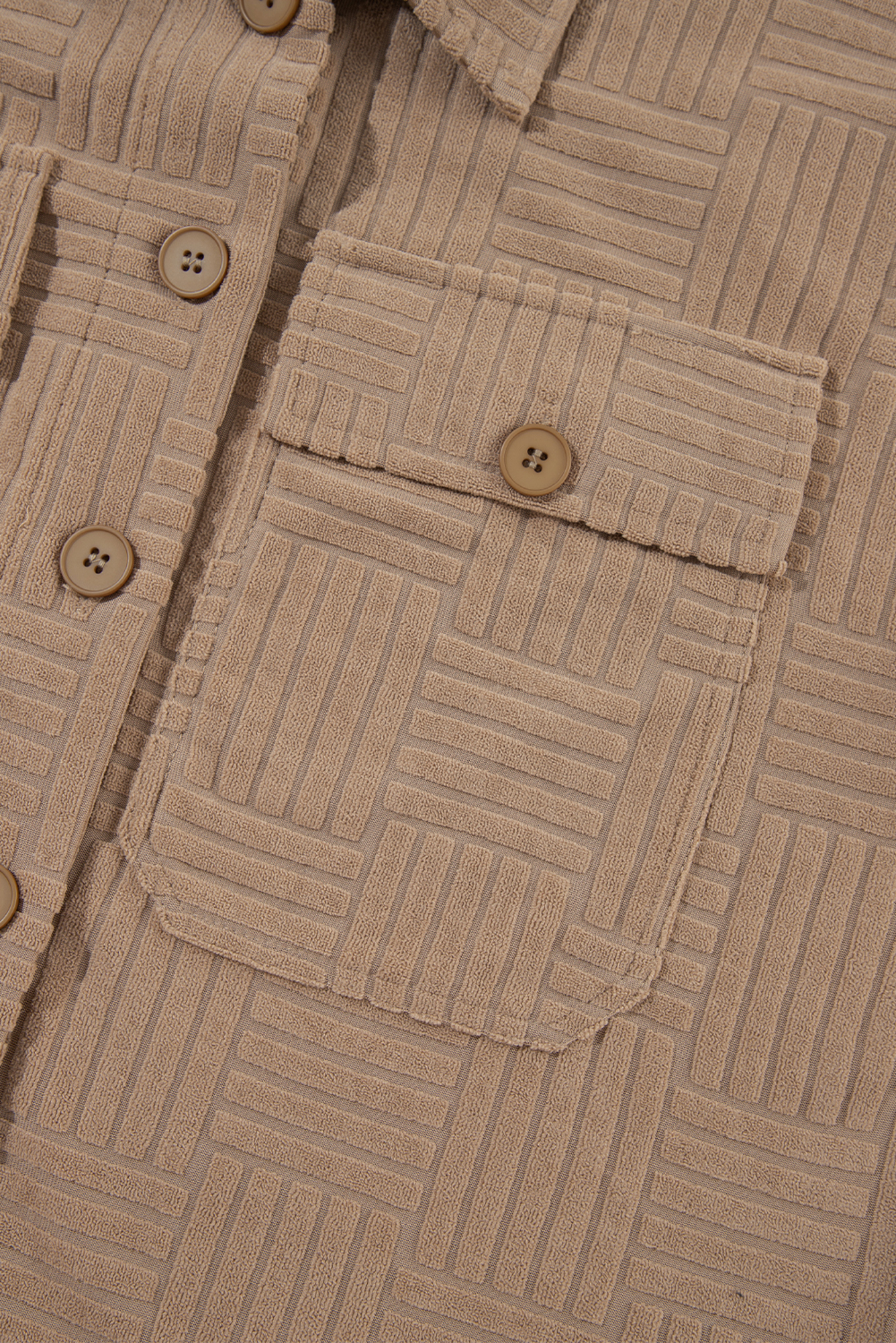 Wrap yourself in effortless style with our Mocha Maze Textured Button Shacket. Crafted in a soft geometric terry knit, it blends structure with coziness. Front flap pockets, tonal buttons, and a relaxed fit make it a perfect layer for coffee runs, weekend strolls, or fireside lounging. 100% Polyester