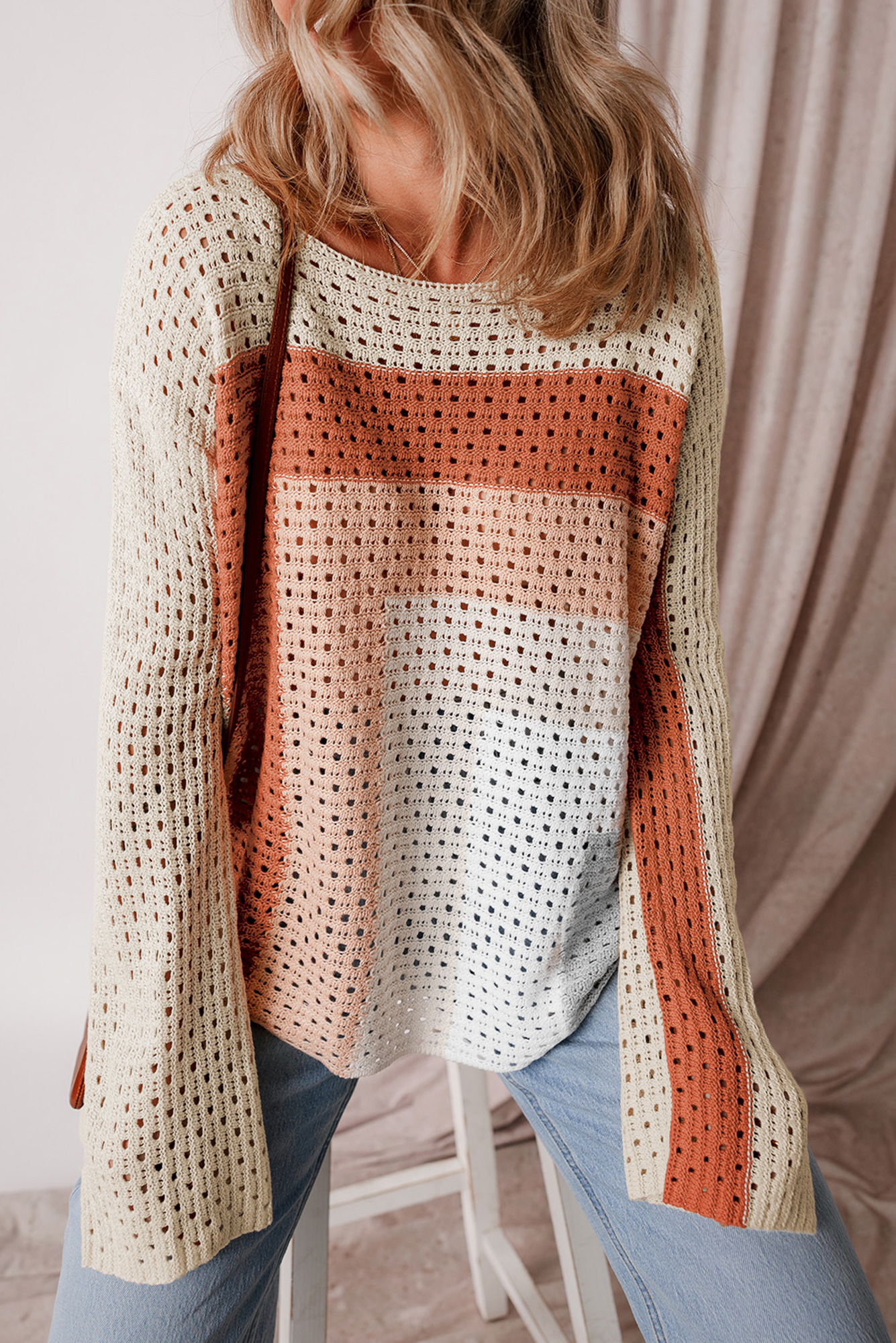 Breathe fresh, effortless style into your wardrobe with our Sunset Glow Crochet Pullover. Designed with airy open-weave crochet, this lightweight sweater brings boho charm and all-day comfort. The warm striped palette—rich rust, peach, ivory, and sand—creates a soft ombré effect that’s perfect for transitioning seasons.