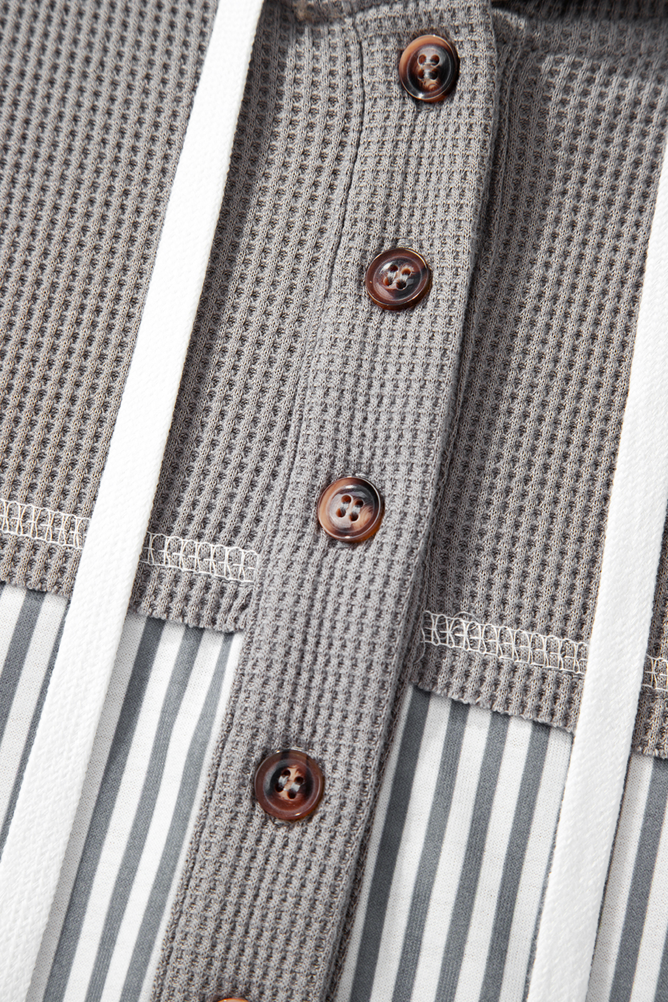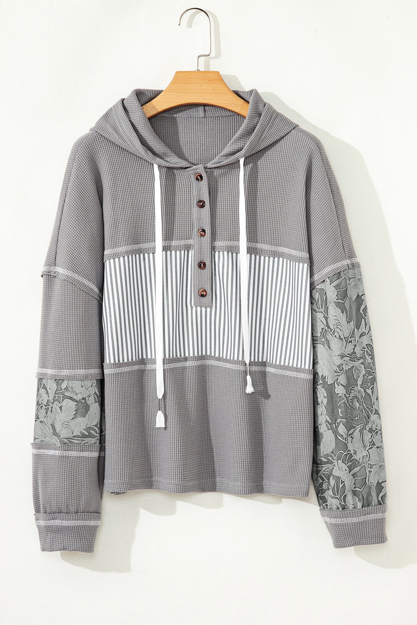 The Urban Remix Waffle Knit Hoodie blends comfort and creativity with its mixed textures and patchwork design. Featuring soft waffle knit, striped panels, and floral sleeve accents, this button-up hoodie adds a cool, effortless edge to your casual days while keeping you cozy. Material: 75% Polyester, 25% Cotton