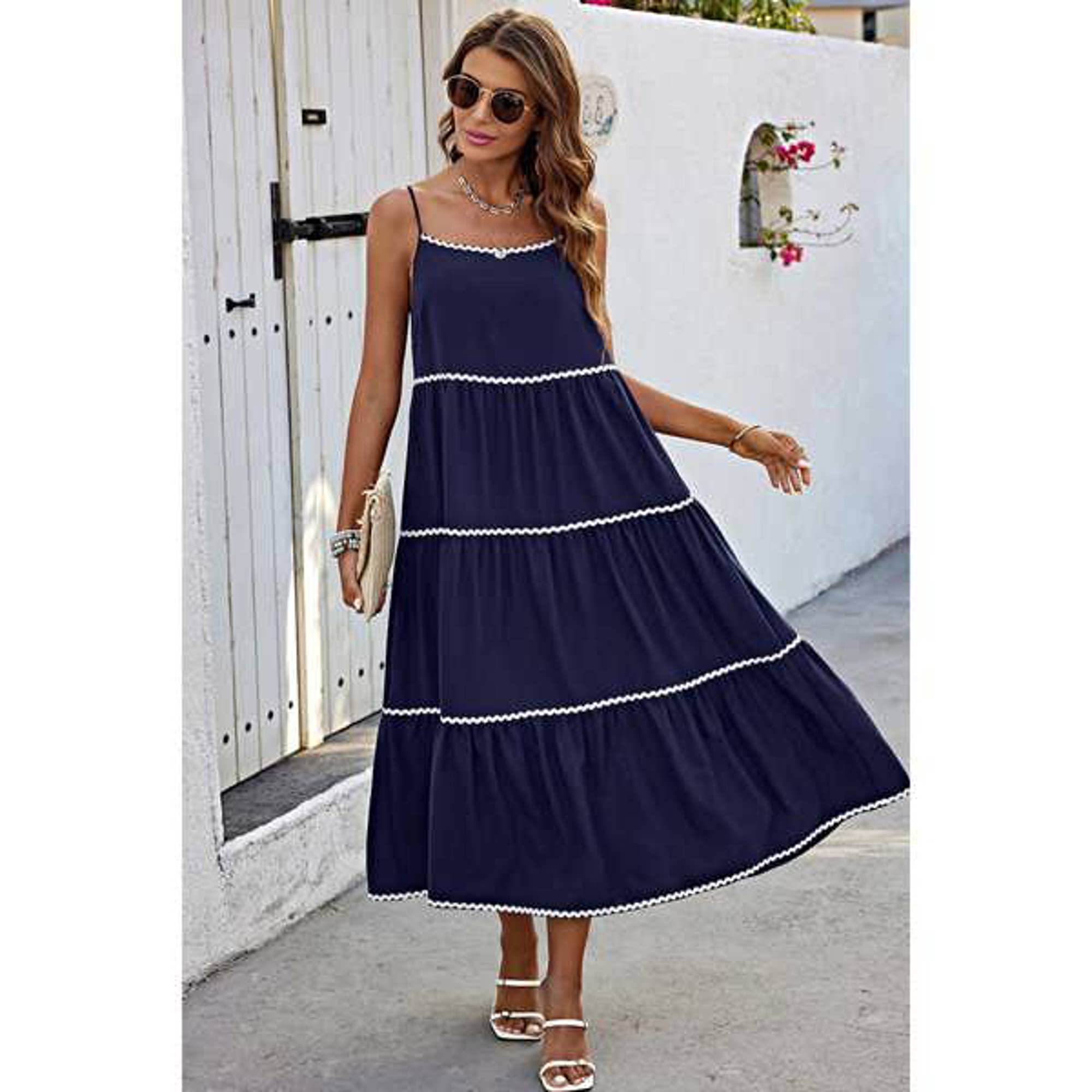 This maxi dress features a square neck, sleeveless design, and adjustable spaghetti straps. The loose-fit A-line tiered silhouette is adorned with white wave trims and crafted from solid color woven fabric for a breezy, elegant look.