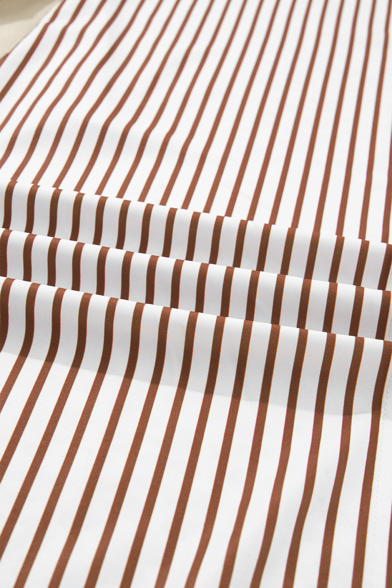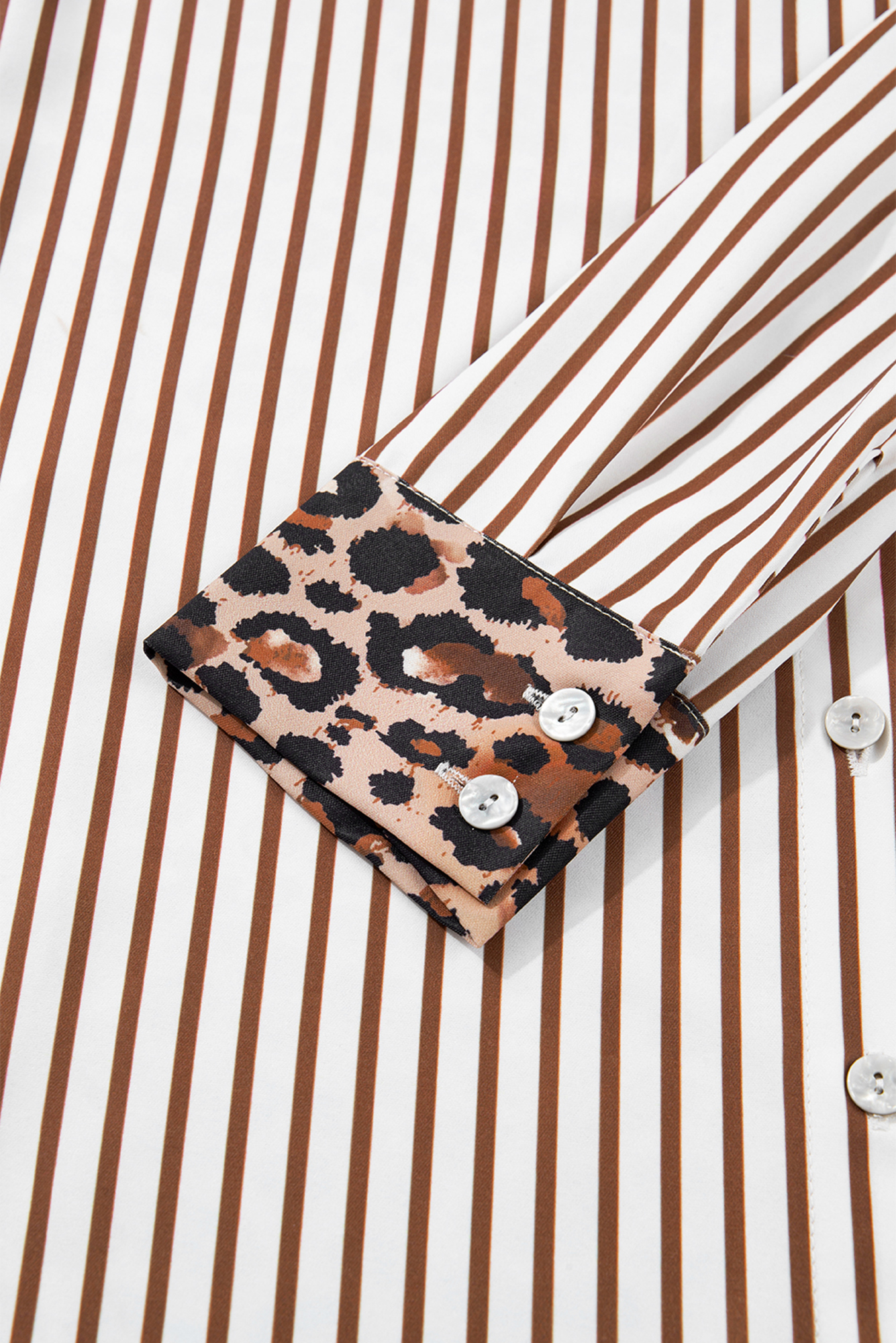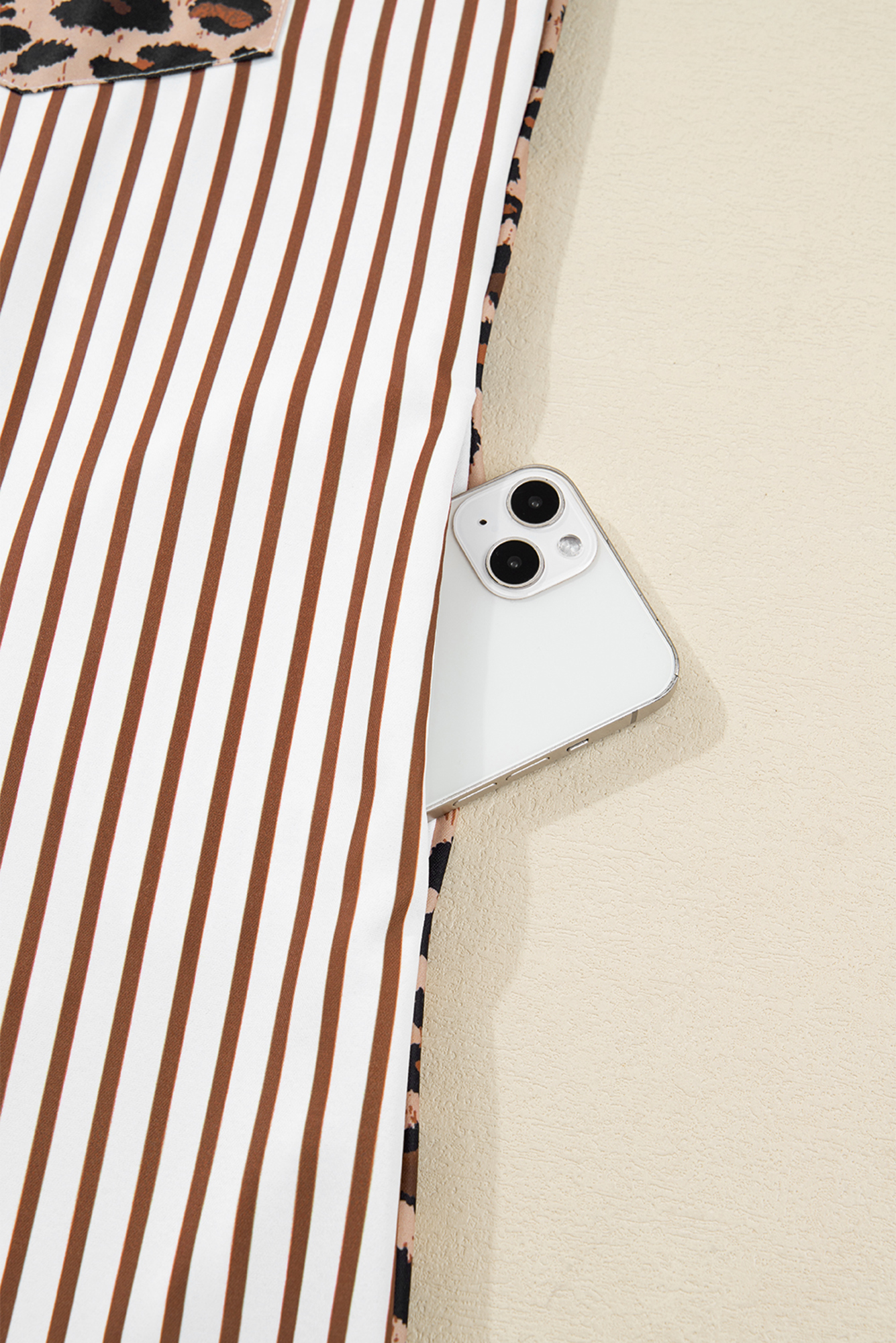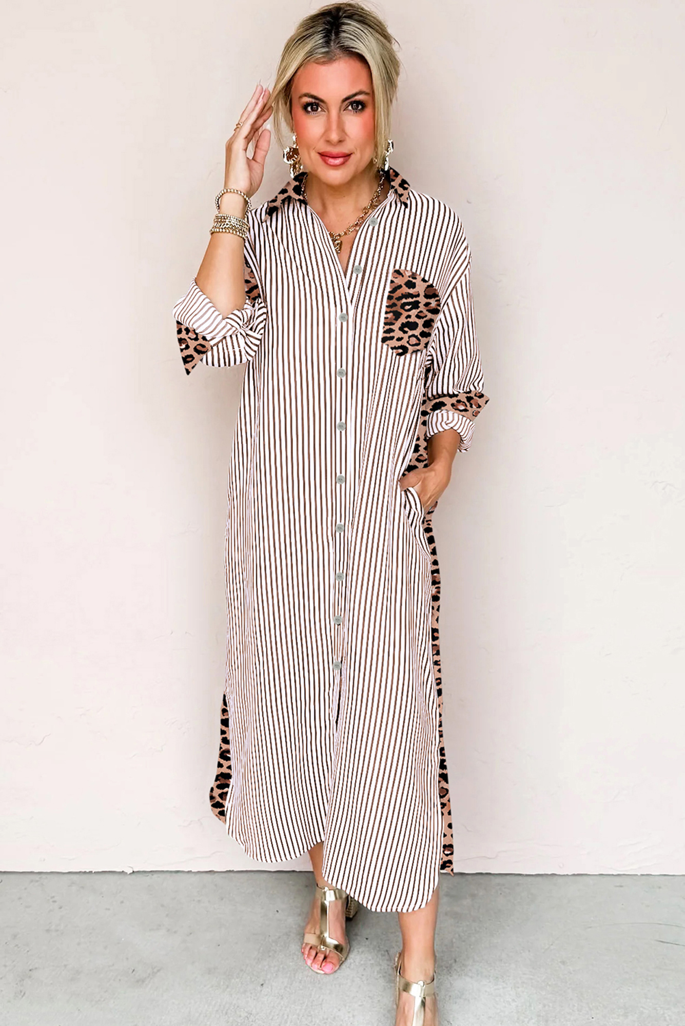 Make a bold statement in this striped and leopard print shirt dress. Featuring button-down front, roll-up sleeves, and side pockets, it blends classic and wild with ease. Perfect for chic brunches or casual strolls, this piece brings effortless confidence to every occasion. Material: 100% Polyester