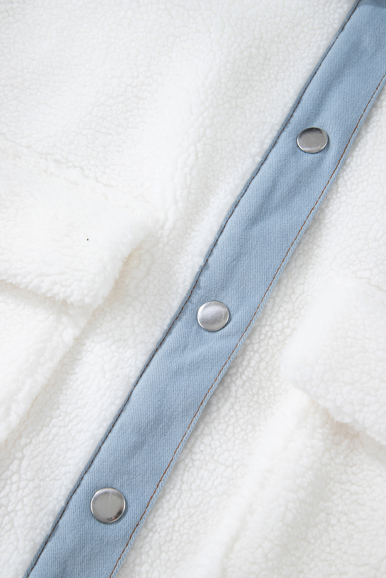 Stay effortlessly chic in the Winterlight Denim-Trim Jacket. Crafted from plush cream sherpa with soft sky-blue denim accents, this cozy layer blends casual ease with polished detail. Snap-button front and roomy pockets add function and charm — a perfect pairing for crisp, sunlit days. Material: 100%Polyester