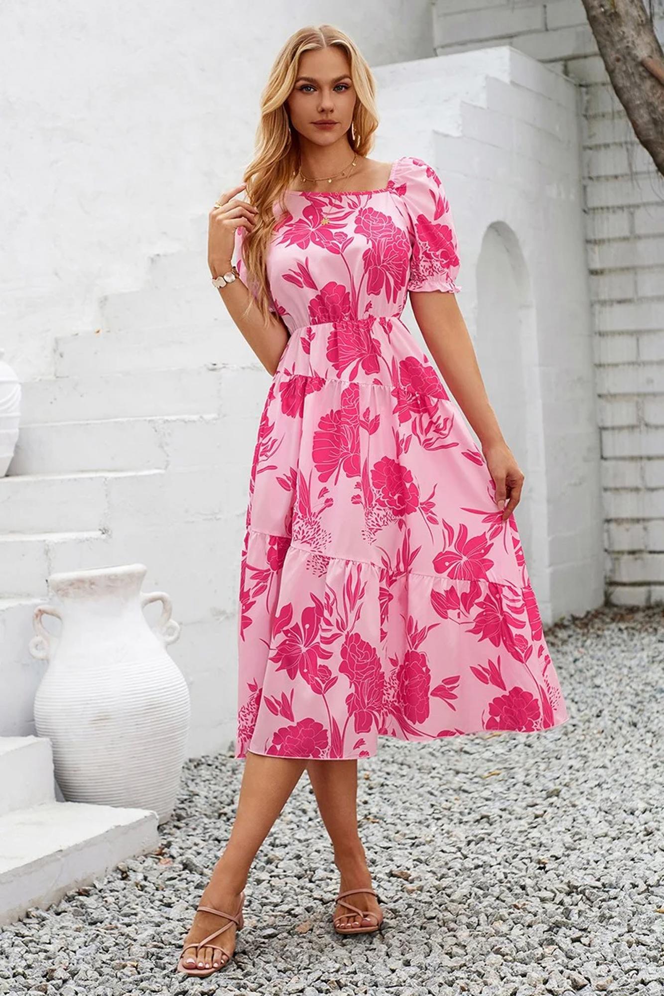 Introducing our Melody Blossoms Tiered Dress, where elegance meets charm. Featuring an asymmetrical neck and short sleeves with elastic cuffs, this dress offers both style and comfort. The elastic waist ensures a perfect fit, while the asymmetrical tiered design adds a touch of uniqueness. Crafted from monotone floral woven fabric, this midi dress boasts a relax fit, making it ideal for various occasions. Material: 100% Polyester