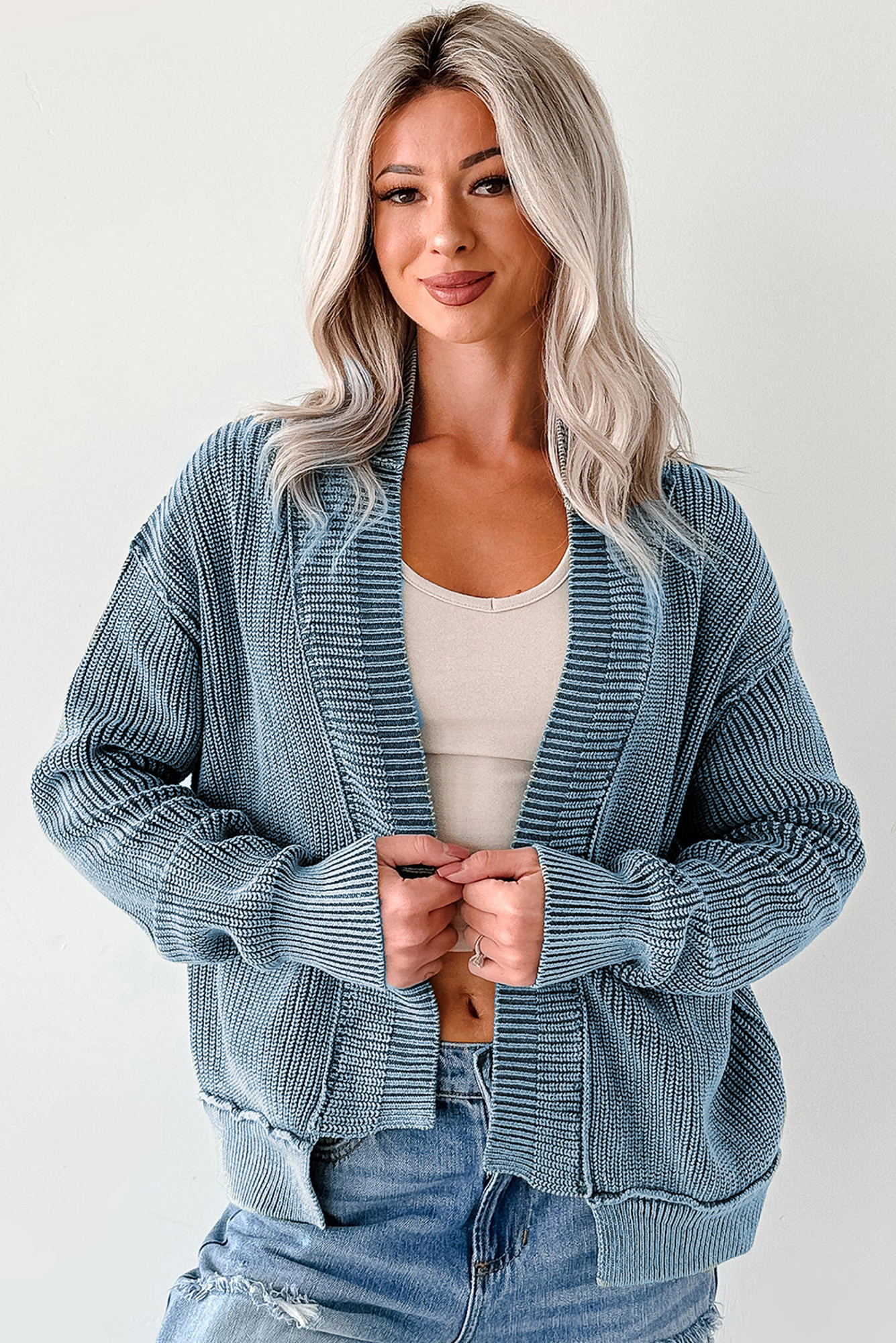 Wrap yourself in effortless coziness with the Misty Bay Chenille Cardigan. Crafted from ultra-soft ribbed knit in a washed teal tone, this relaxed open-front design features drop shoulders, front patch pockets, and comfy long sleeves�perfect for layering through every season. Material: 100% Cotton