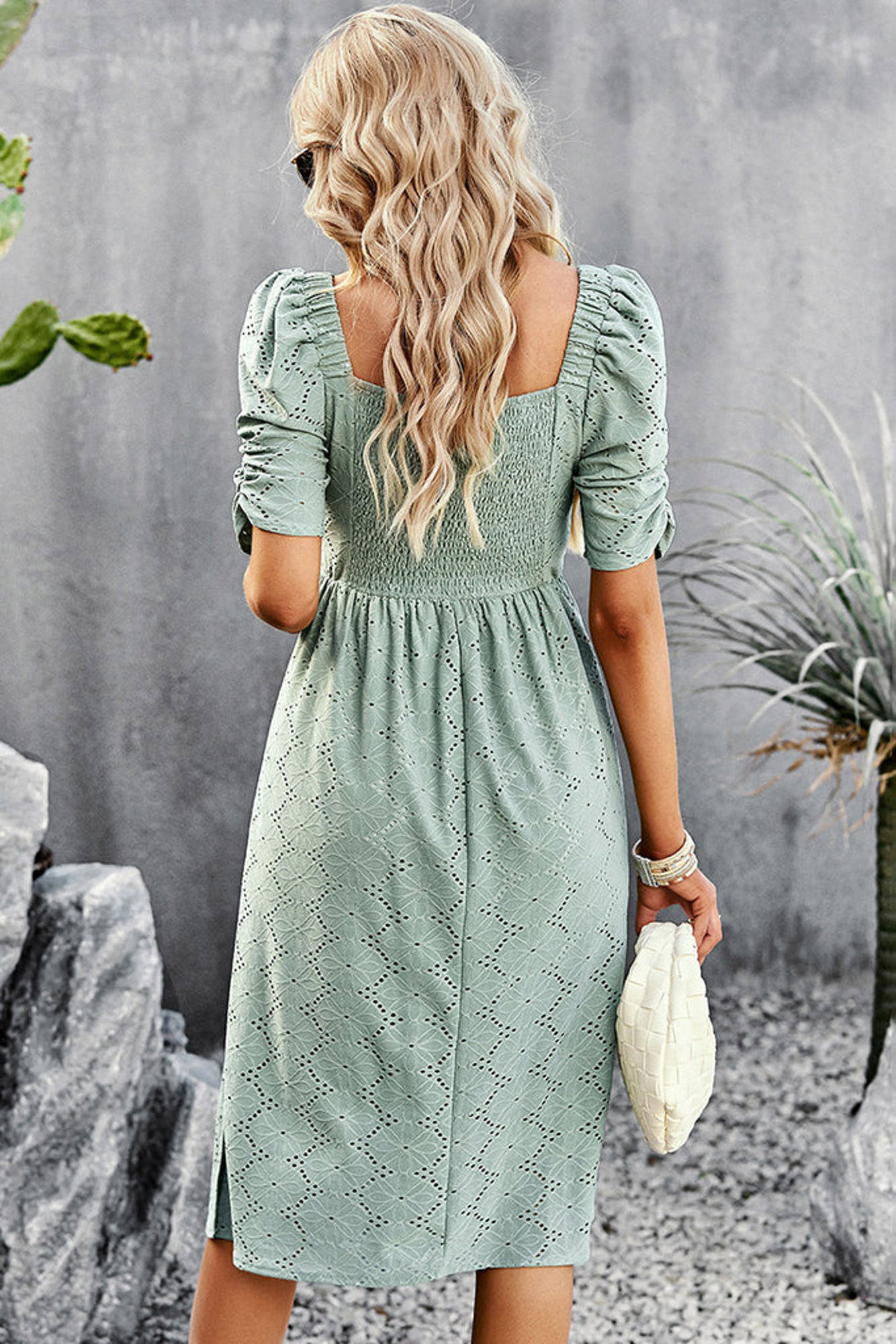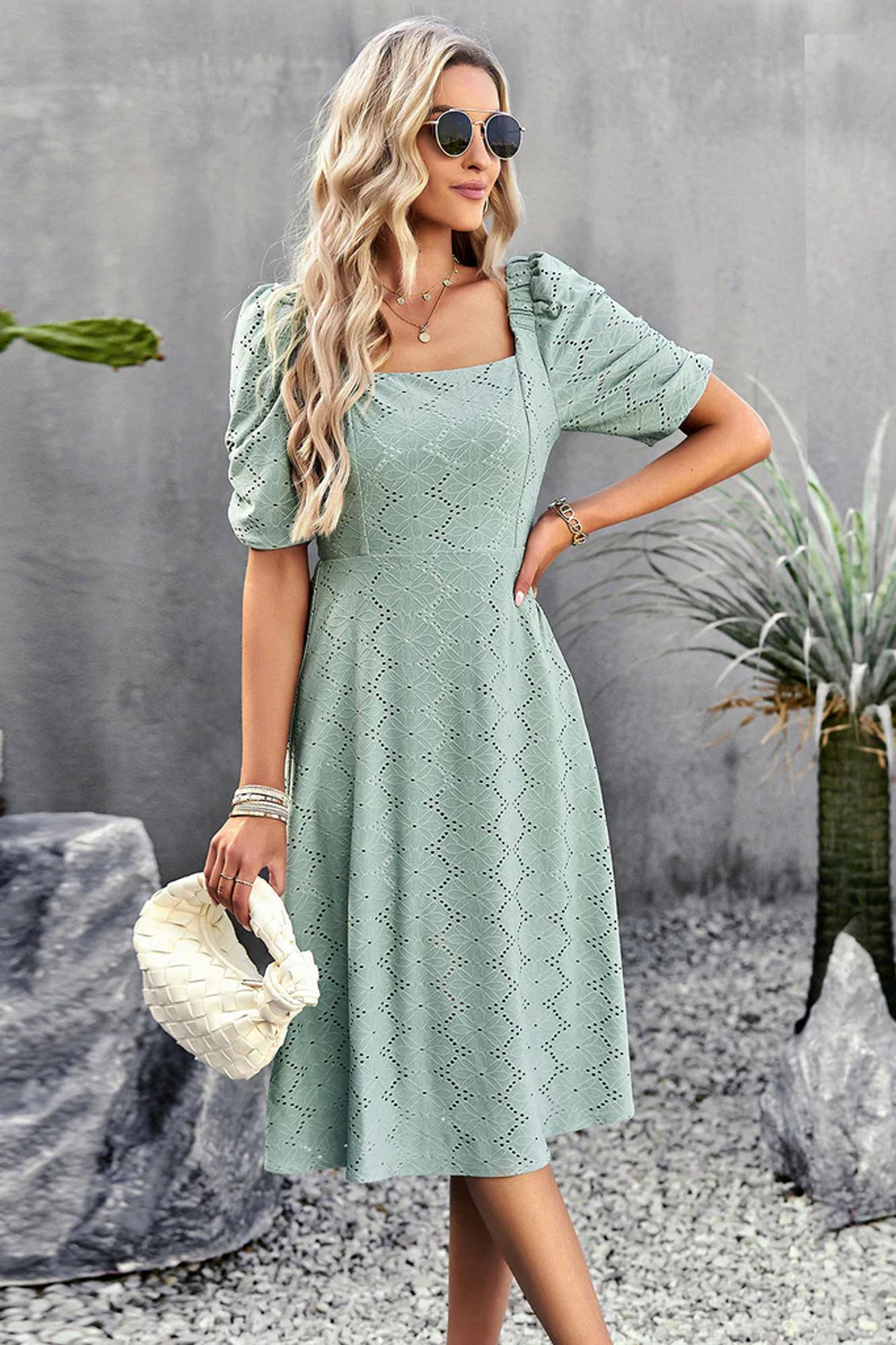 Soft, feminine, and effortlessly graceful—this sage eyelet dress features a square neckline, puff sleeves, and a flattering smocked back for comfort and shape. The breezy A-line silhouette moves beautifully, making it perfect for picnics, brunch dates, and every sweet moment in between.