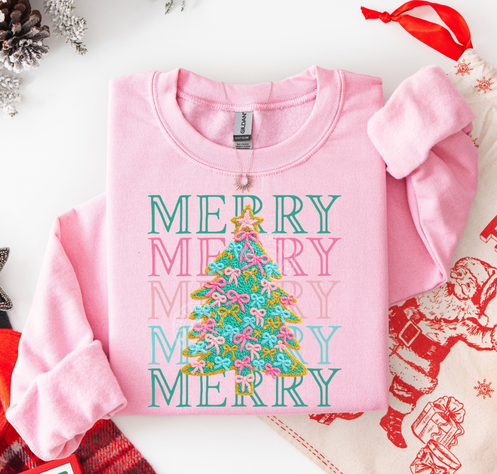 Merry Christmas Sweatshirt, Faux Yarn Christmas Tree Sweatshirt, Preppy Christmas Shirt, Coquette Christmas Tree Sweatshirt