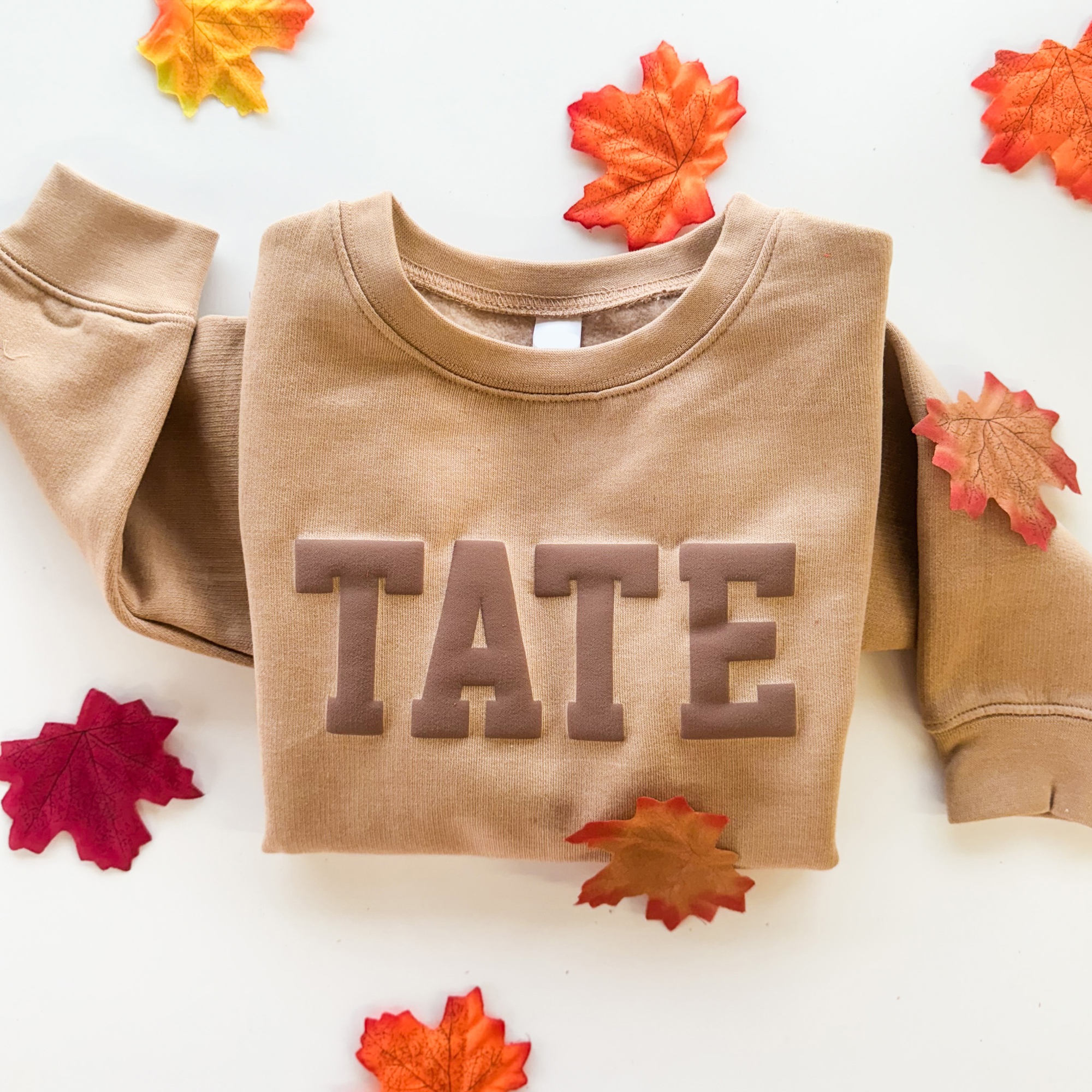 The coziest sweatshirts you'll ever buy! Each sweatshirt is customized with your child’s name in a bold puff font, perfectly matched to the sweatshirt color for a trendy monochromatic look. These are not only soft and durable, but they also make the sweetest personalized gifts for birthdays, holidays, or just because.