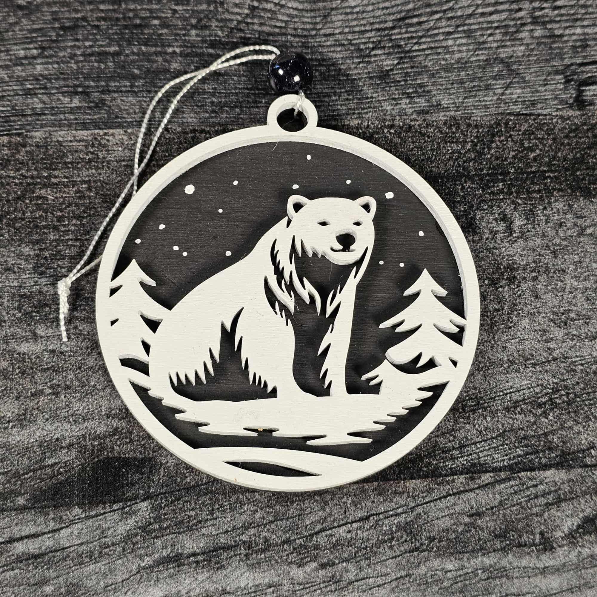 Add a touch of rustic charm to your holiday decor with our Snowy Christmas Bear Ornament. Expertly laser-cut from wood, this two-layered ornament captures the beauty of a winter forest. The top layer features an intricately designed bear surrounded by pine trees, all painted in a crisp white. Choose between a navy blue or black bottom layer, each adorned with white snowflakes, creating a stunning contrast.