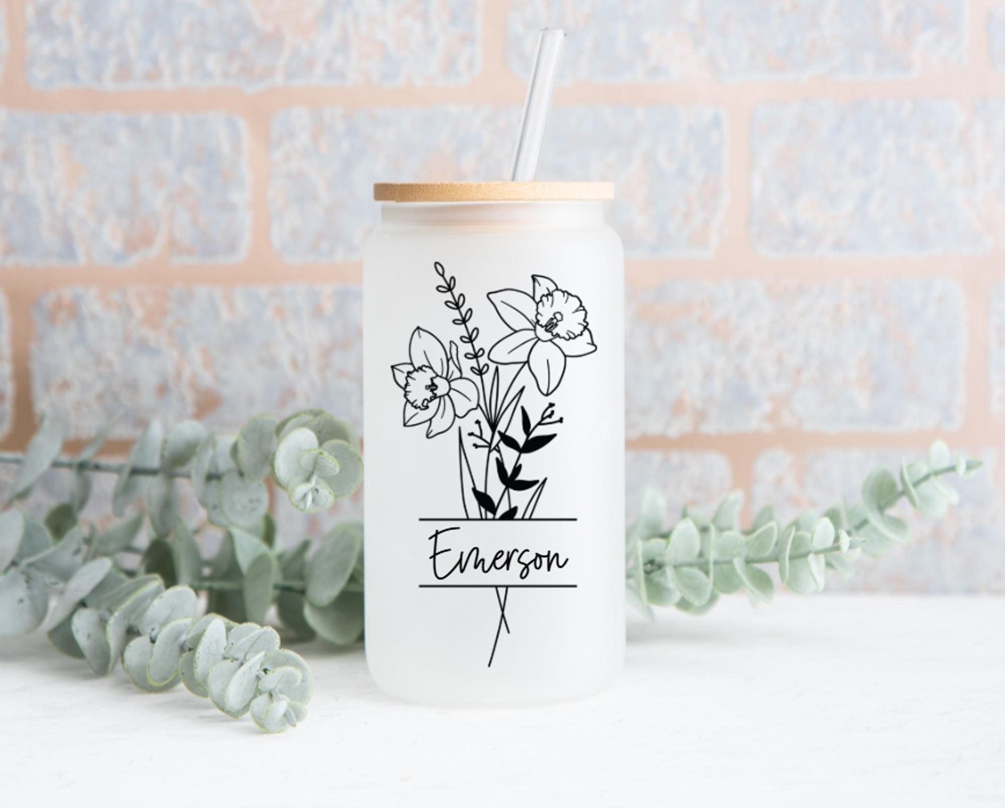 • 16oz frosted glass tumbler customized with your birth flower for a unique, botanical-inspired design