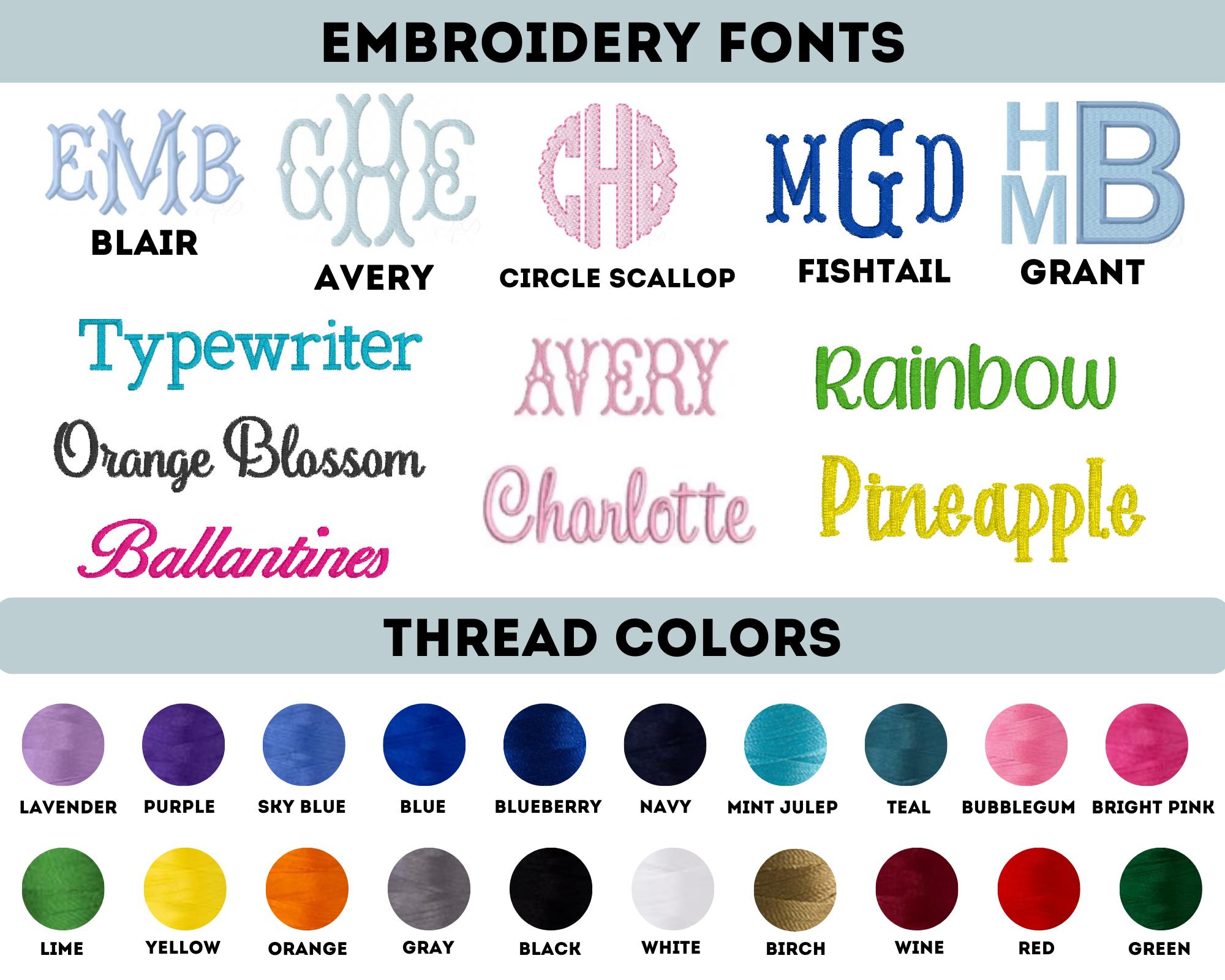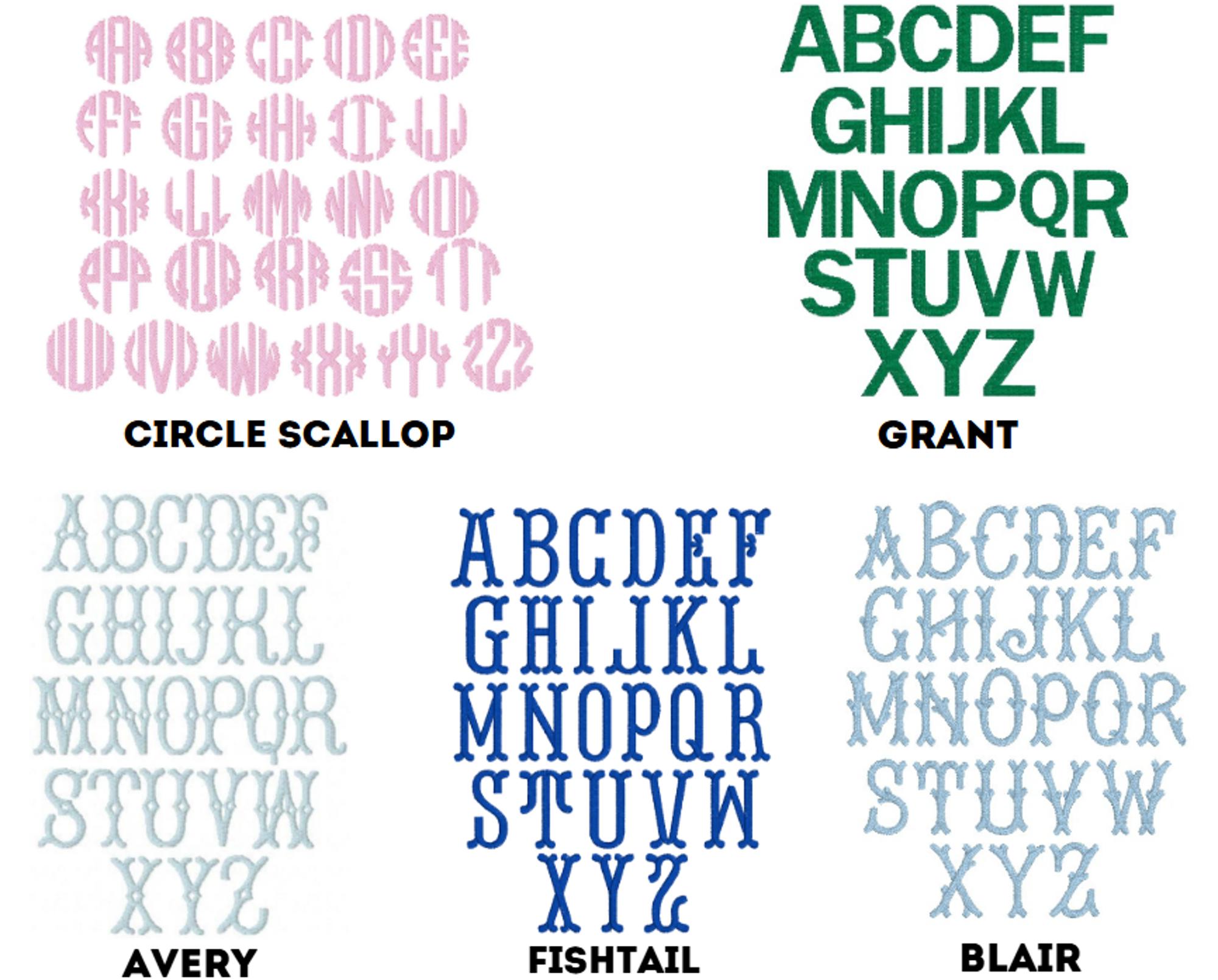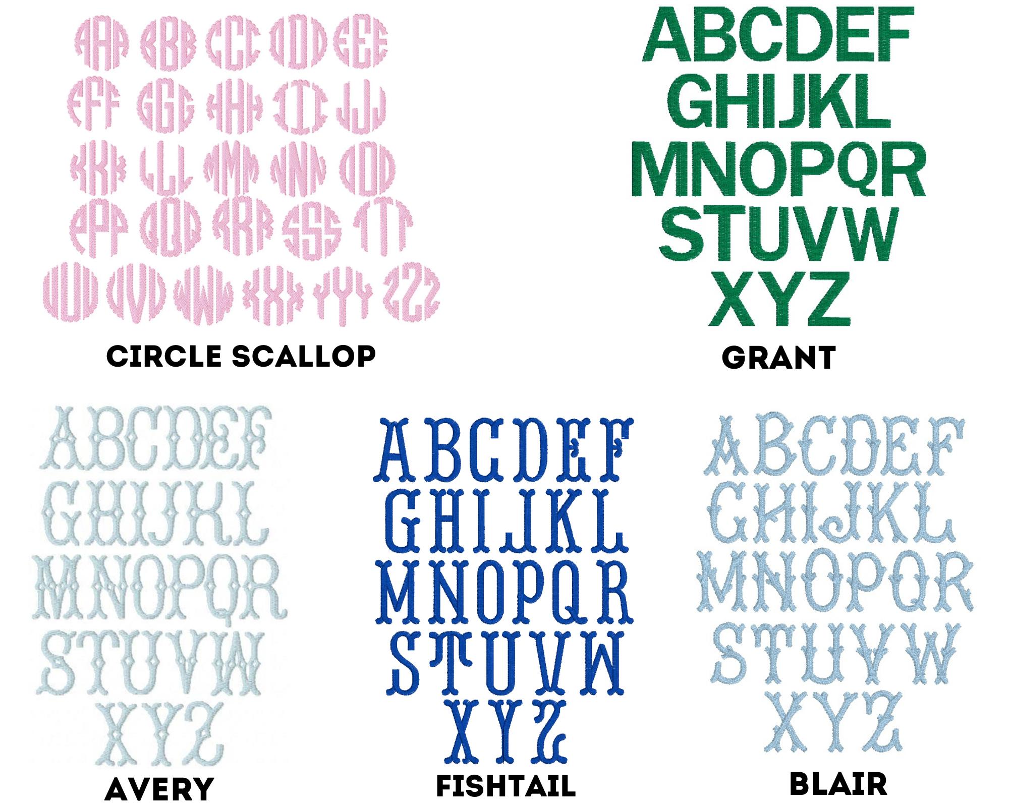 • The second initial in the monogram will be done larger than the other 2 initials for fonts Avery, Fishtail, Grant and Blair (traditional monogram is First, LAST, Middle)