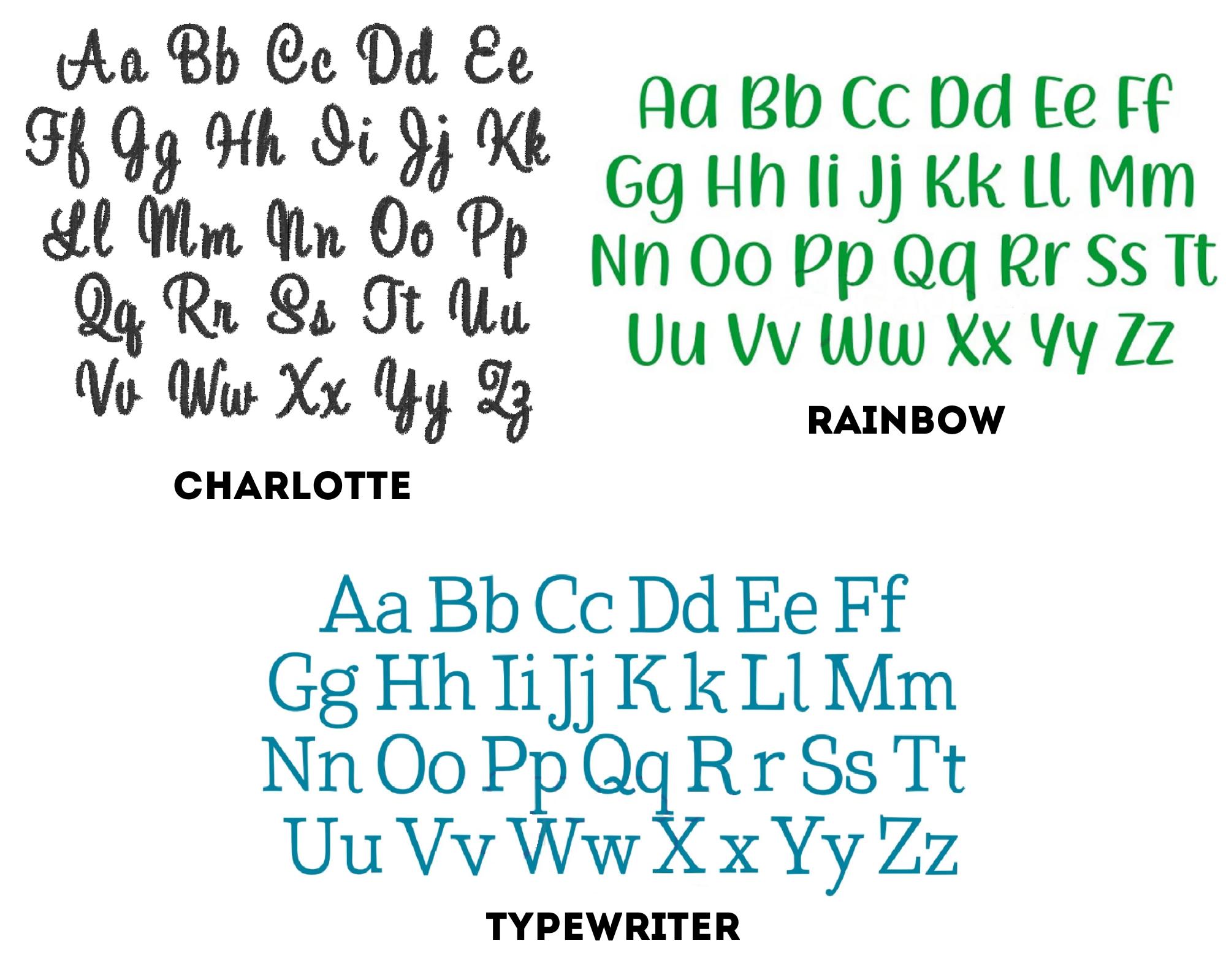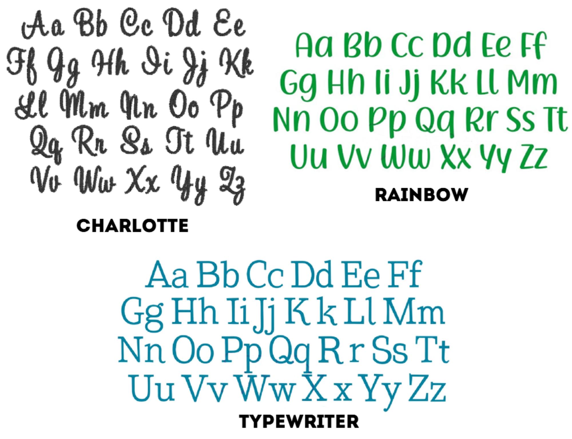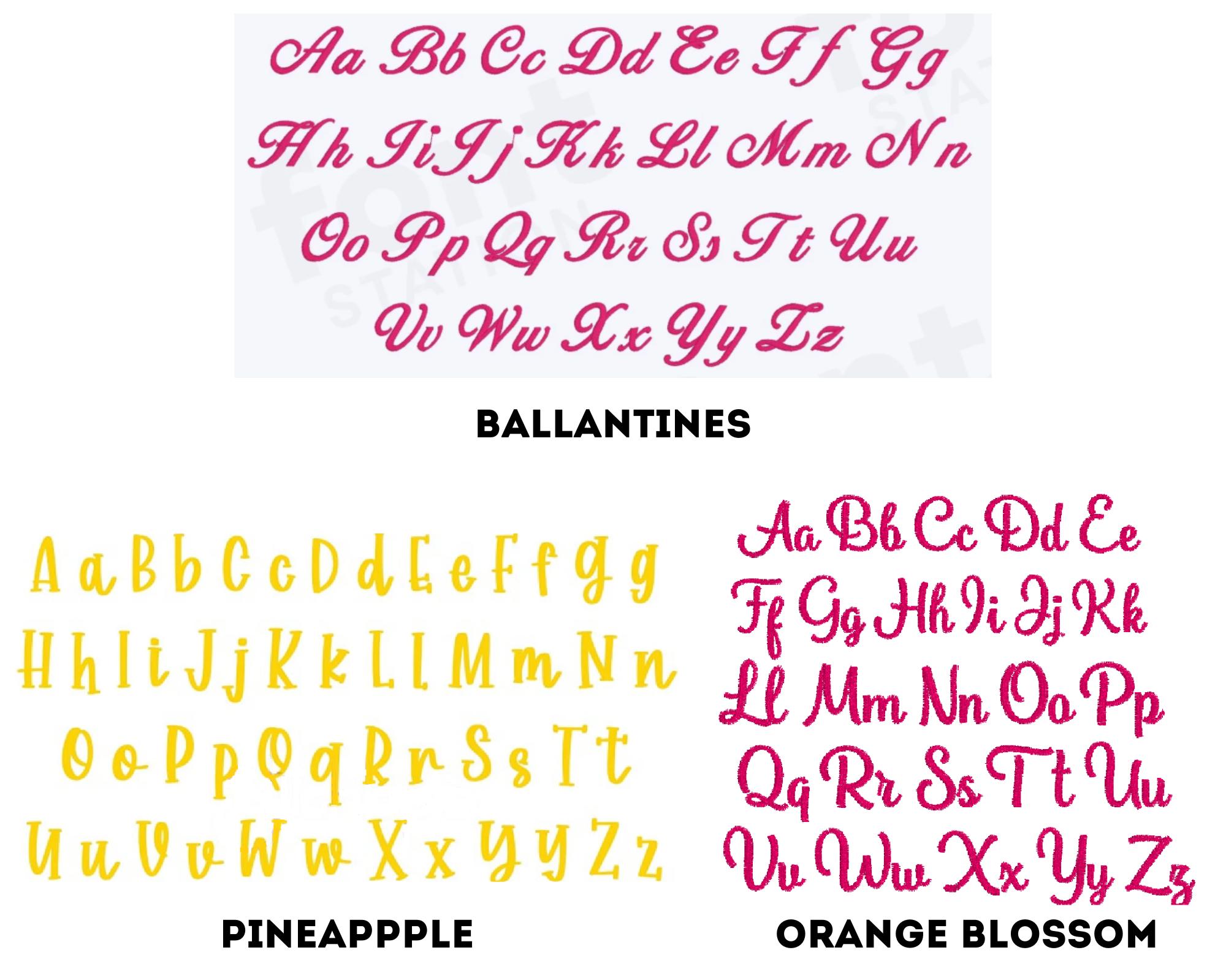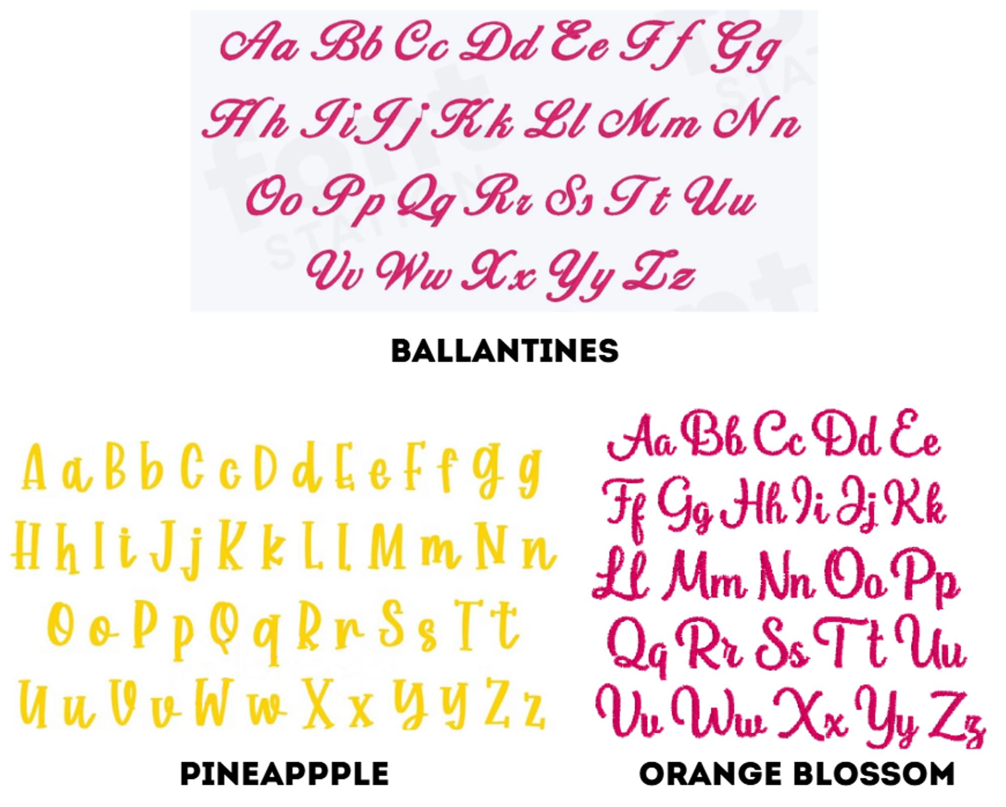 • The second initial in the monogram will be done larger than the other 2 initials for fonts Avery, Fishtail, Grant and Blair (traditional monogram is First, LAST, Middle)