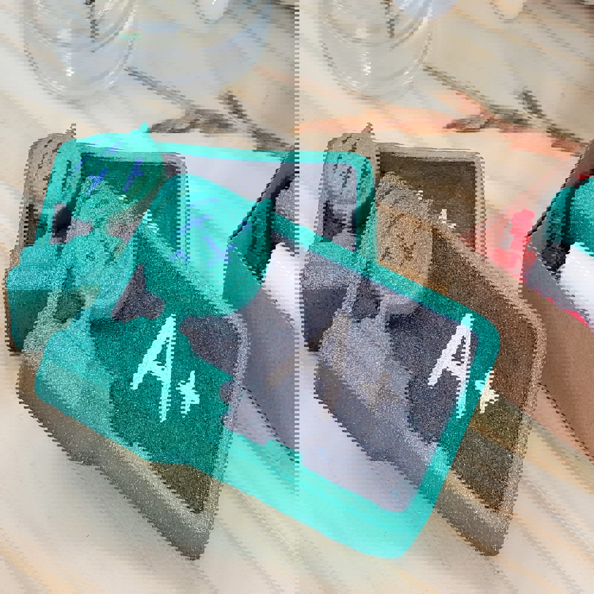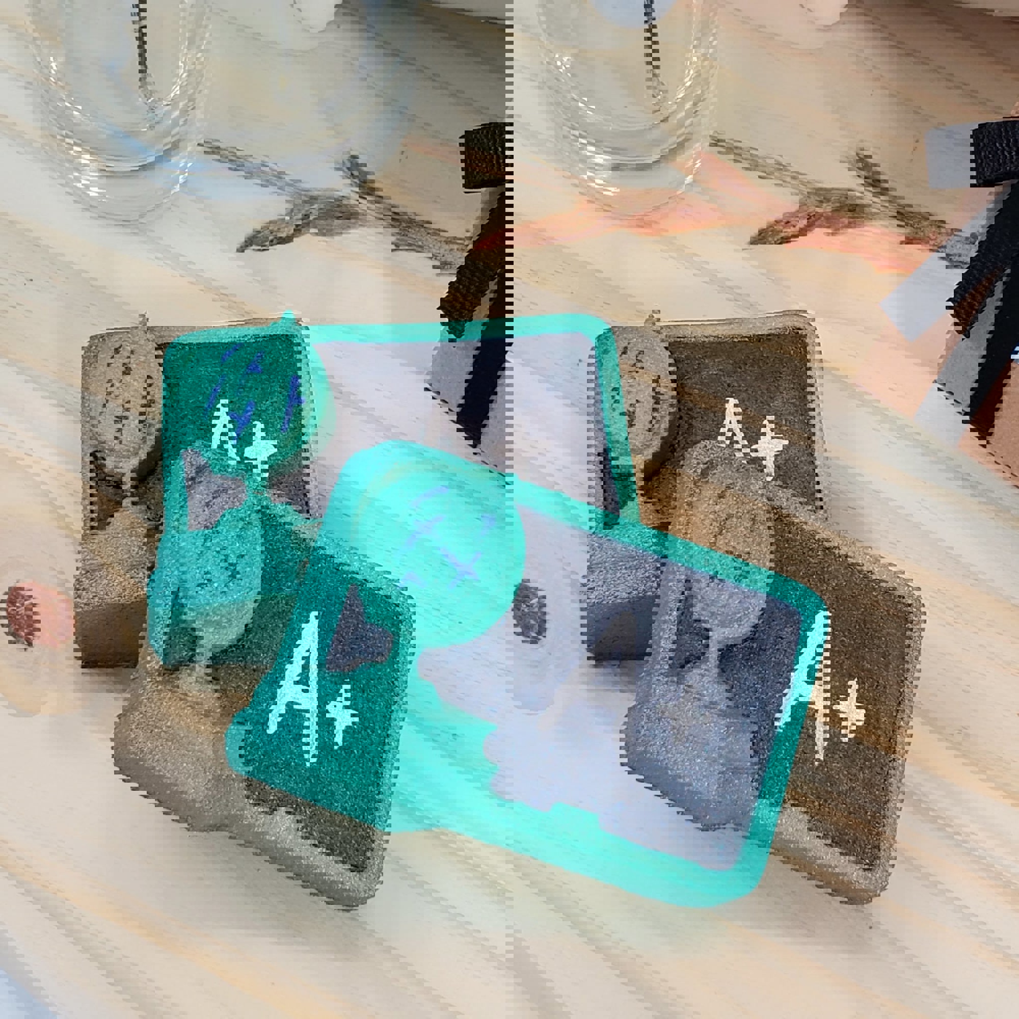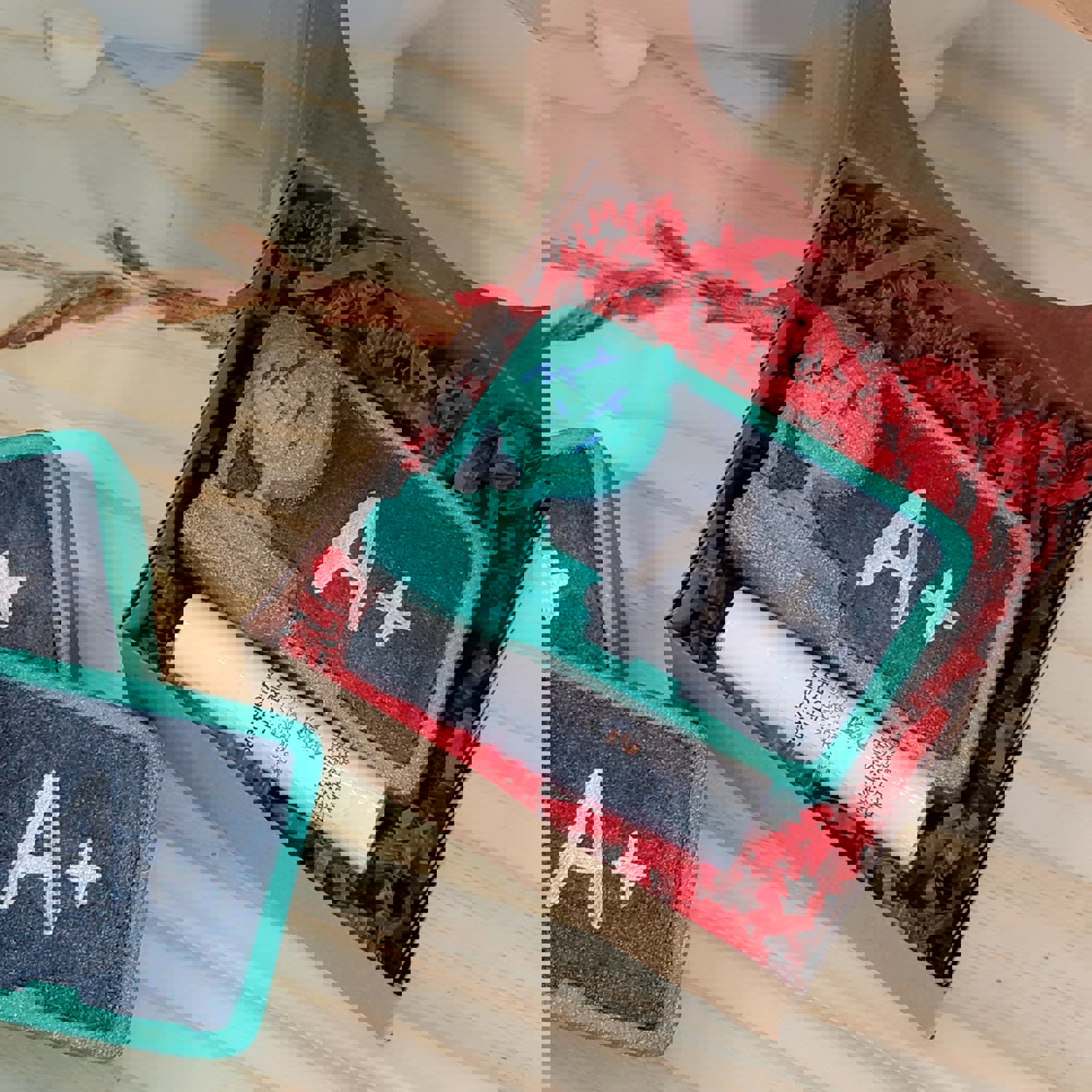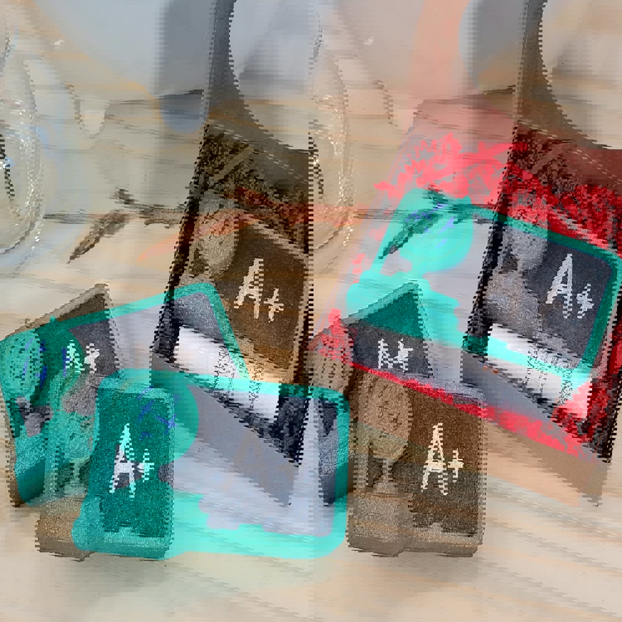 CHALKBOARDS are a green bath bomb base color, that is then airbrushed to add in the green highlights for some depth. Then hand painted black for the chalkboard effect and a hand painted "A+".